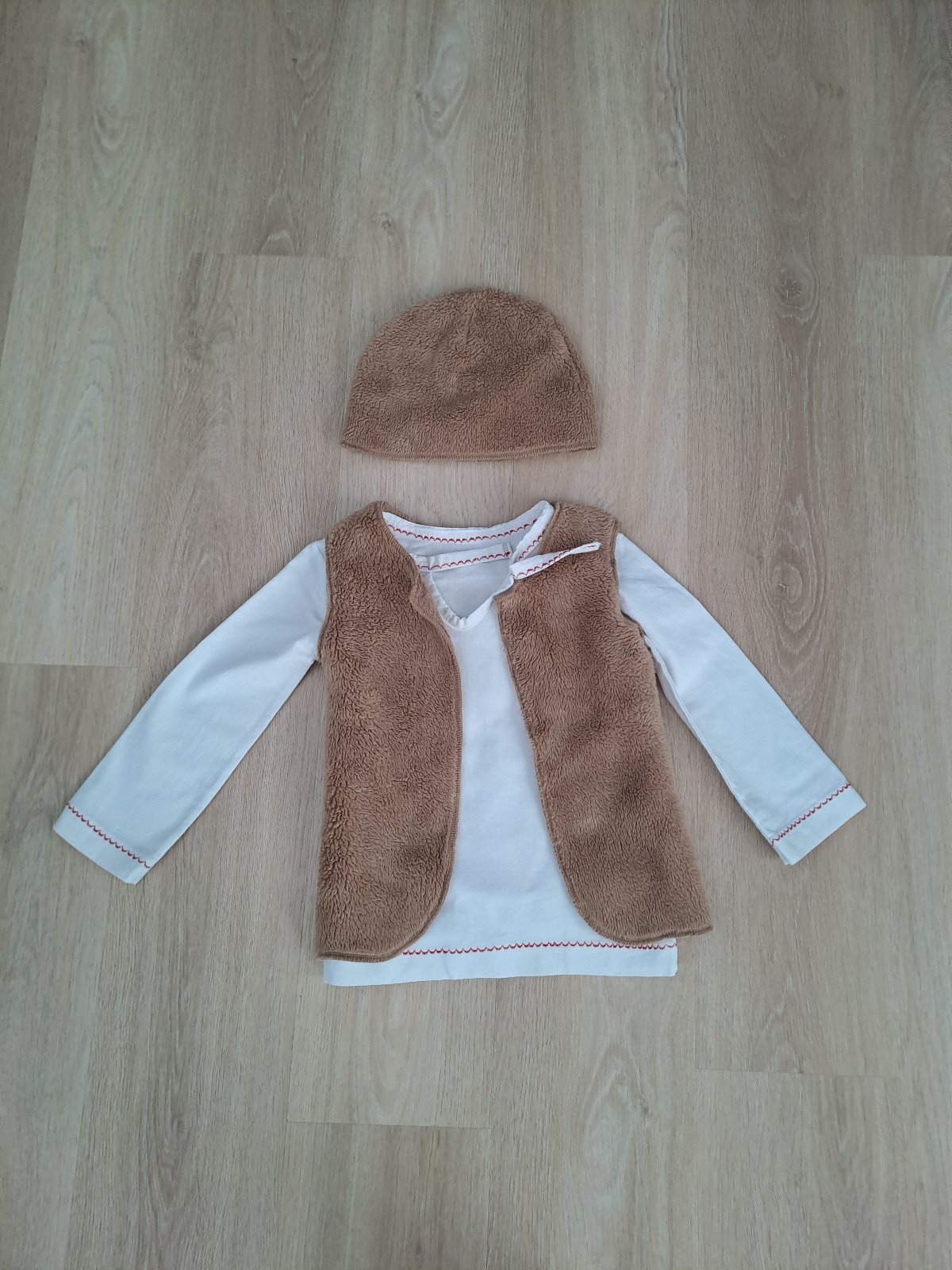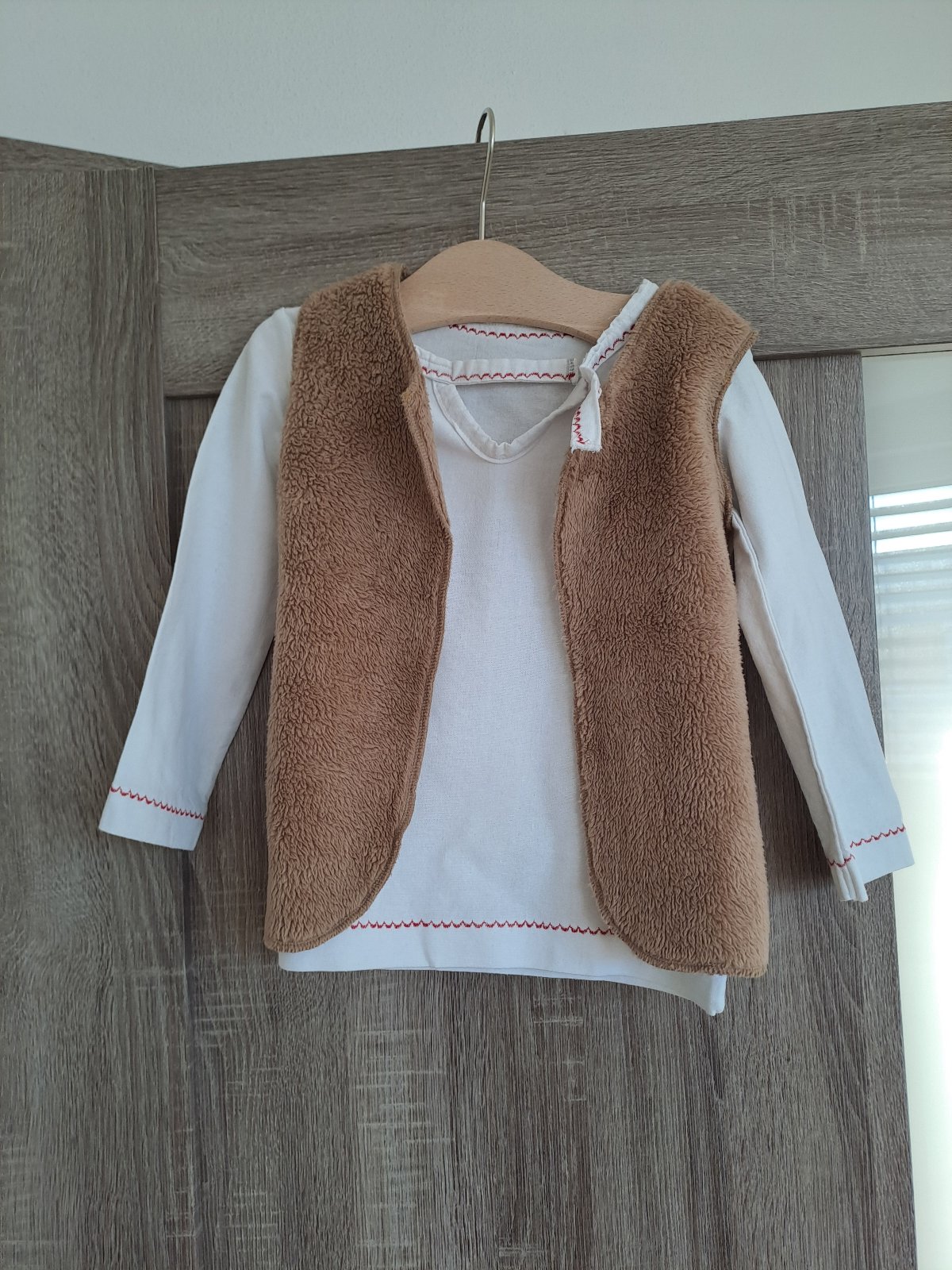 Milý, jednoduchý kostým pastiera pre deti vo veku 4-6 rokov. Šila som ho ja sama na profi strojoch. Je to ľanová košeľa s výšivkou, chlpatá vesta a čiapka. Stačí ku tomu obliecť tepláky alebo rifle.