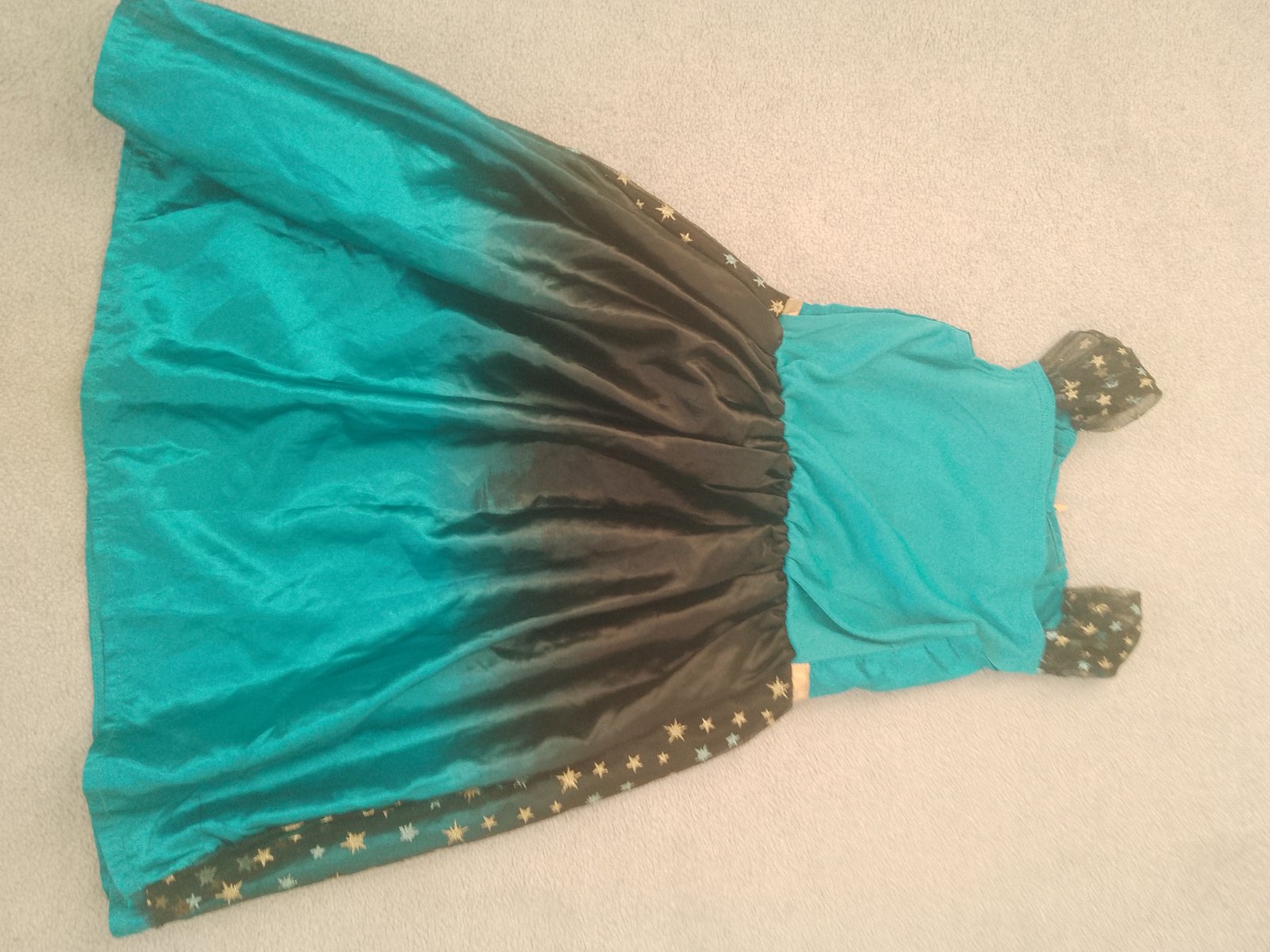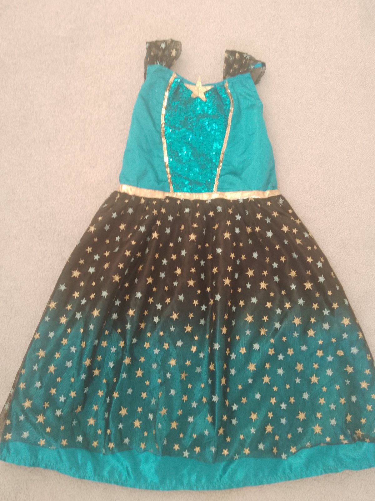 Krásny kostým, farba je ako na hlavnej fotke, tie ostatne su robene v iny den, bolo ine svetlo, ale farba je tyrkysova ako na prvej fotke. Dcera isla na karneval ako "Hviezdna obloha" ale urcite sa da vymysliet aj ina tema 🙂