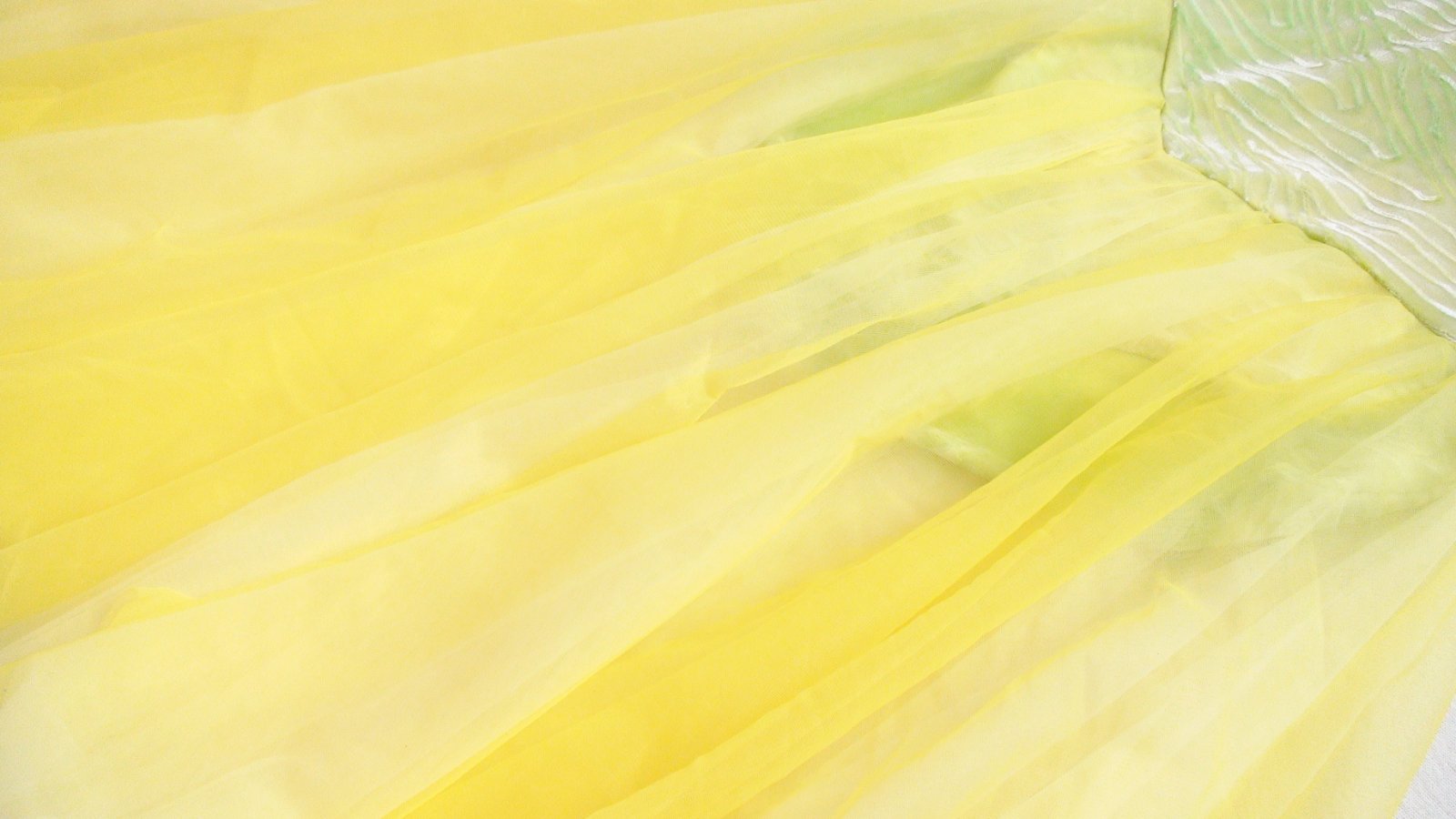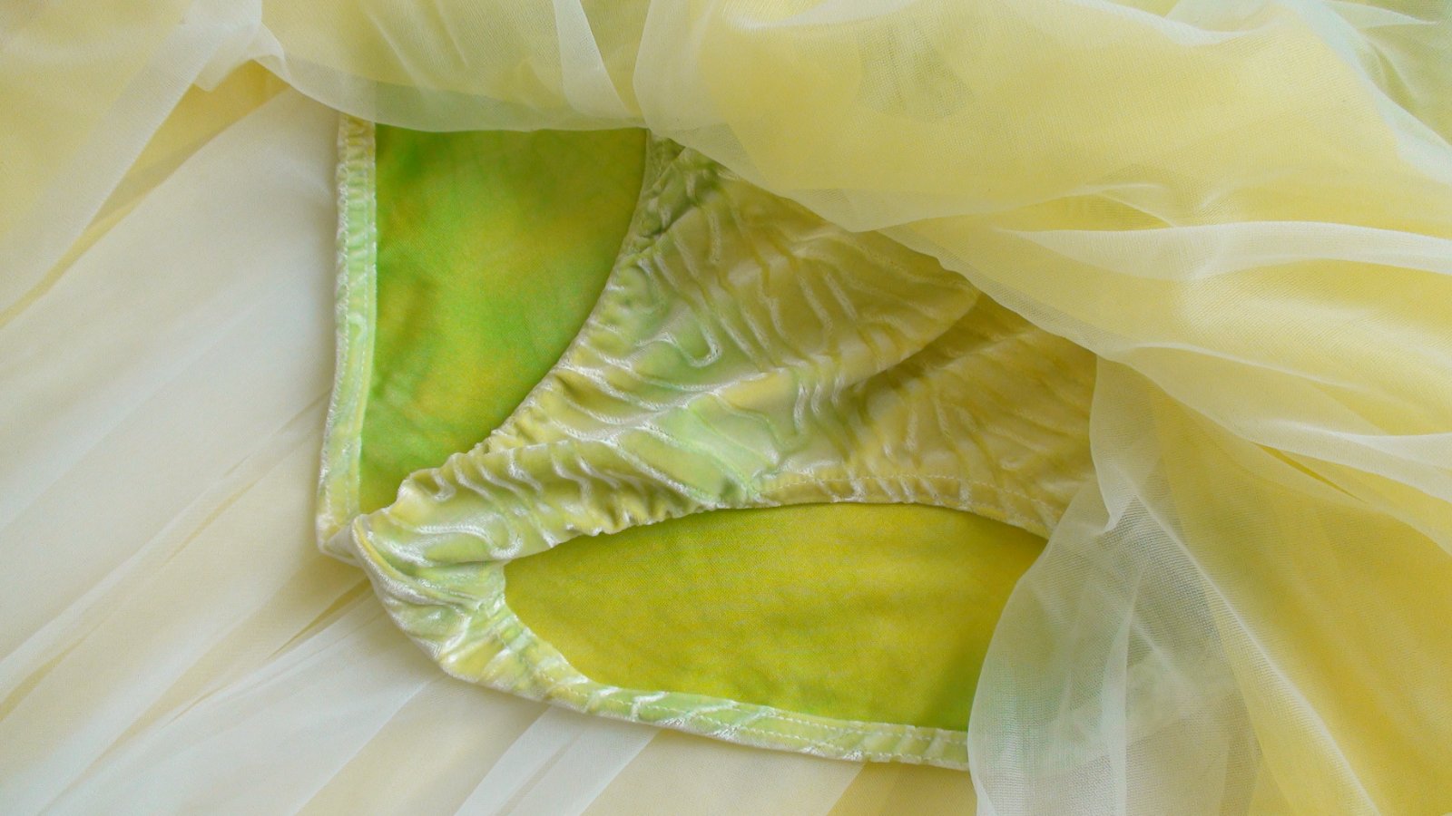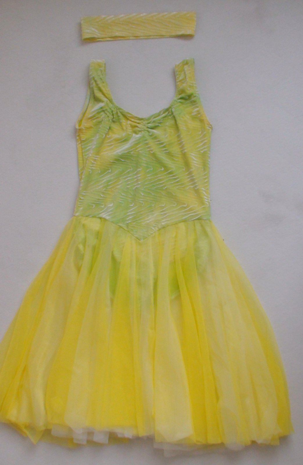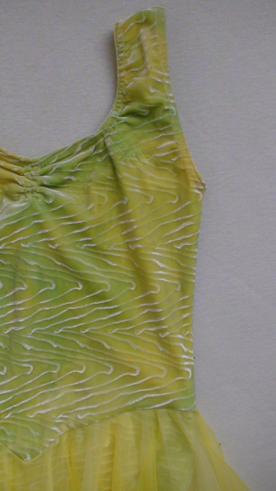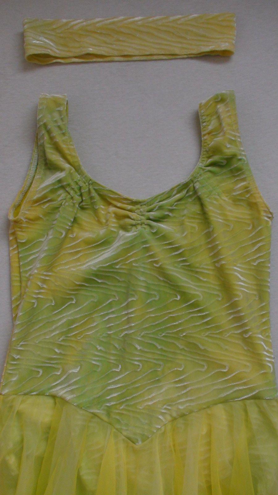 Stav: top stav, bez poškodení a známok nosenia. Originál tanečné baletné šaty ukončené na spôsob body a dvojvrstvovou farebnou sukničkou. Body zamatové so zaujímavom vzorom v látke, na svetle hrajú farbami od neonovo žltej po zelenú. Parádne + čelenka k šatám z rovnakej látky.