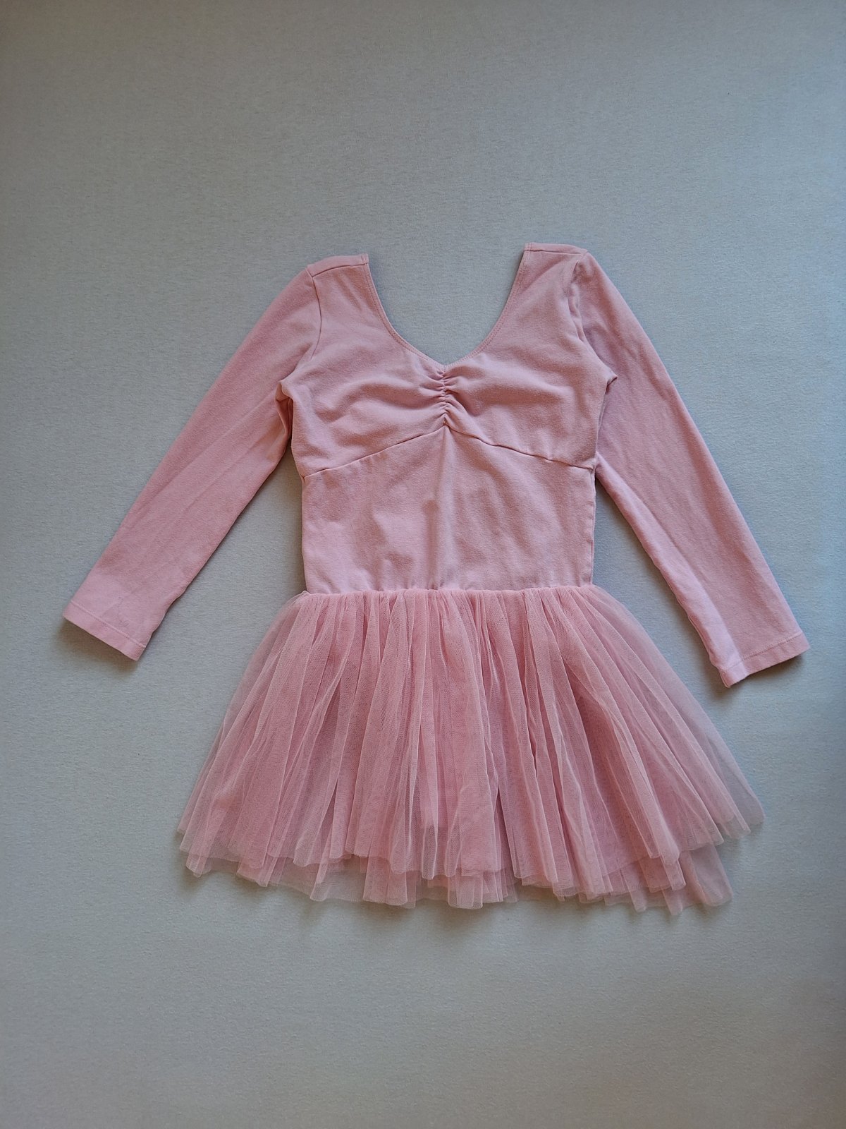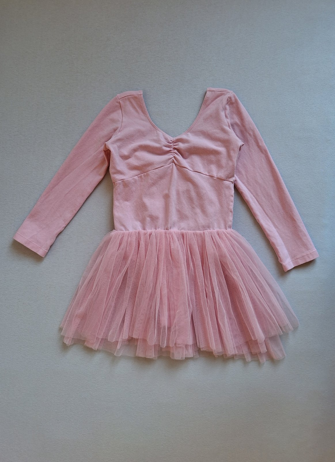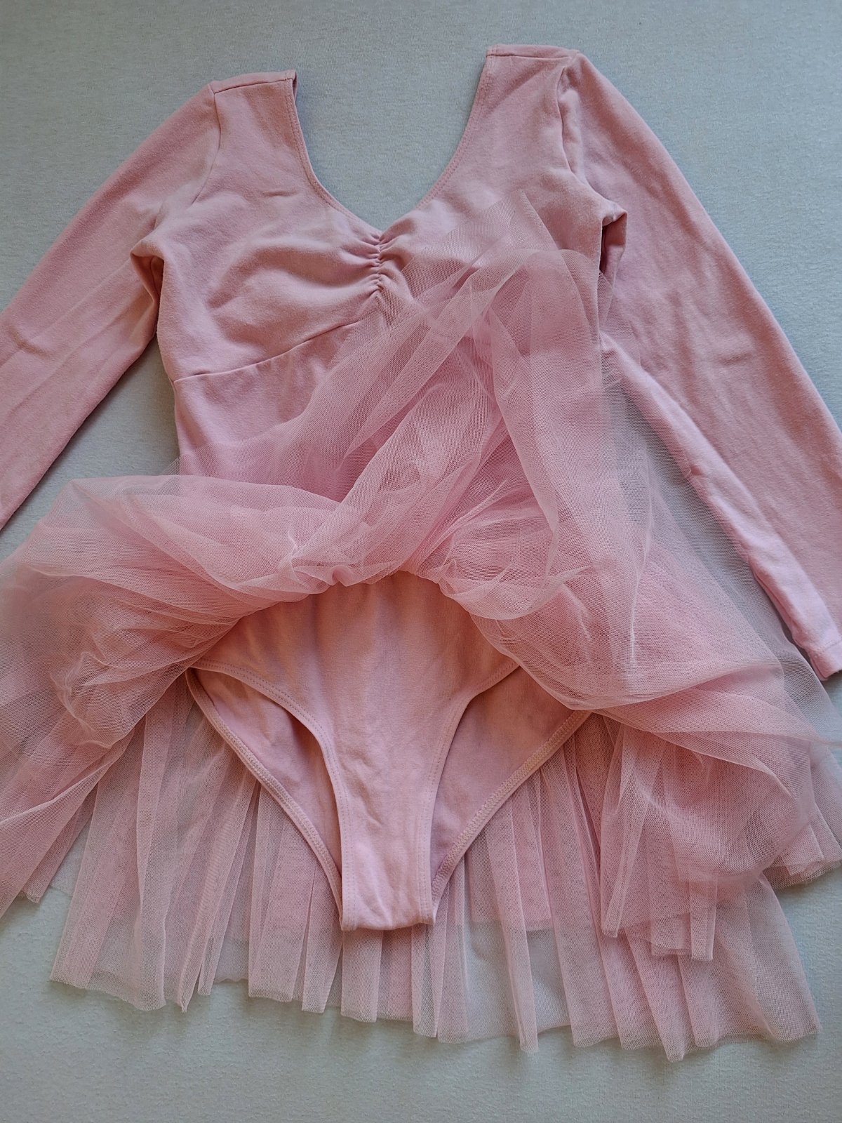 Vhodné ako kostým baletky, tanečnice aj ako dres na tanečnú. Príjemné bavlnené elastické šaty na štýl body (dresu )s bohato nazberanou 3 vrstvovou tylovou sukničkou. Nádherné, bez poškodení, len jemný chĺpok z prania.