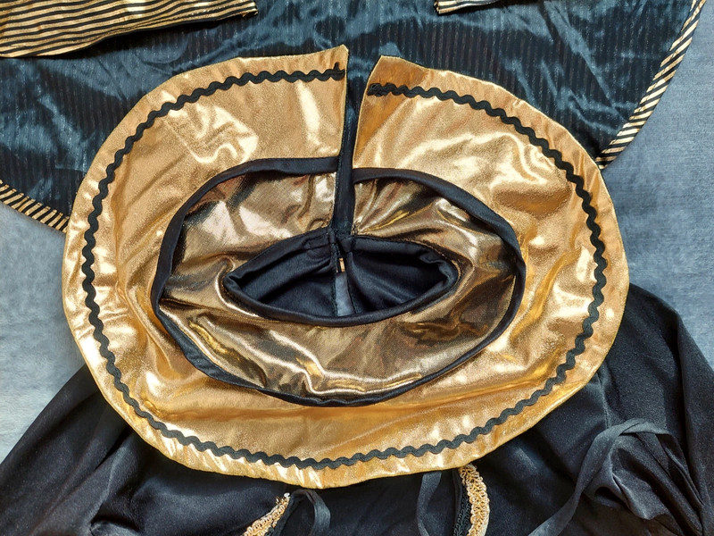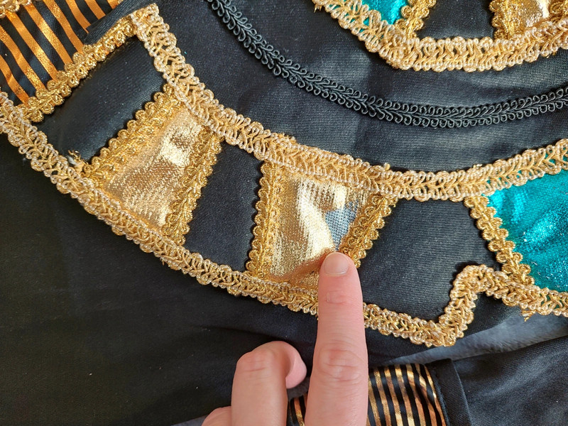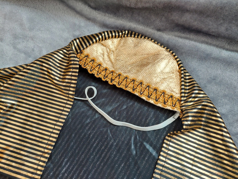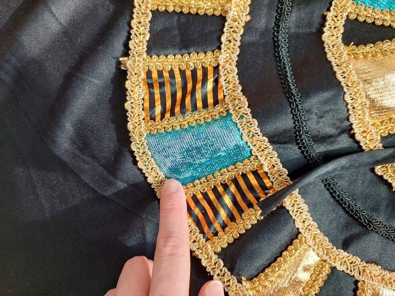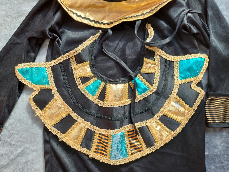 Stav: pekný stav (chybičky pofotené) - 1xpoužitý na karnevale, no na prednom spodku tuniky sa začali púšťať očká (čo je pri týchto kostýmoch bežné) + na zlatom diadéme je na dvoch kockách mierne zošúchaná farba. Inak krásny komplet kostým - dlhá tunika + diadém + faraonska pokrývka hlavy.