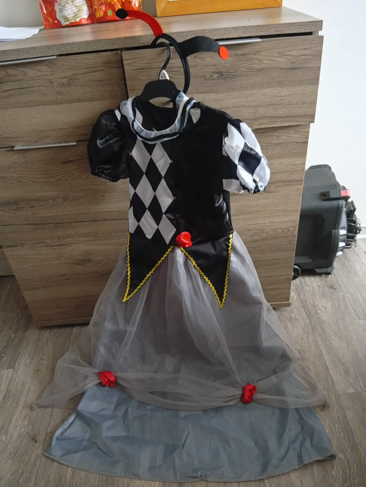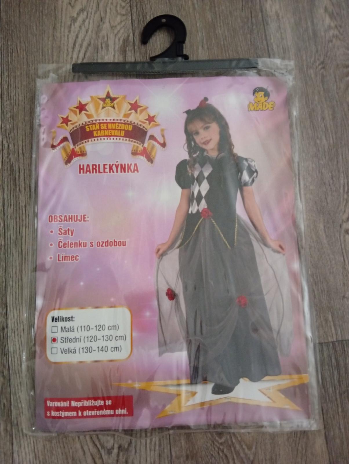 Ponúkam na predaj kostým na karneval - HARLEKÝNKA. Obsahuje: šaty, límec a čelenku s ozdobou. Veľkosť je 120 - 130 cm.