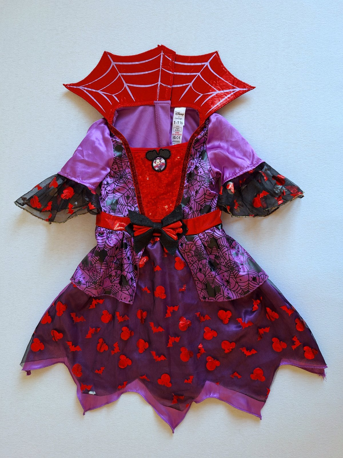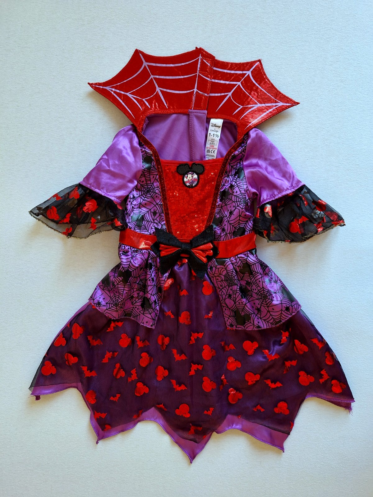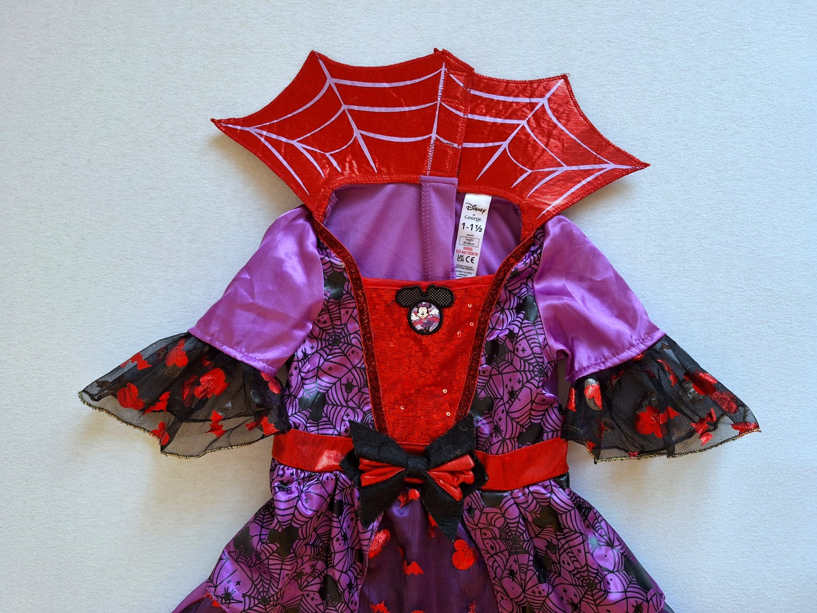 Nádherné luxusné šaty Minnie od Disneyho sú v top stave bez poškodení a známok nosenia. Pevný stojatý golier s pavučinovým motívom, živôtik vpredu zdobený flitrami. Celé sú zdobené netopiermi a pavučinami. Suknička je bohato riasená, 3-vrstvová.