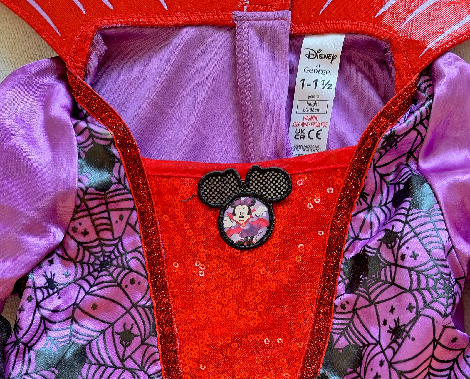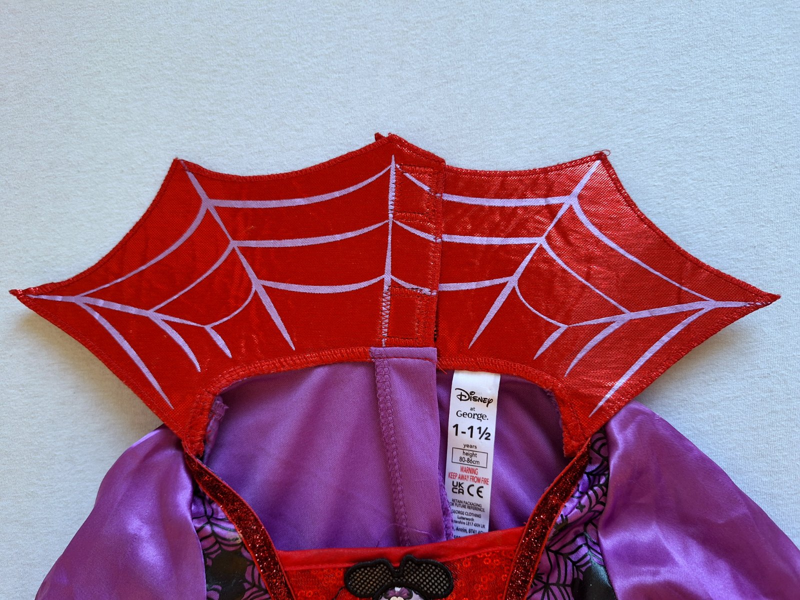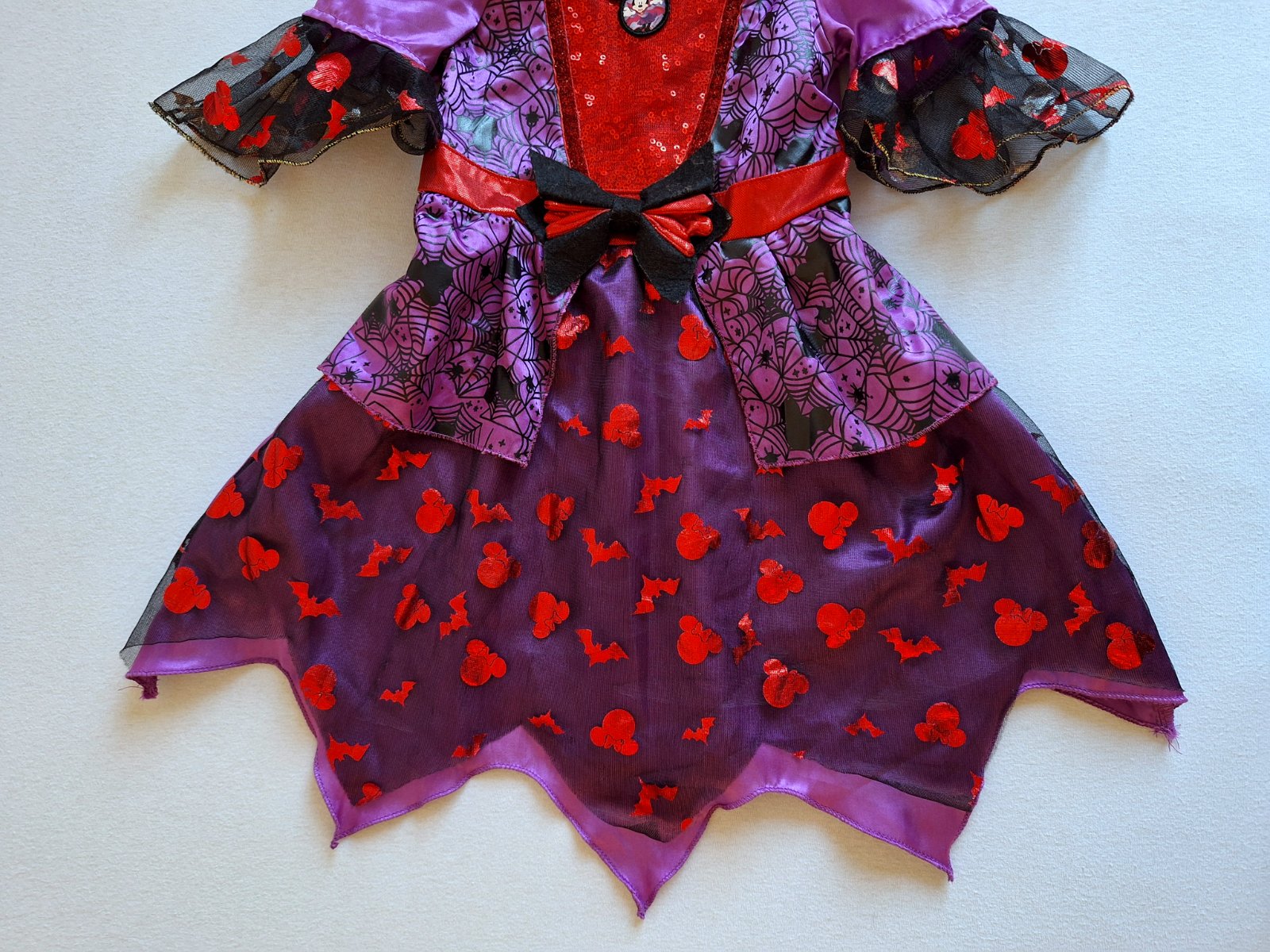 Nádherné luxusné šaty Minnie od Disneyho sú v top stave bez poškodení a známok nosenia. Pevný stojatý golier s pavučinovým motívom, živôtik vpredu zdobený flitrami. Celé sú zdobené netopiermi a pavučinami. Suknička je bohato riasená, 3-vrstvová.