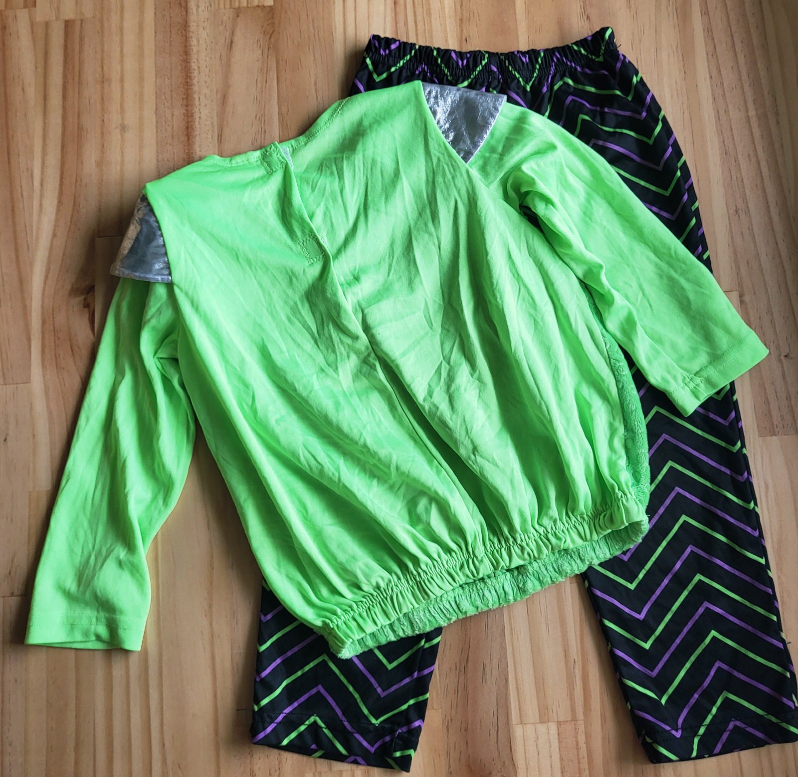super stav, vrchný diel je na tele z prednej časti z mäkučkého zamatu, rukávy a zadná časť + nohavice z polyesteru, hrudná časť čo je v striebornej farbe je mierne vypolstrovaná, pošlem buď poštou alebo packetou