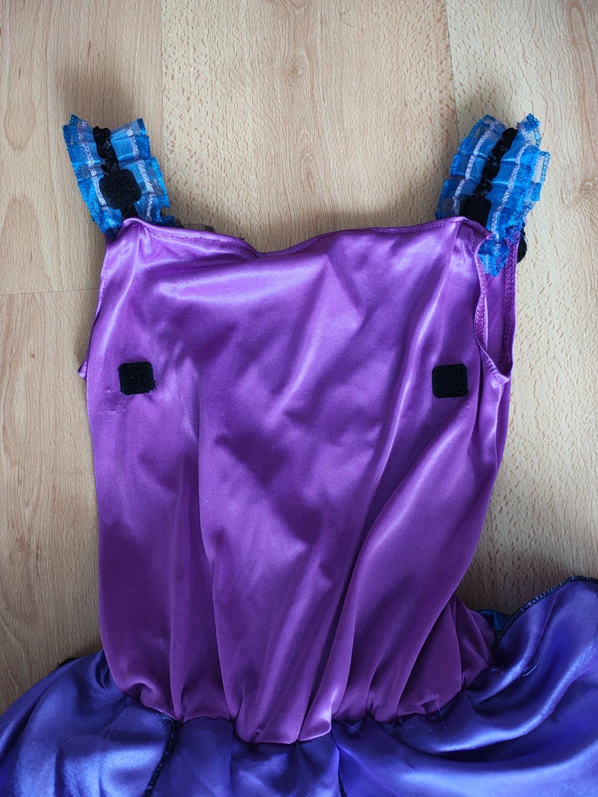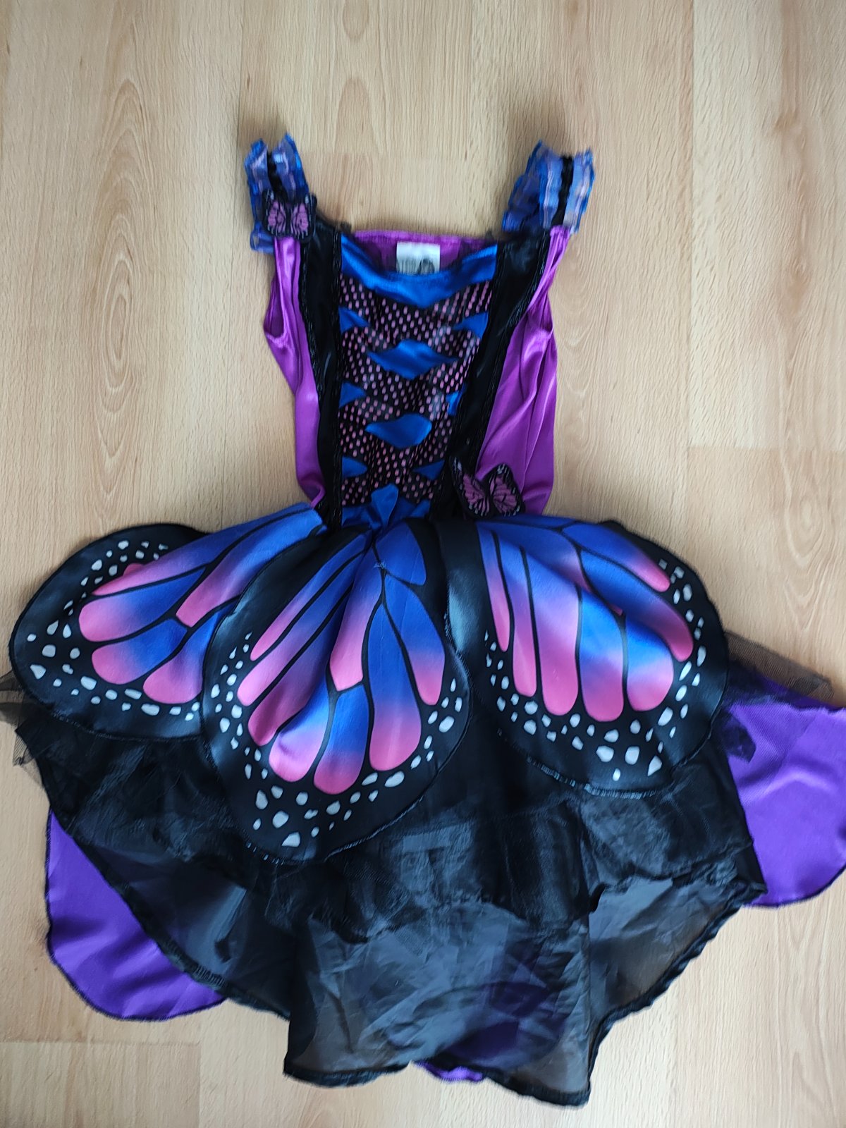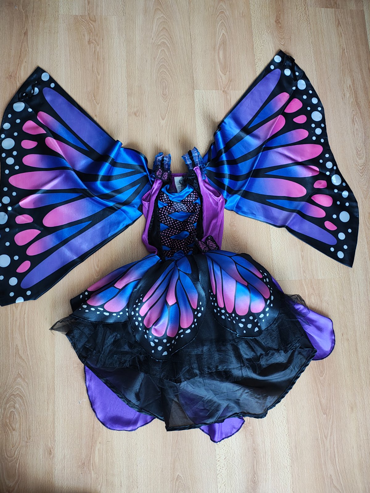 Krásny kostým motýľa, dcéra ho mala ako predškoláčka. Veľkosť je písaná 128, reálne sedia 116-122. Krídla sa pripevnia na ramienka a chrbát šiat suchým zipsom a gumičkou na palec dieťaťa. Šaty majú spodničku z pevnej látky (viď predposlednú fotku), preto šaty krásne stoja. Na spodničke je čierna sukňa, čierny tyl a na vrchu farebné kusy látky.
