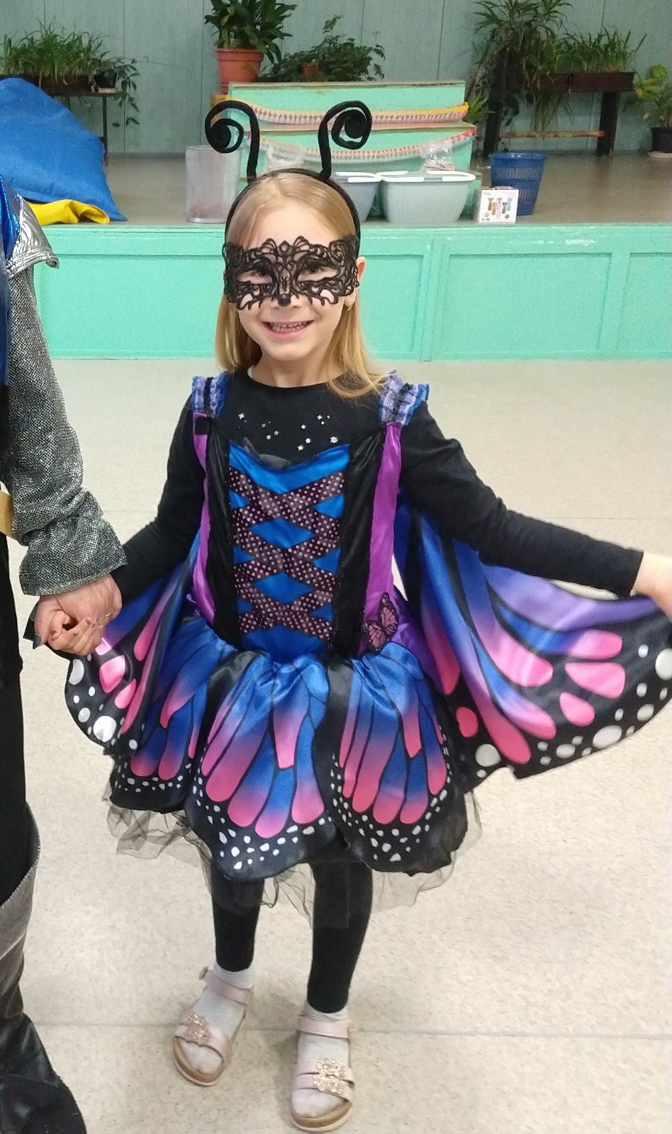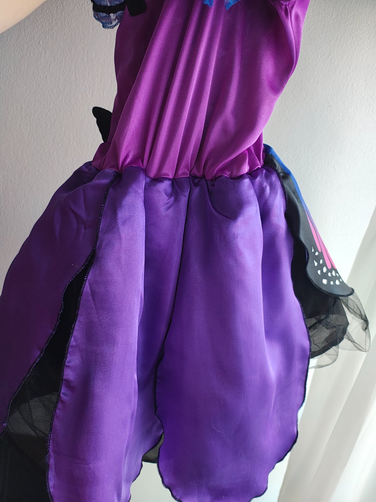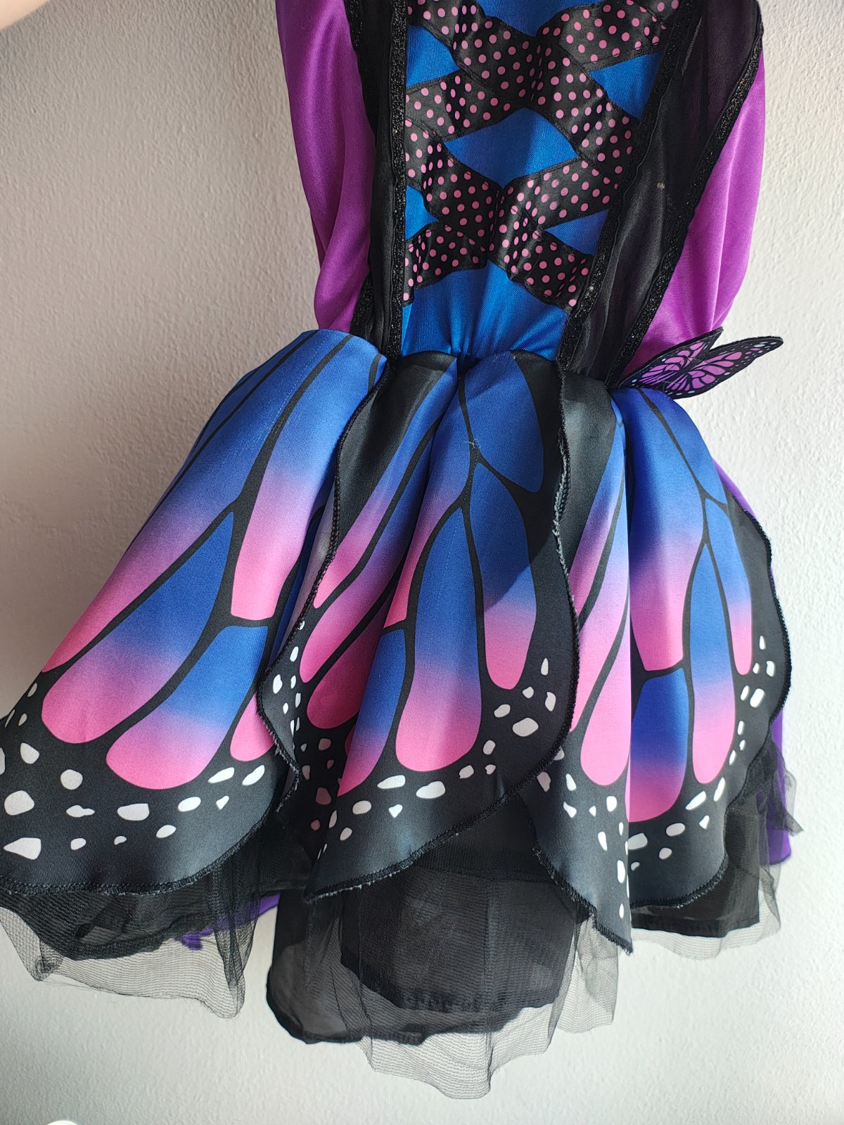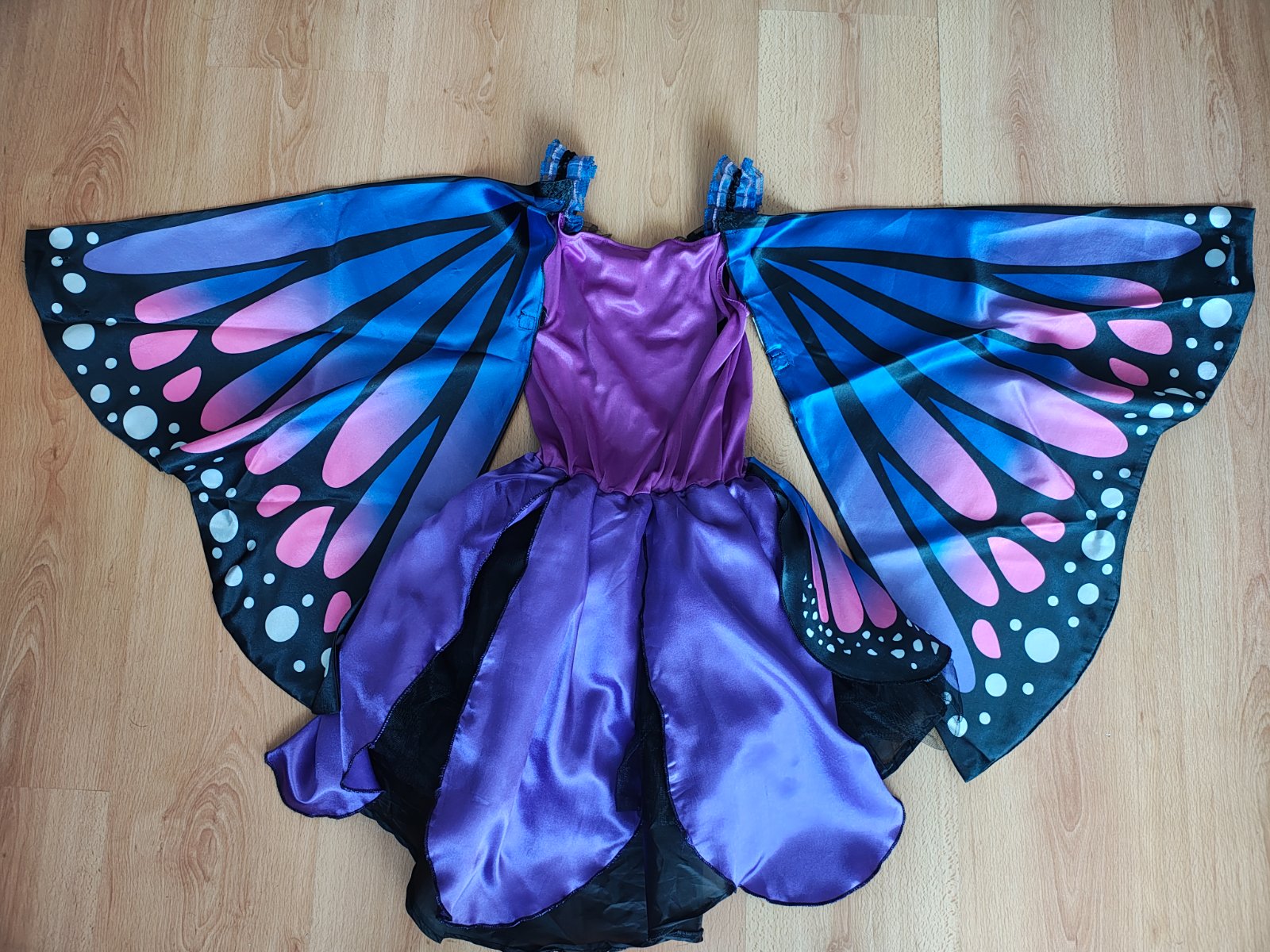Krásny kostým motýľa, dcéra ho mala ako predškoláčka. Veľkosť je písaná 128, reálne sedia 116-122. Krídla sa pripevnia na ramienka a chrbát šiat suchým zipsom a gumičkou na palec dieťaťa. Šaty majú spodničku z pevnej látky (viď predposlednú fotku), preto šaty krásne stoja. Na spodničke je čierna sukňa, čierny tyl a na vrchu farebné kusy látky.