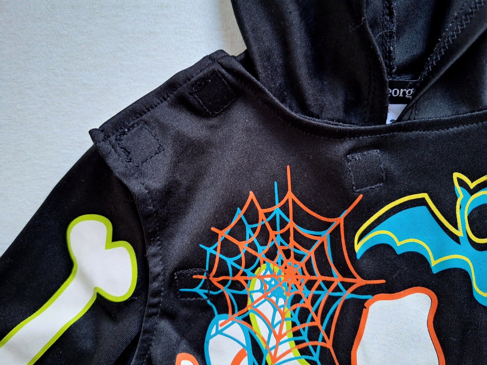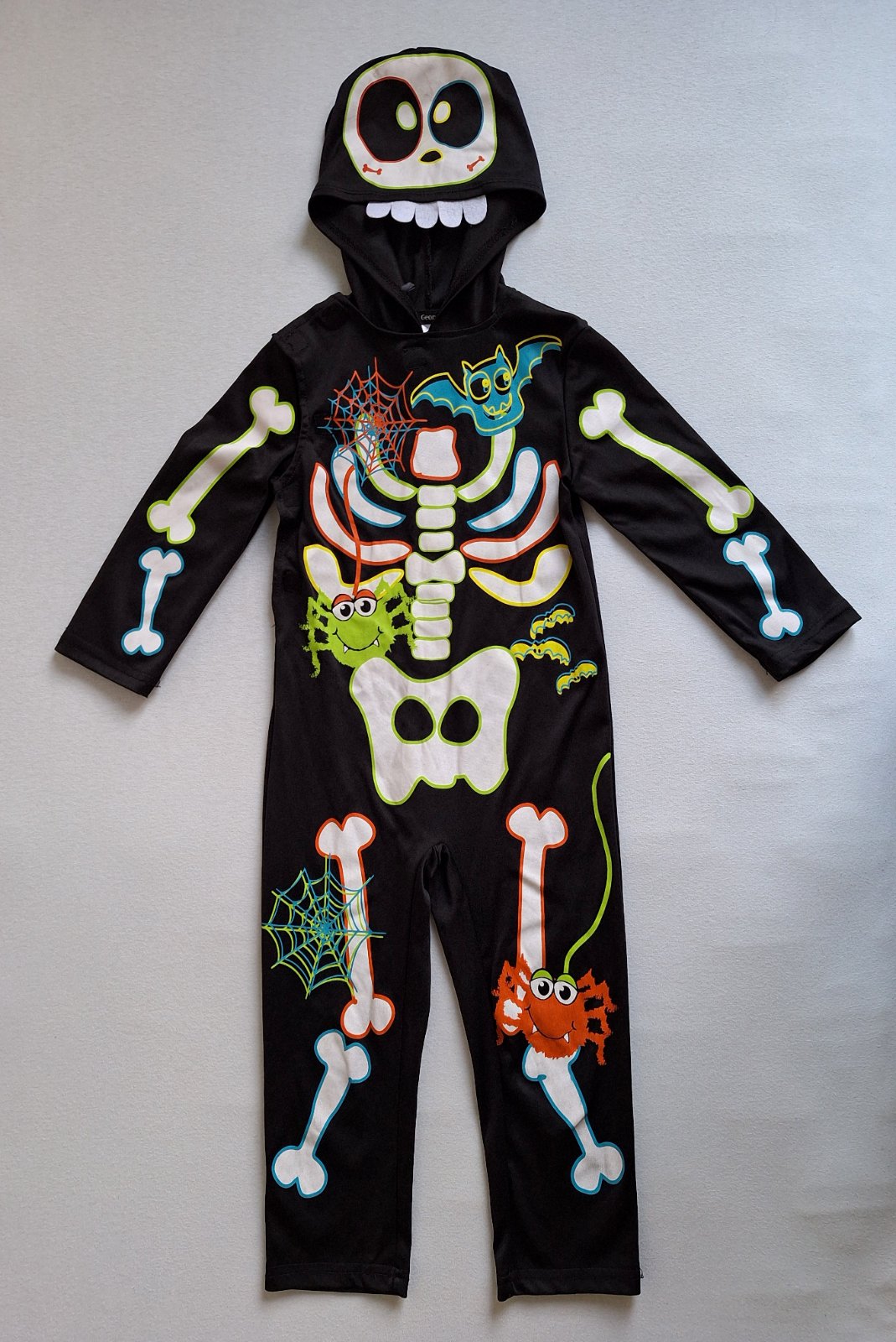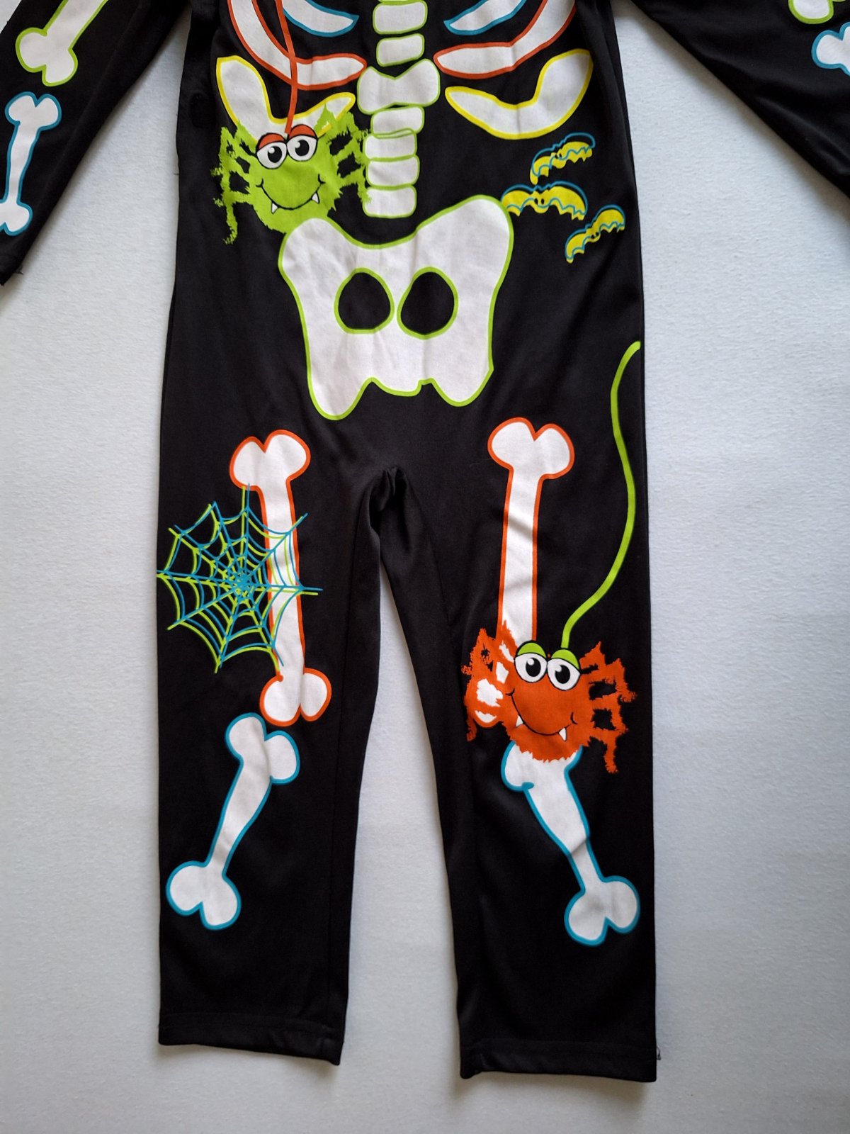 Krásny, elastický kostým kostričky s farebnými obrázkami netopiera a pavúkov. Zapína sa na ramene na suché zipsy. Kapucňa vpredu, ukončená zúbkami. Pekný stav len pod pazuškou pri suchých zipsoch trochu žmolky (viď foto) nič vážne.
