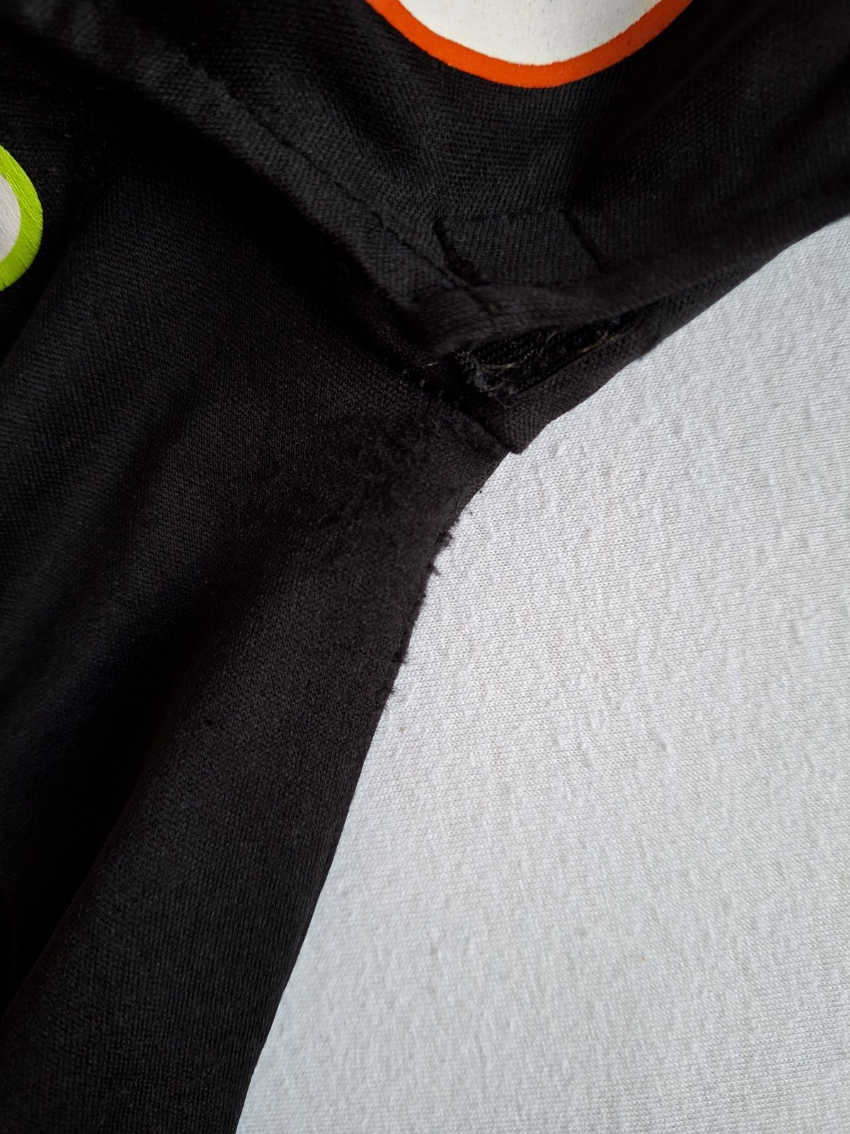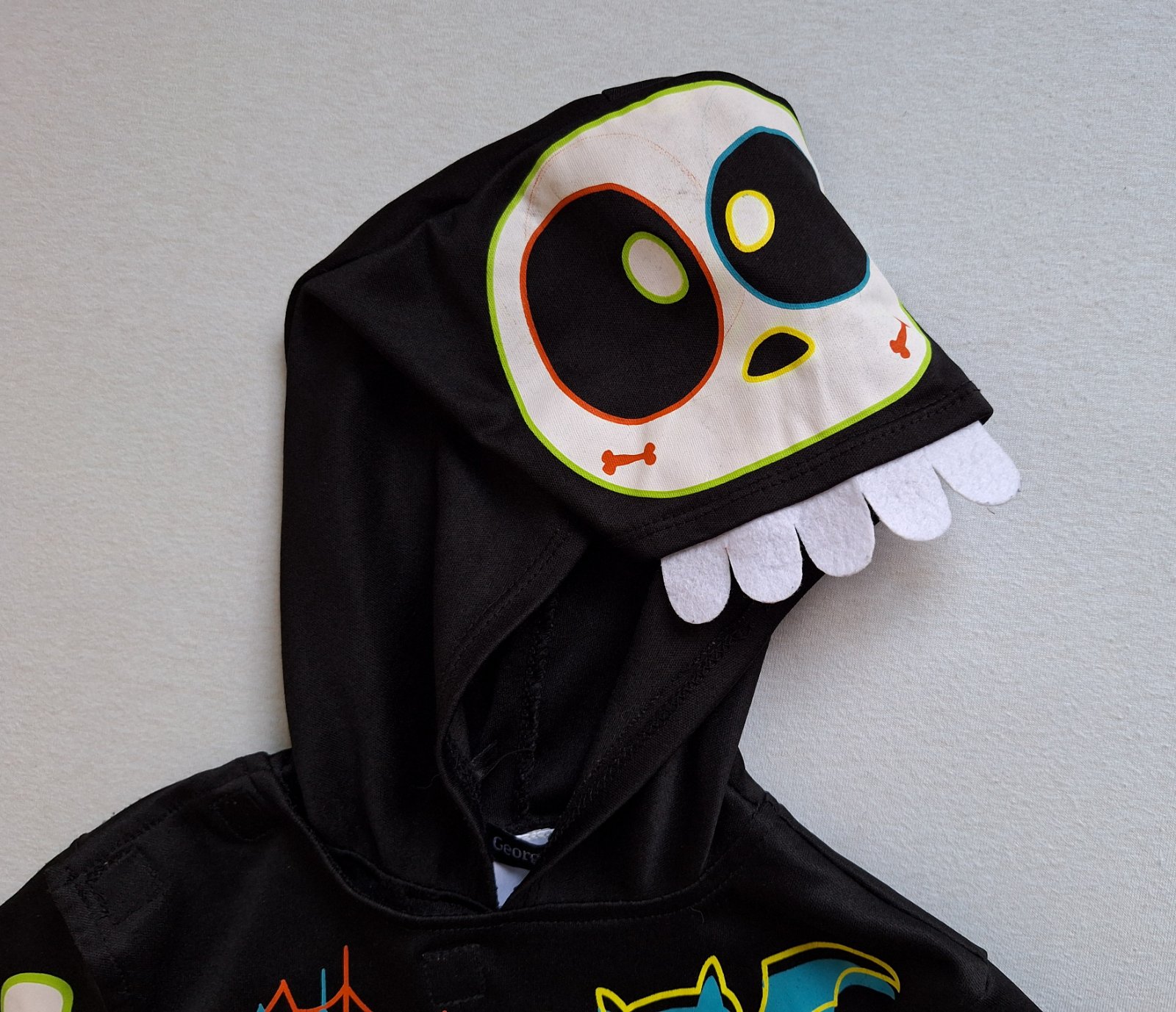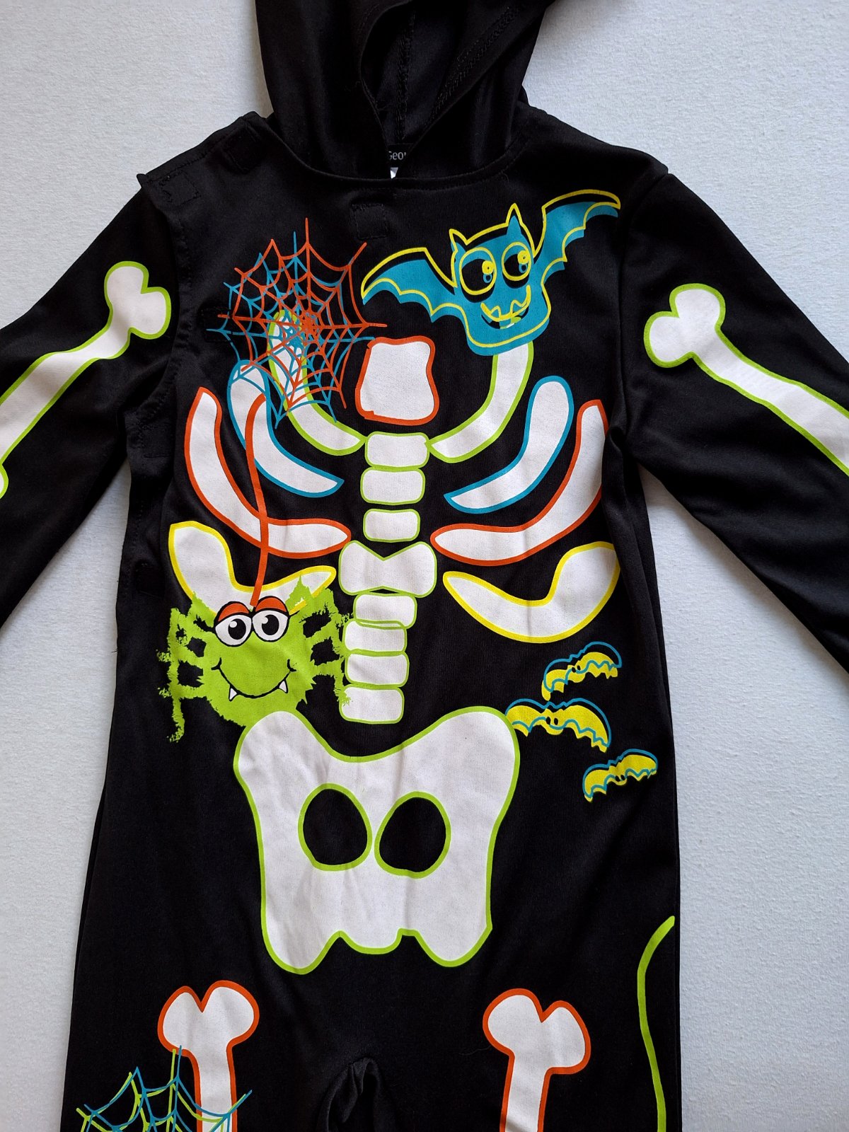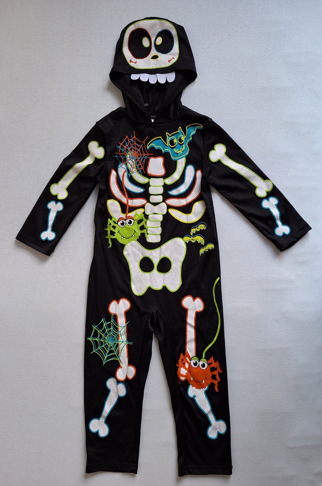 Krásny, elastický kostým kostričky s farebnými obrázkami netopiera a pavúkov. Zapína sa na ramene na suché zipsy. Kapucňa vpredu, ukončená zúbkami. Pekný stav len pod pazuškou pri suchých zipsoch trochu žmolky (viď foto) nič vážne.