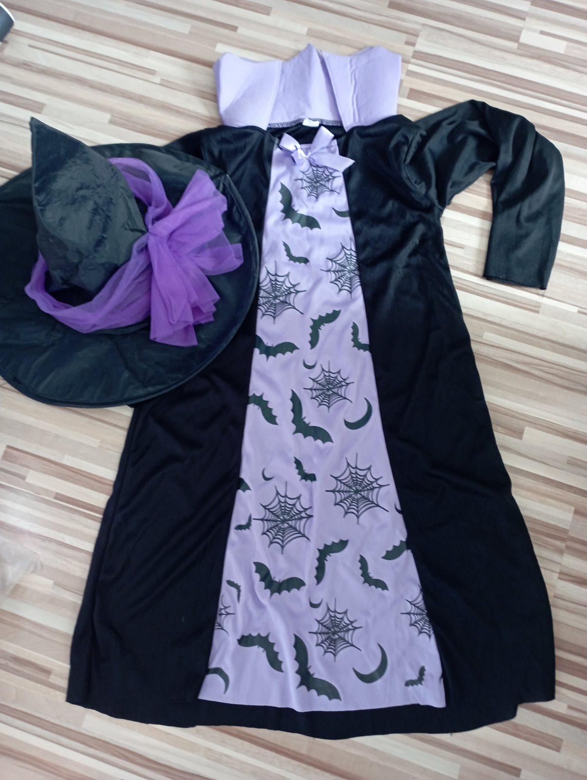 Kostým Večernice-šaty z pružného materiálu, dĺžka 83cm,saténový plášť so zapínaním na gombík, klobúk s gumičkou aj viazaním, raz použité. Čarovná palička v cene kostýmu.