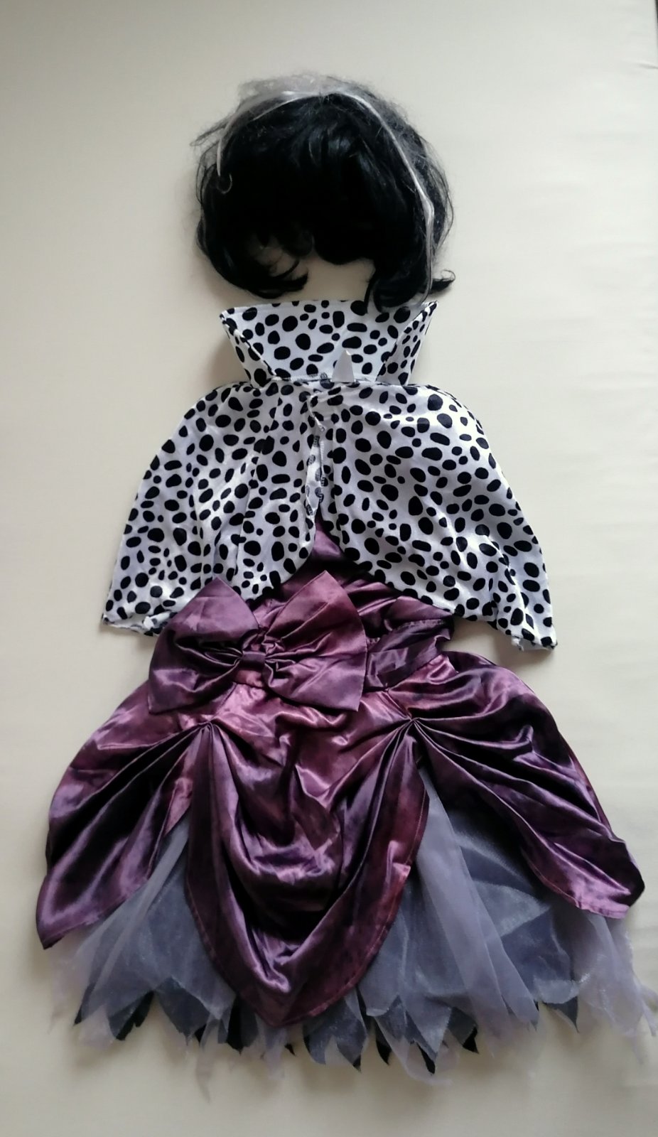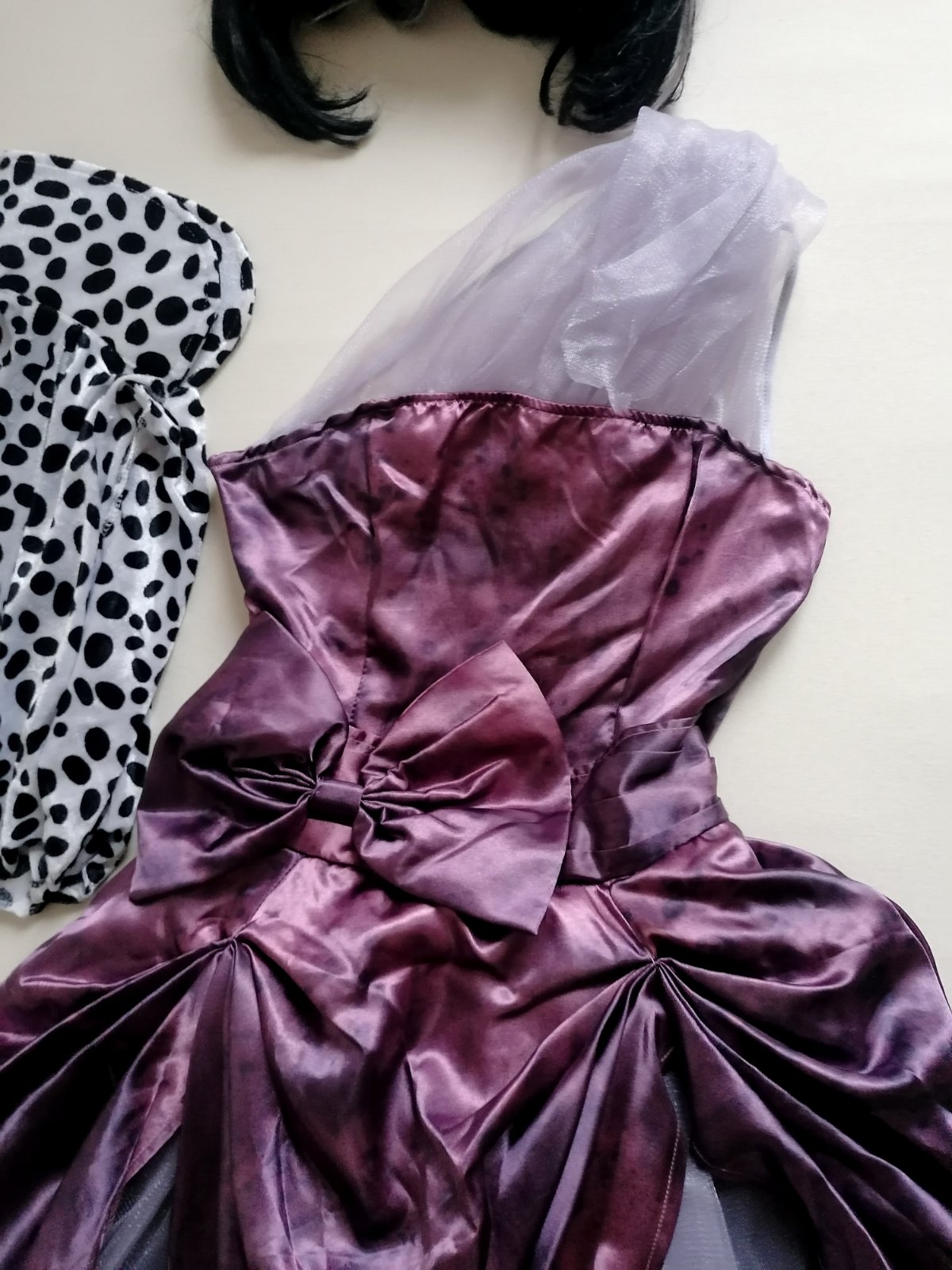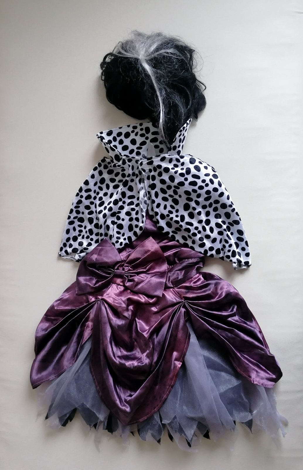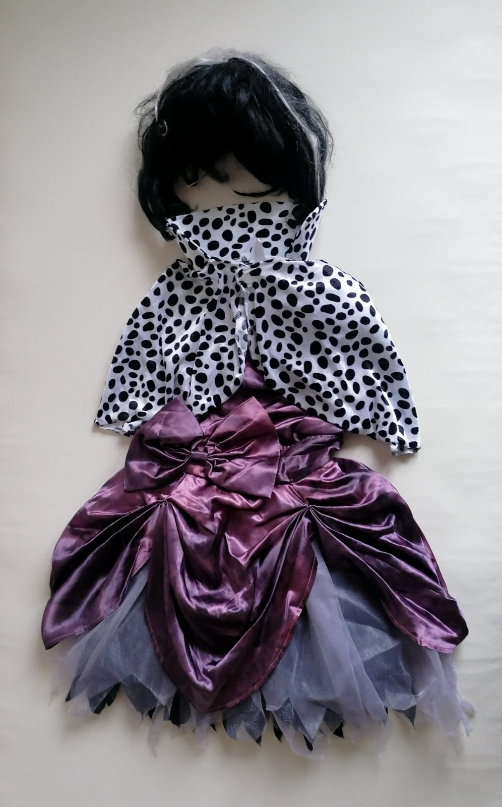 Exkluzívny kostým – šaty, bolerko, parochňa. Šaty s lesklého saténu, v páse veľká mašľa a bohato riasená sukňa z viacerých vrstiev tylu a pod tým pevná spodnička, ktorá super drží tvar. Nad prsiami aj v páse je guma, zadný diel živôtika je elastický, super sedia a prispôsobia sa postave. Súčasťou kostýmu je aj samostatný plášť. Využije ho aj ako zlá kráľovná, alebo Kruela.
