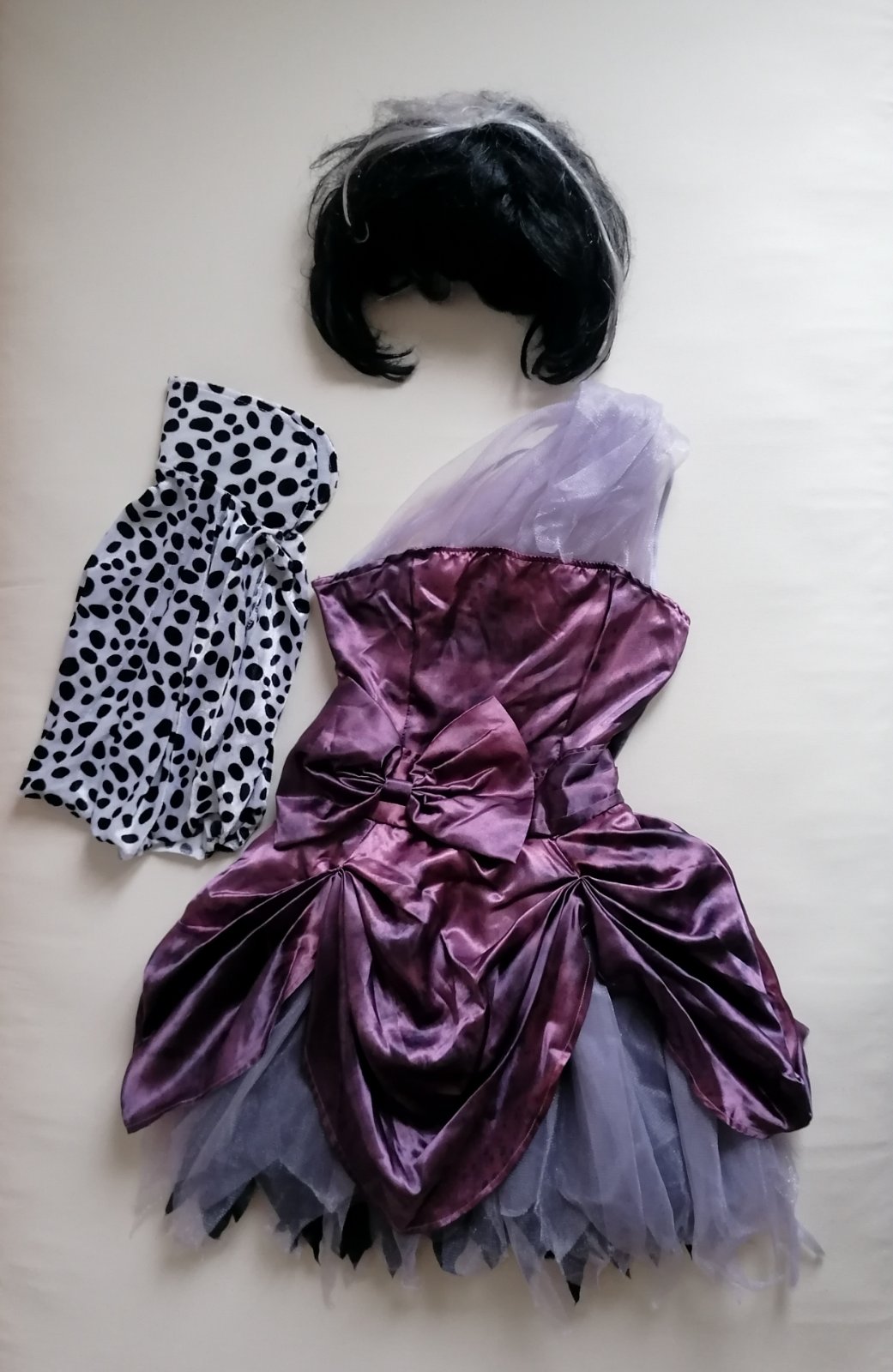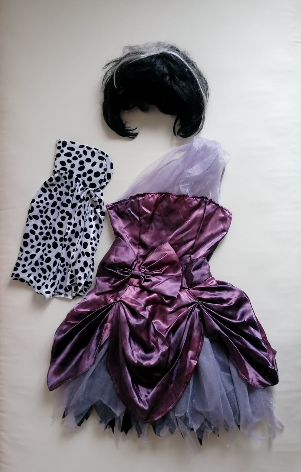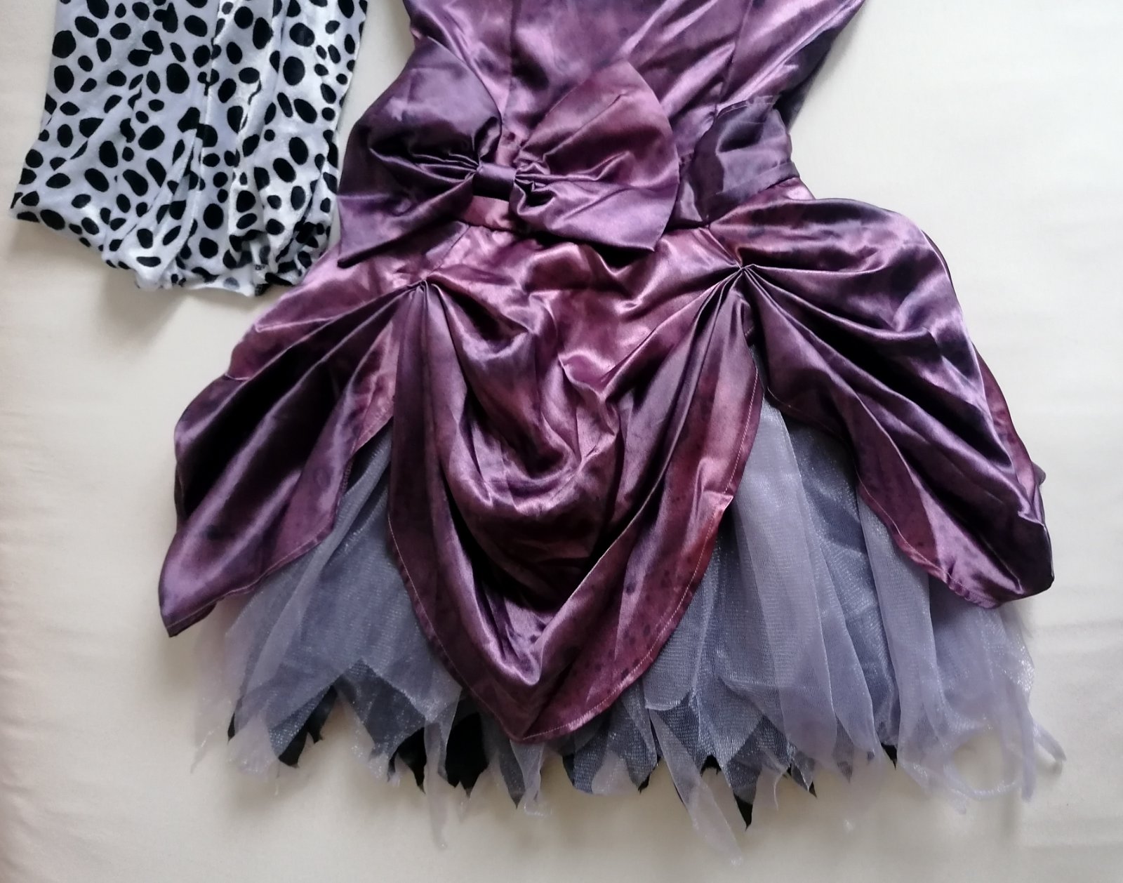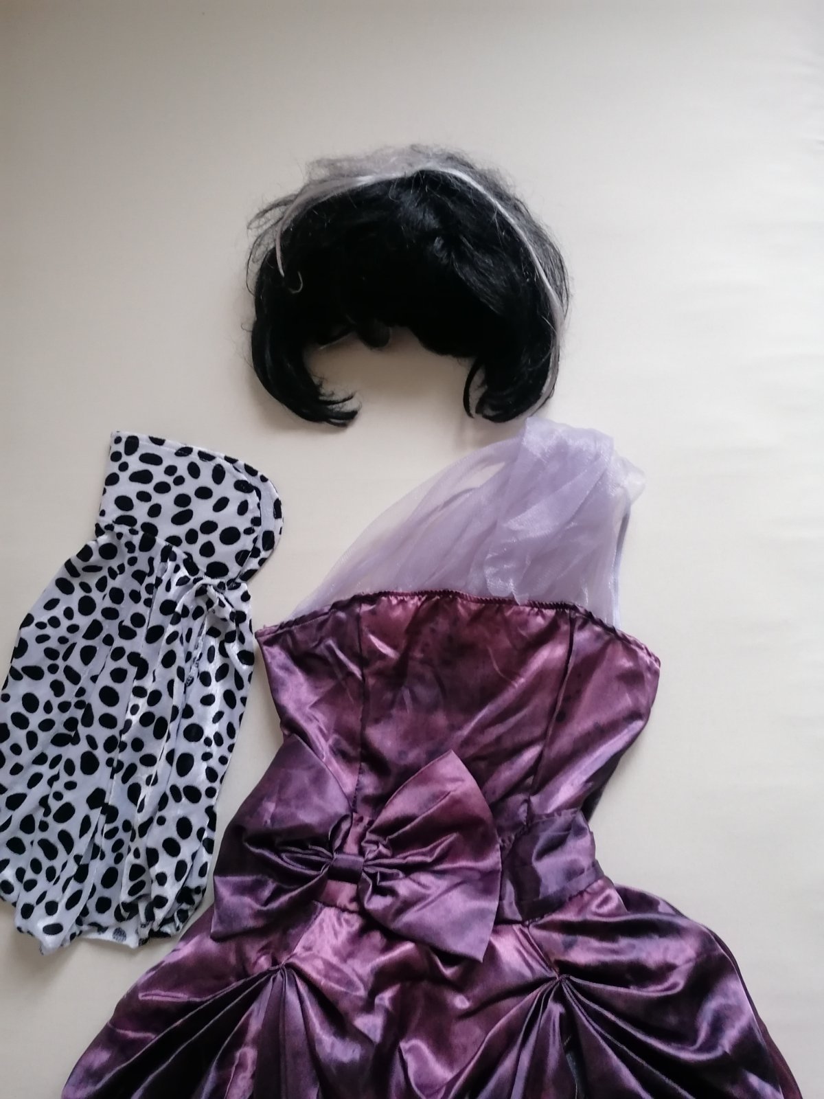 Exkluzívny kostým – šaty, bolerko, parochňa. Šaty s lesklého saténu, v páse veľká mašľa a bohato riasená sukňa z viacerých vrstiev tylu a pod tým pevná spodnička, ktorá super drží tvar. Nad prsiami aj v páse je guma, zadný diel živôtika je elastický, super sedia a prispôsobia sa postave. Súčasťou kostýmu je aj samostatný plášť. Využije ho aj ako zlá kráľovná, alebo Kruela.