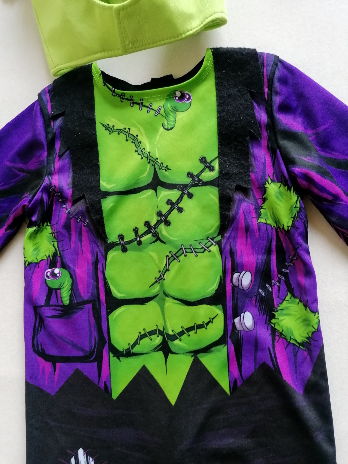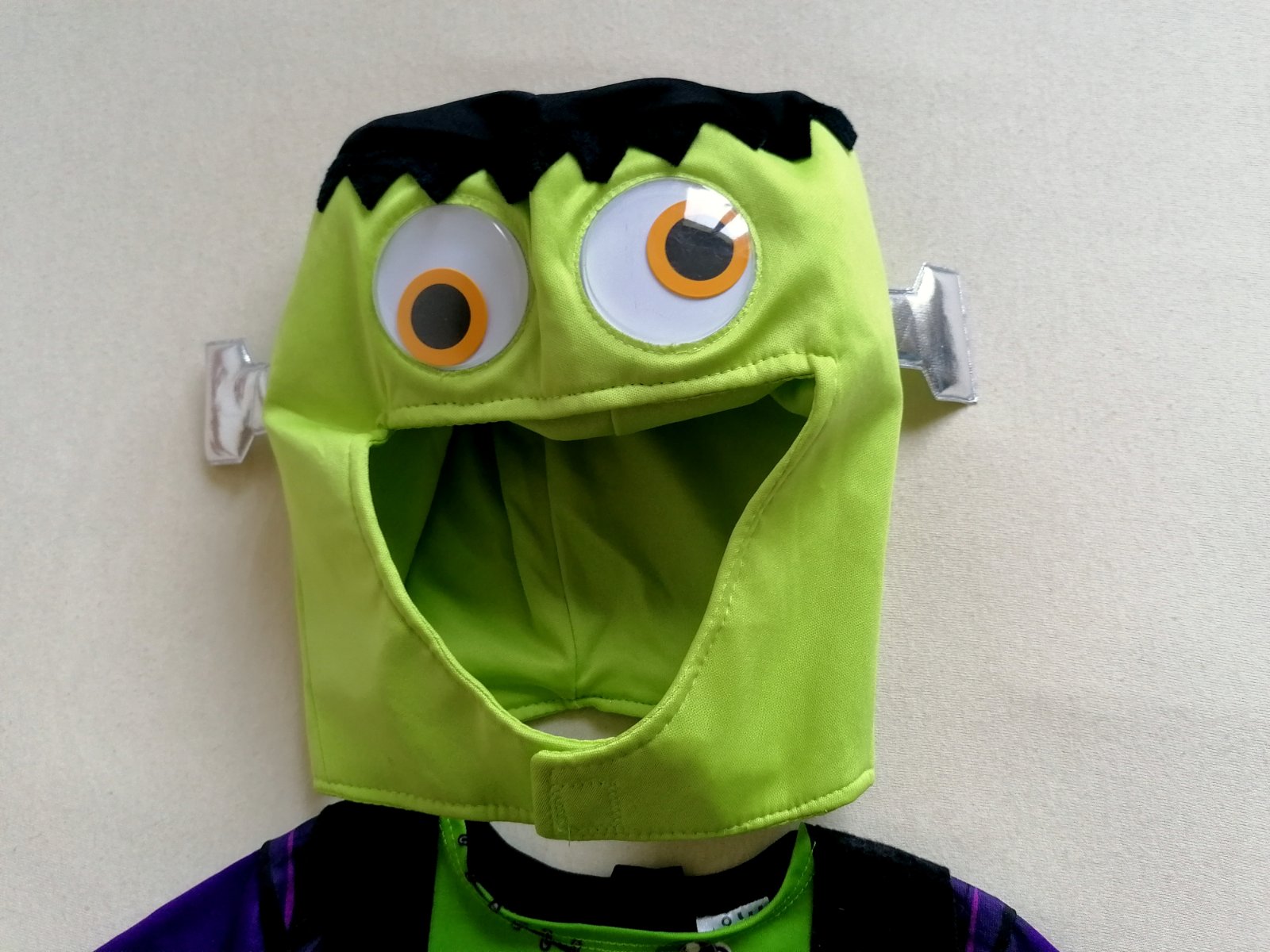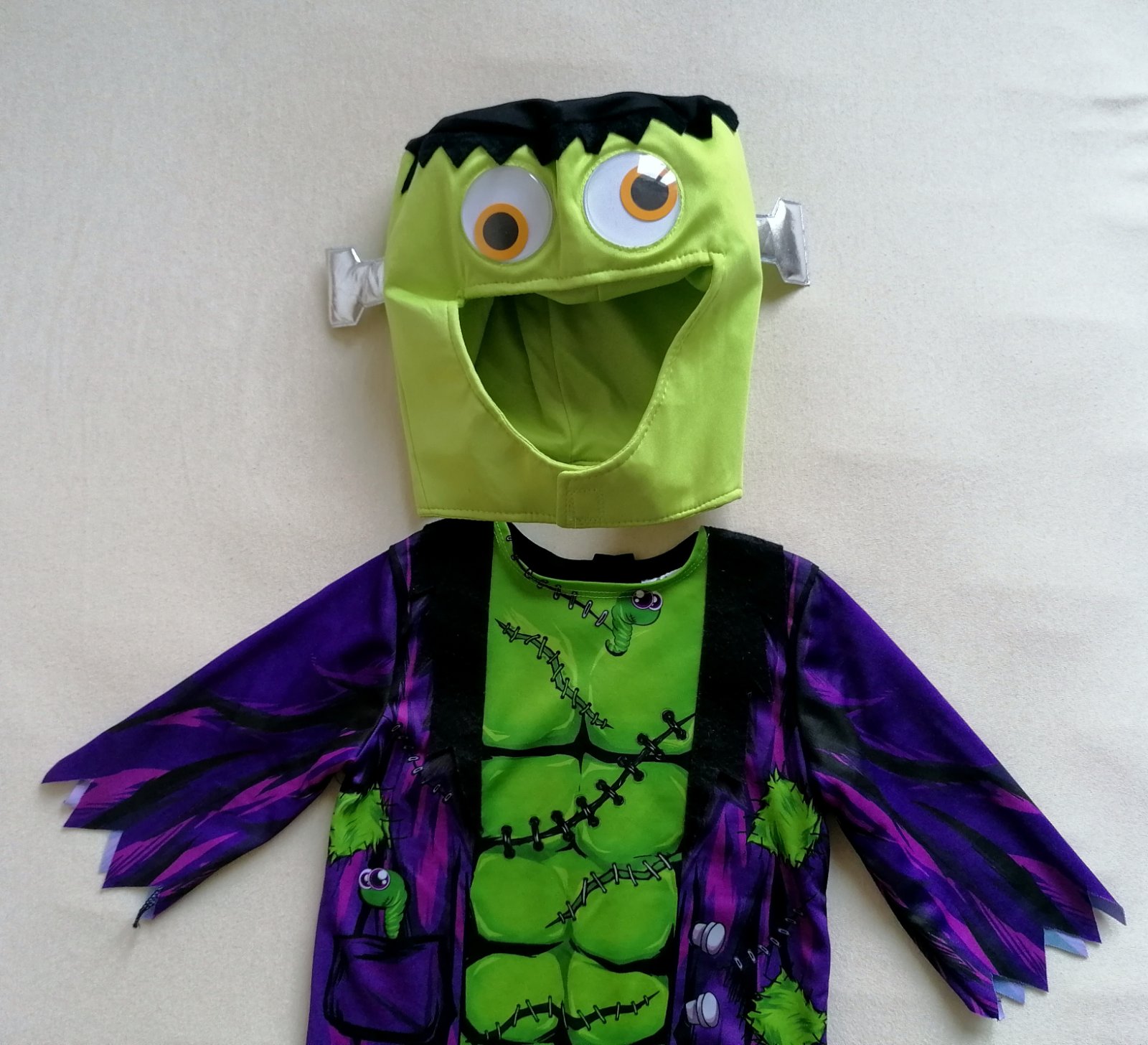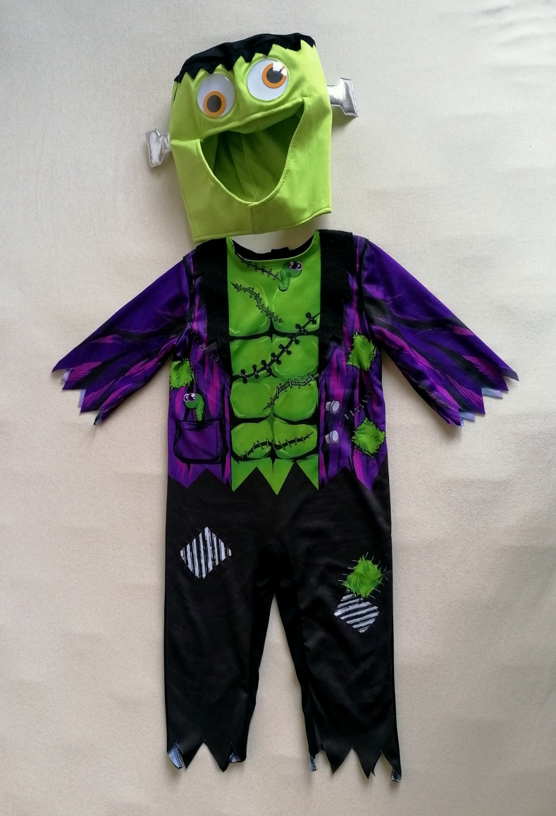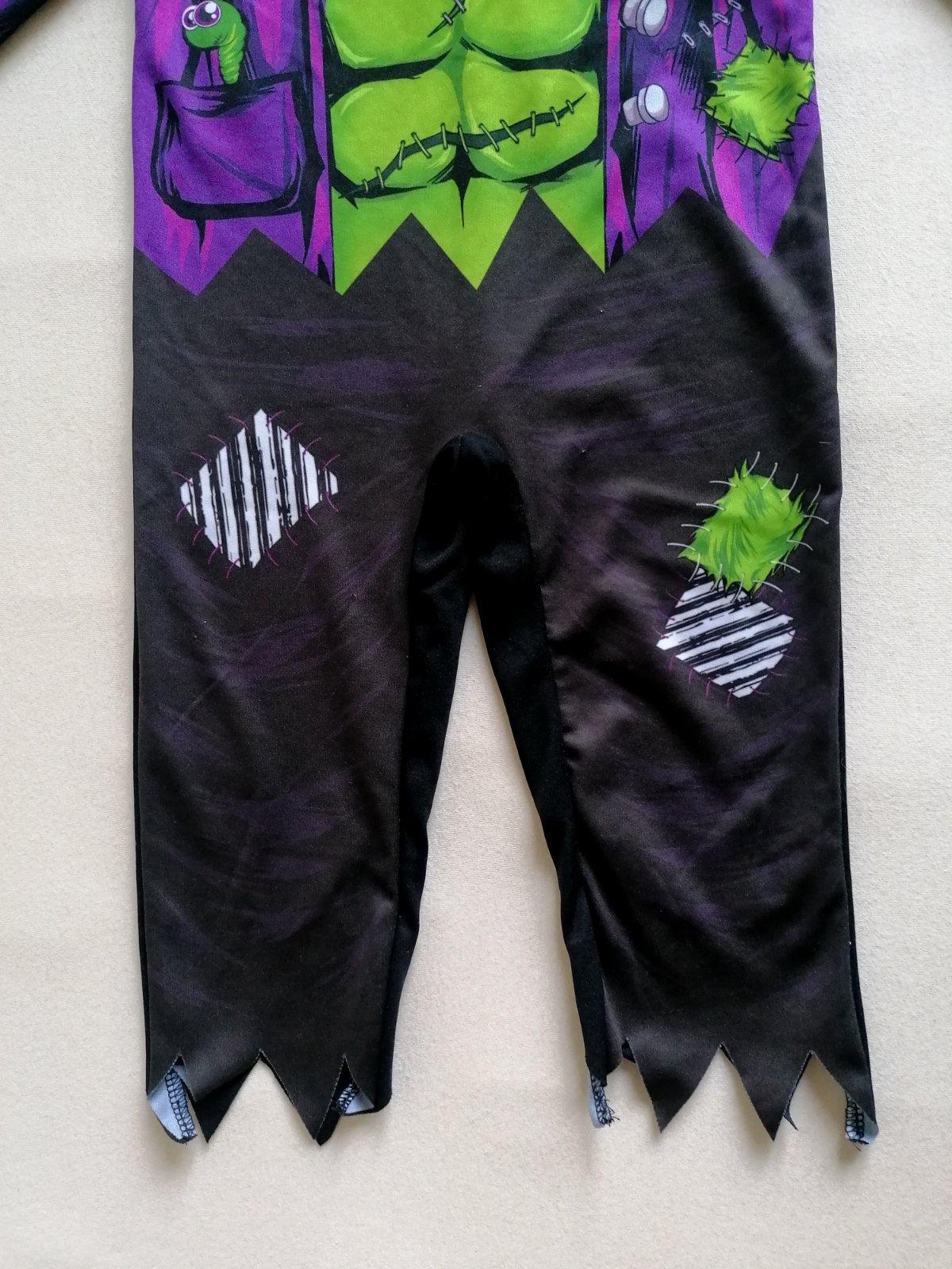 Celoelastický nádherný kostým malého Frankesteina, vhodný na halloween aj karneval. Kostým pozostáva z masky, kabátika a nohavíc. Maska má 3D oči, ktoré sa vo vnútri gúľajú.