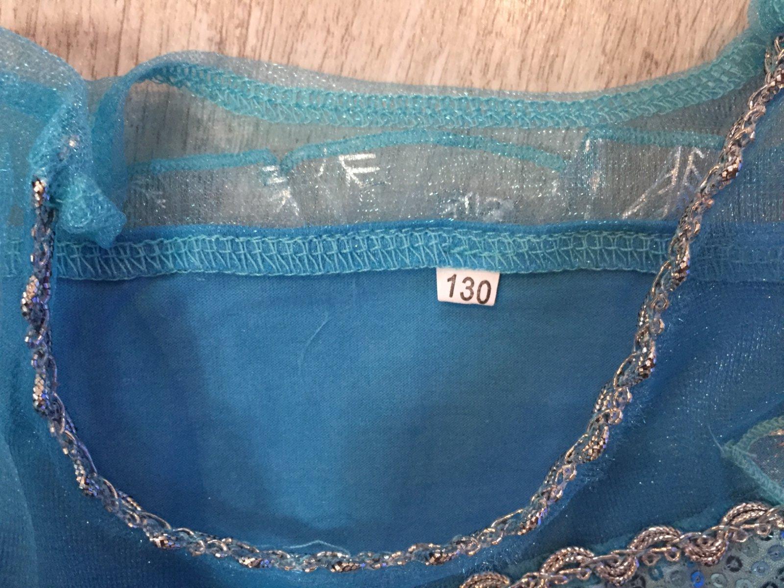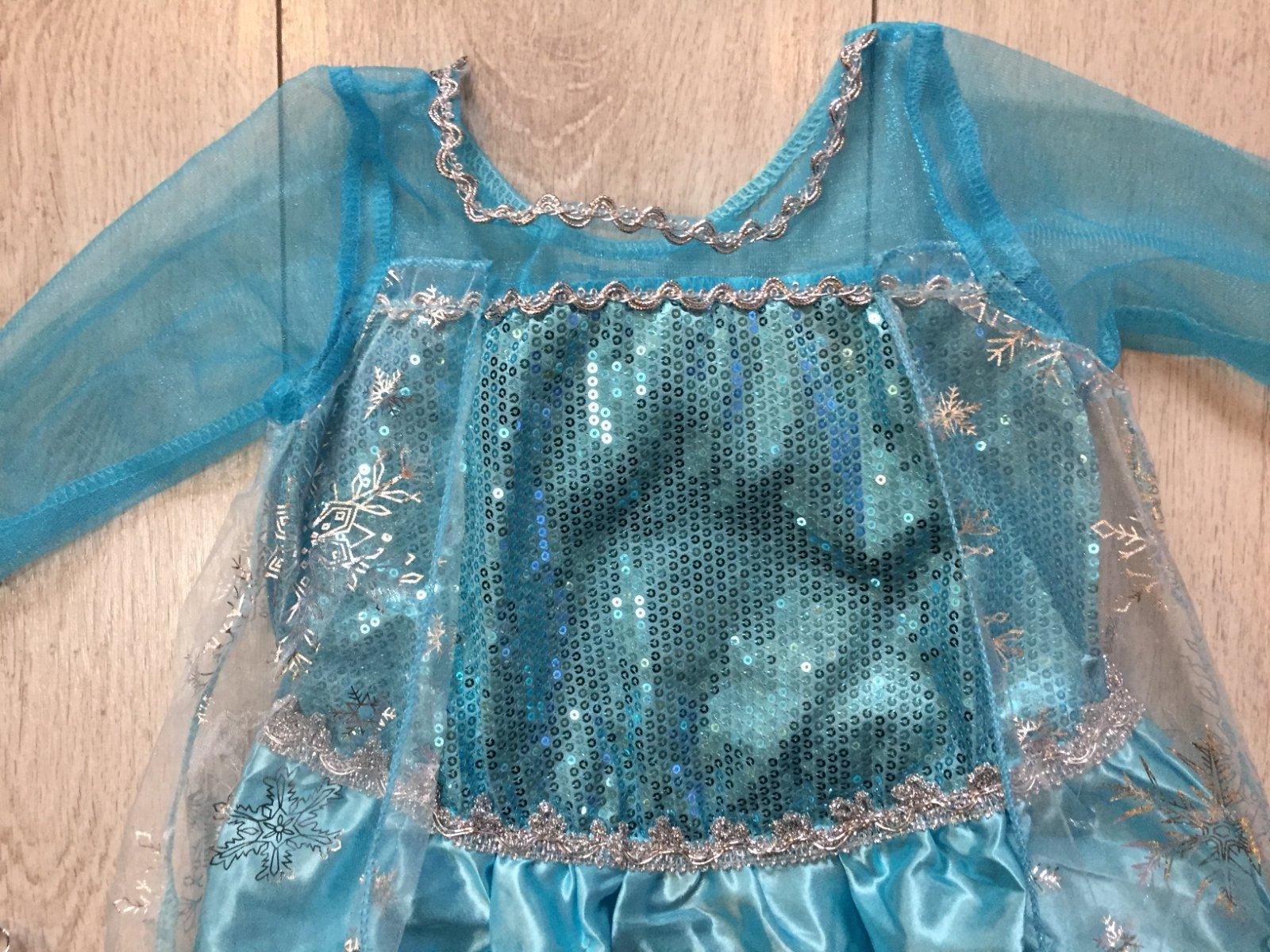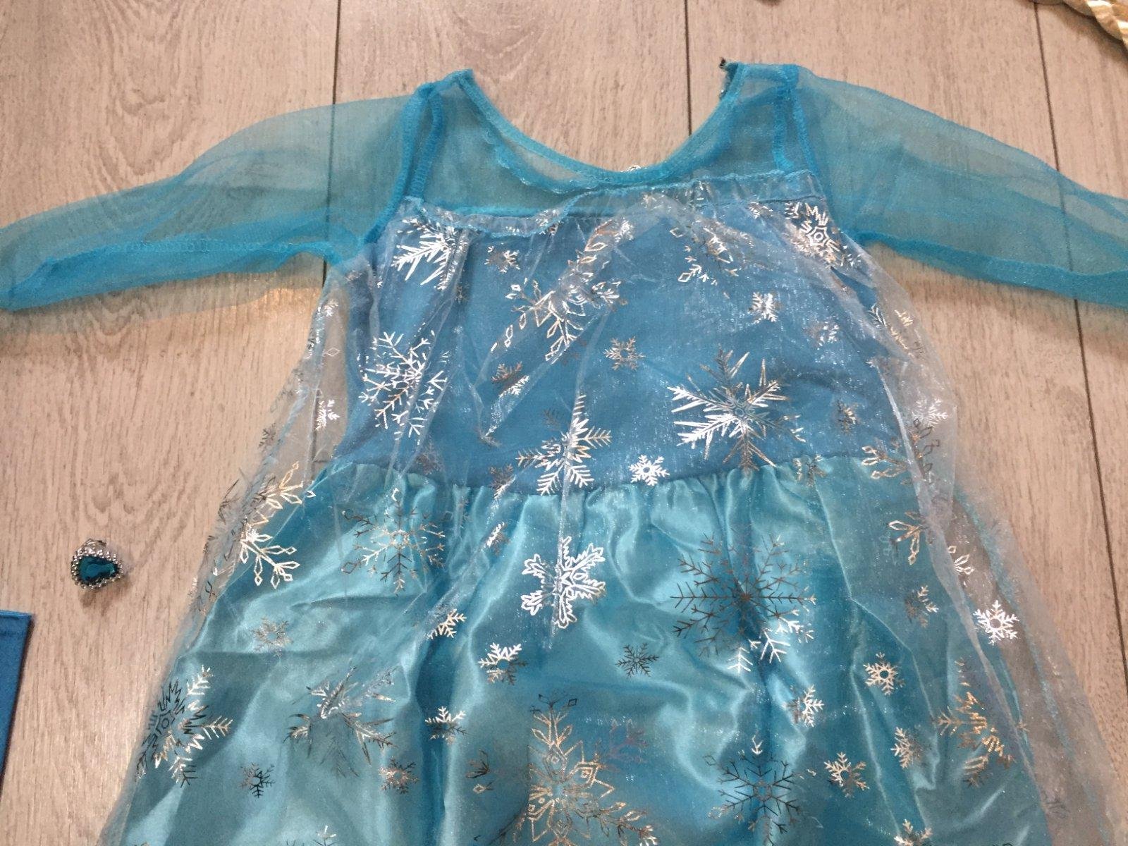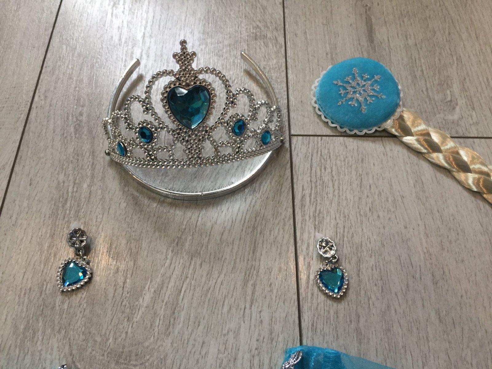 Kostym raz oblečeny v dobrom stave. Velkosť 130. Dlžka len šaty 80cm, širka cez pazuchy 33cm, širka v pase 33cm. Plus vrkoč, žezlo, korunka, rukavičky, naušnice, prsten.