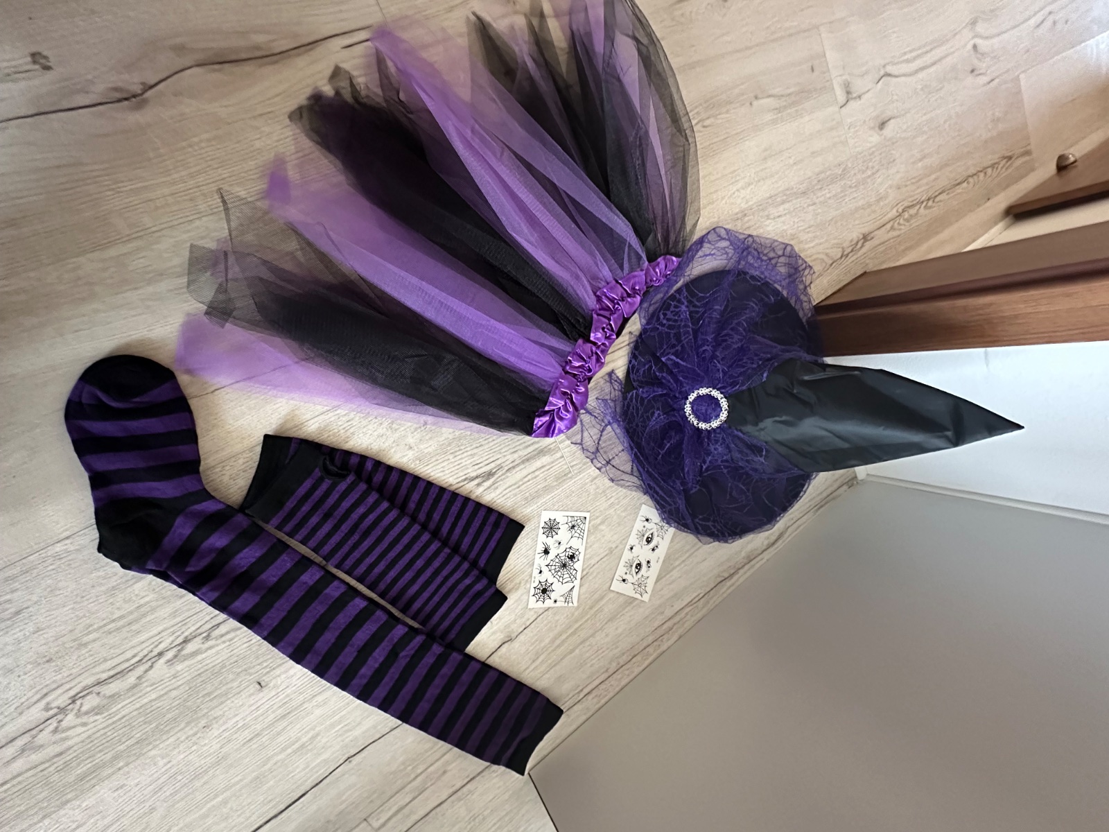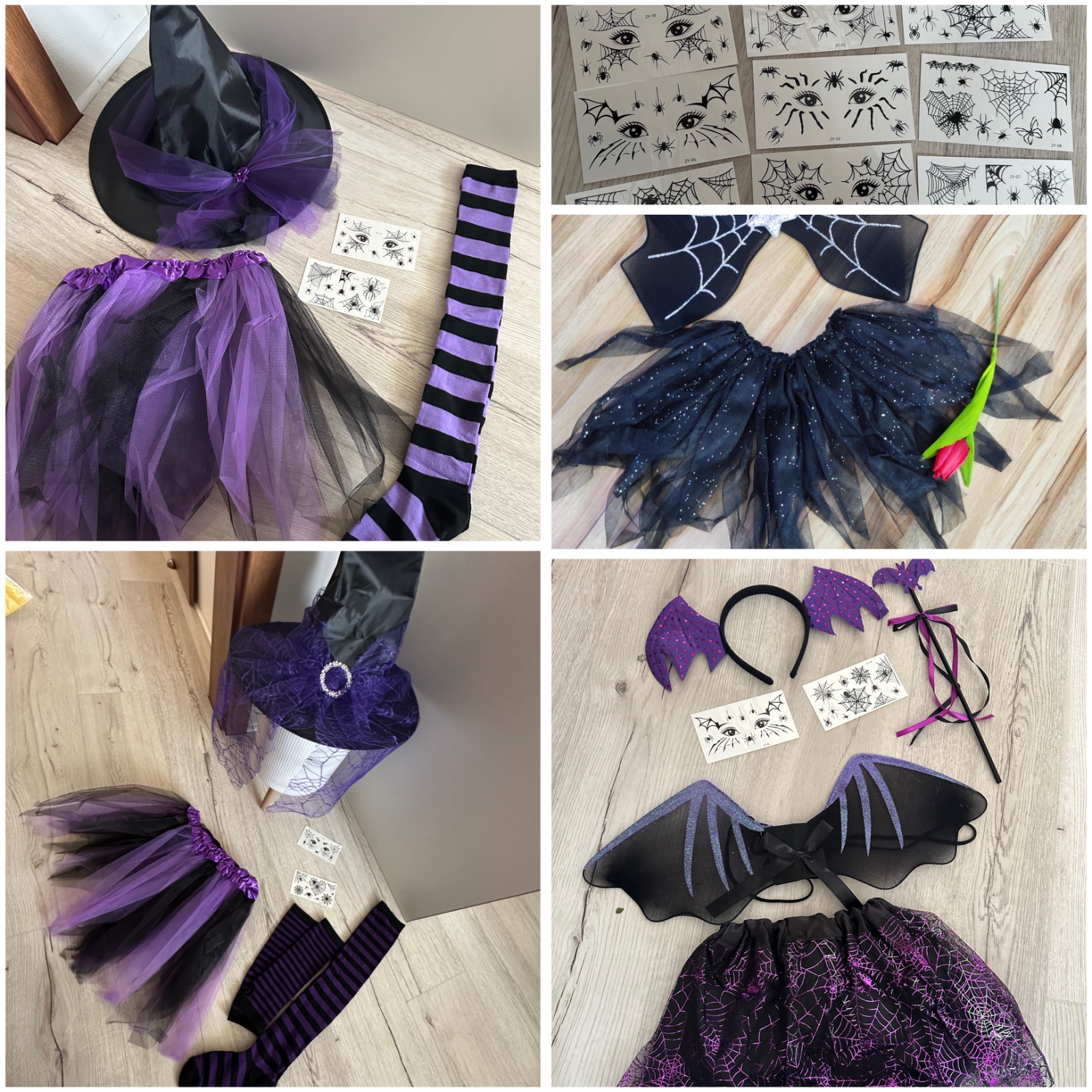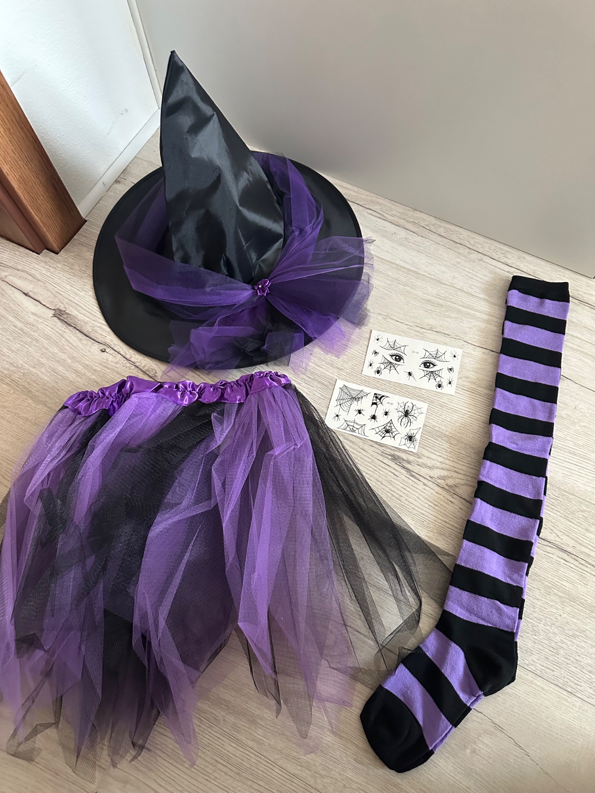 Čarodejnica 3set pre školáčky sukna dĺžka max43 cm najdlhší cip pas 27-50 cm, podkolienky, klobúk a 2ks nalepky/tetovačky 16€