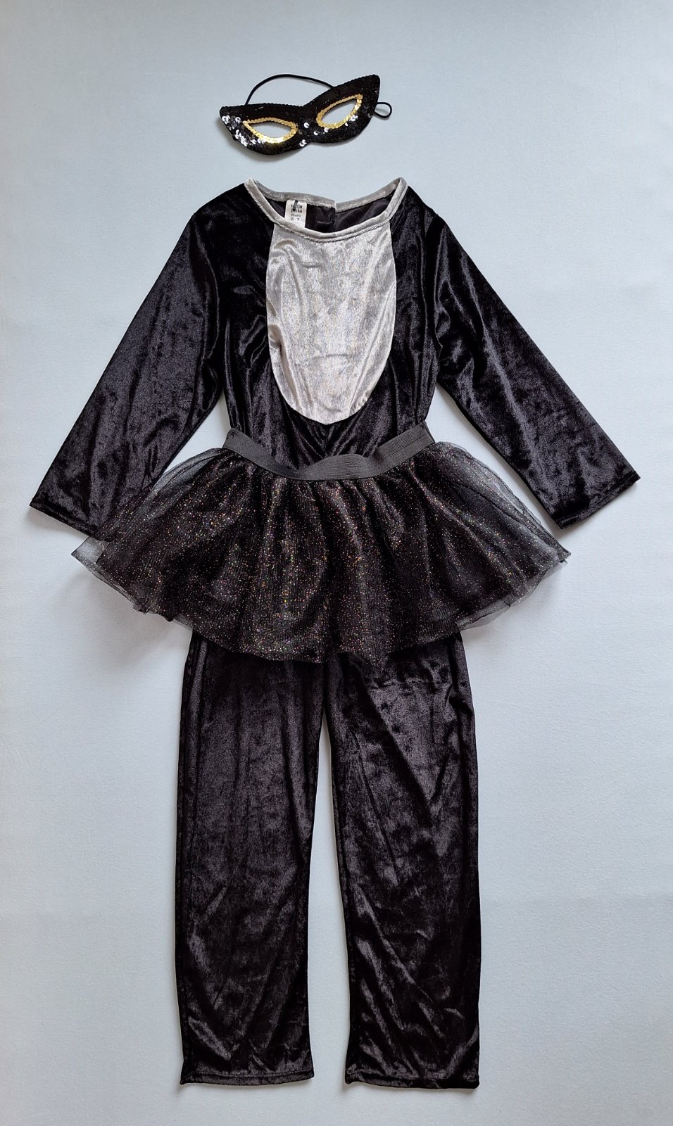 Exkluzívny komplet kostým je v top stav bez poškodení a známok nosenia, vhodné aj ako darček. Nápaditý kostým mačky, alebo hocijakej šelmy, doplnený škraboškou z flitrov v kombinácii so zlatou. 3-dielny kostým (overal + škraboška + suknička). Zamatový overal, pohodlný, prispôsobí sa postave. Sukňa má v páse gumu a je z lesklého tylu s trblietkami.