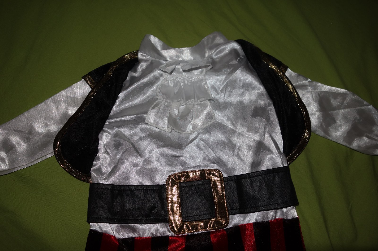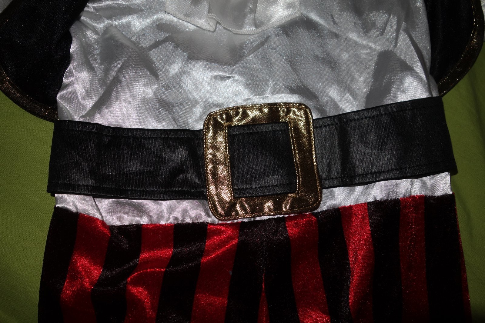 Pekny kostymcek na karneval vo velmi dobrom stave. Medzi nozkami ma cvocky. Velkost je uvedena ako S, podla mna je to 74-ka.