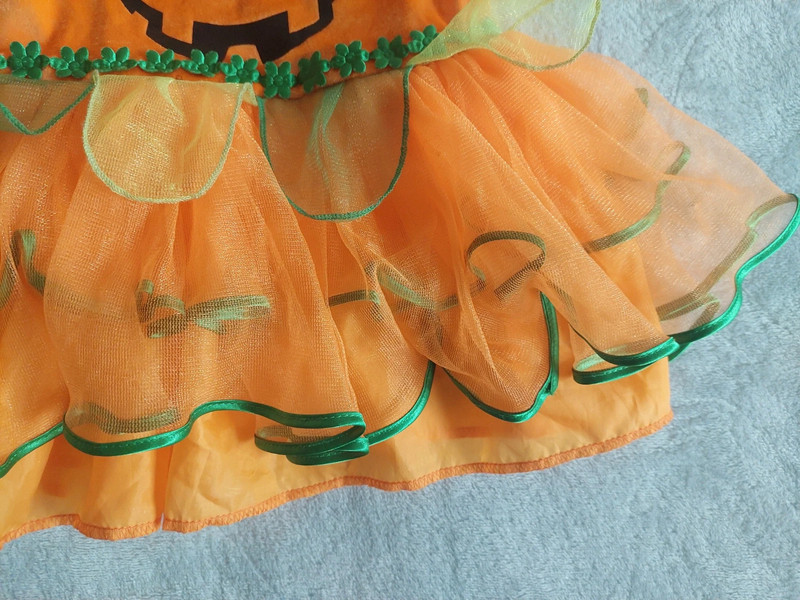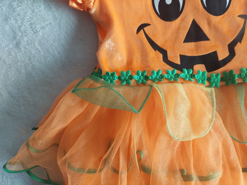 Stav: top stav, bez poškodení a známok nosenia. Parádny komplet kostým malej tekvičky - šaty + čiapka na hlavu. Živôtik zamatový, v páse guma, suknička viacvrstvová. Na hlavičku čiapočka na gumičku s gumičkou okolo krku.
