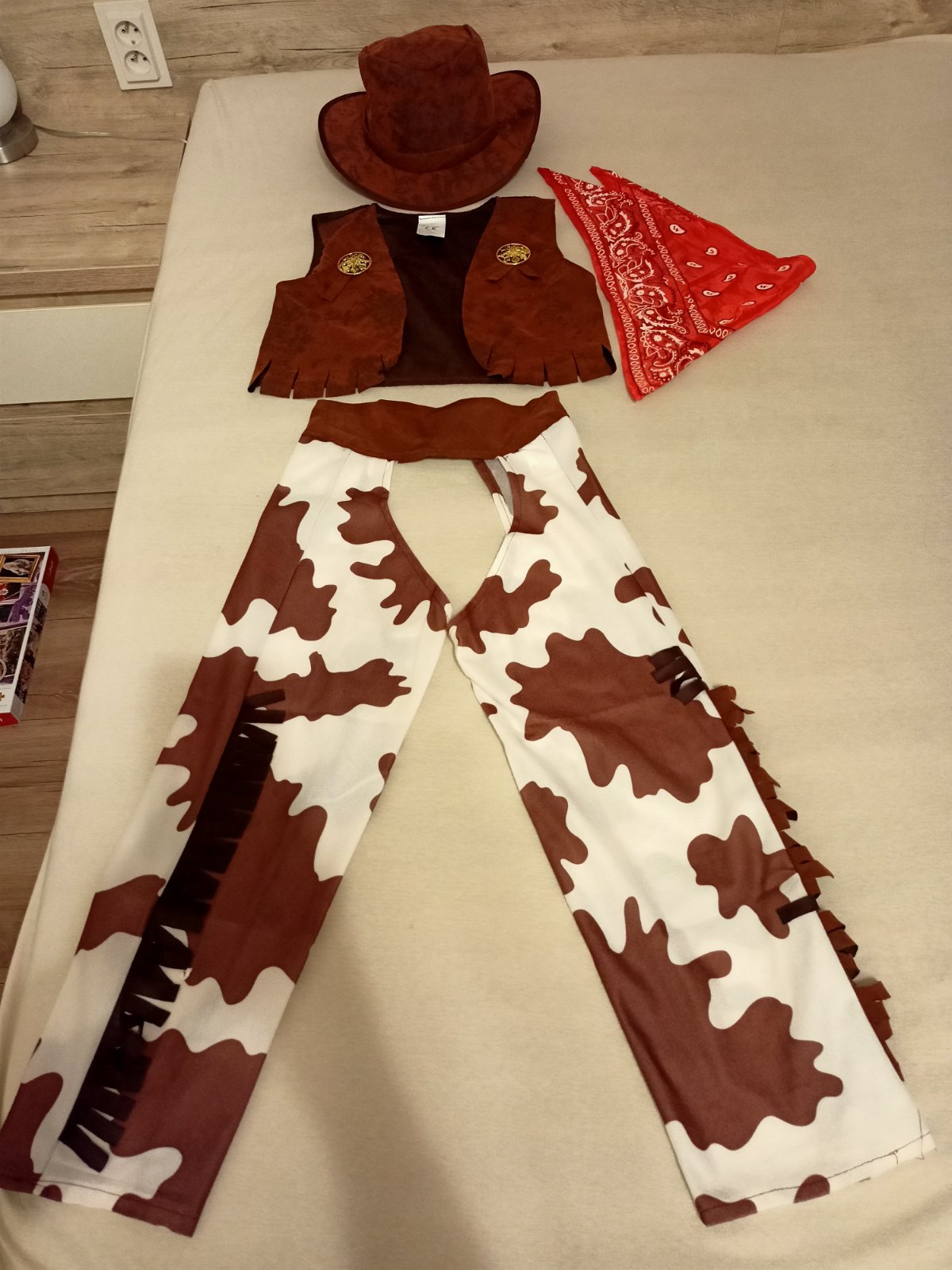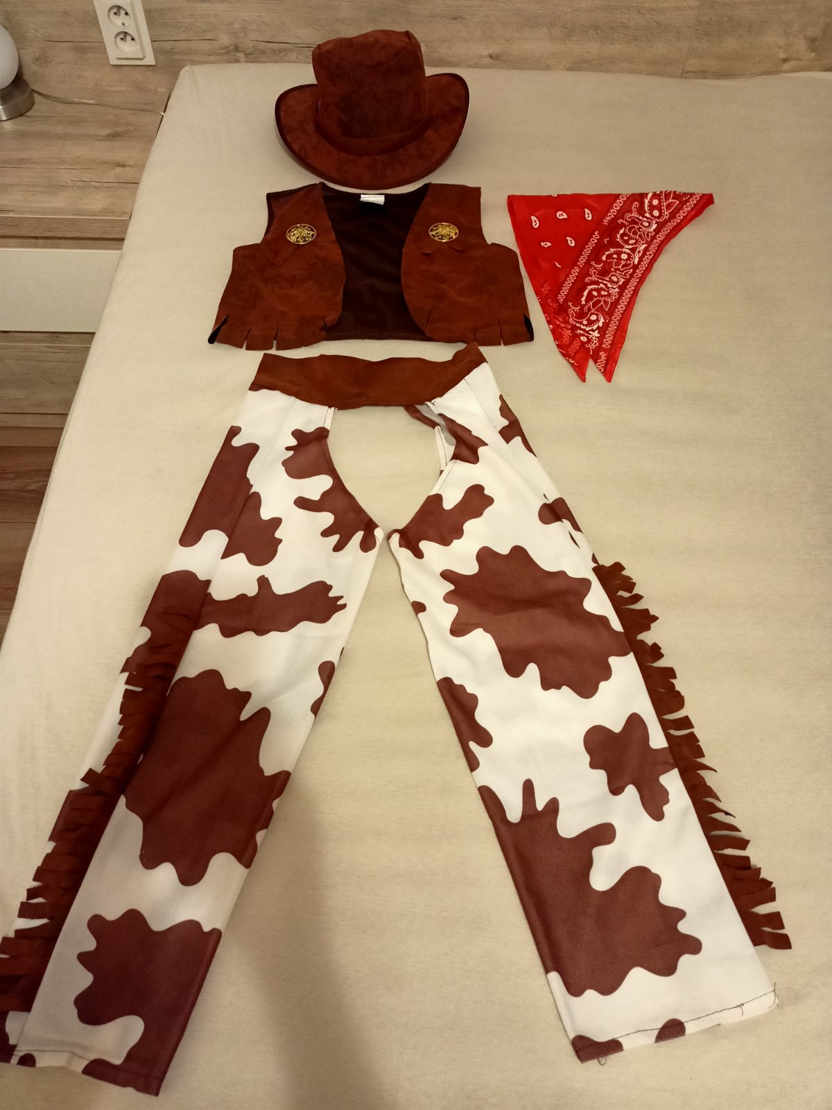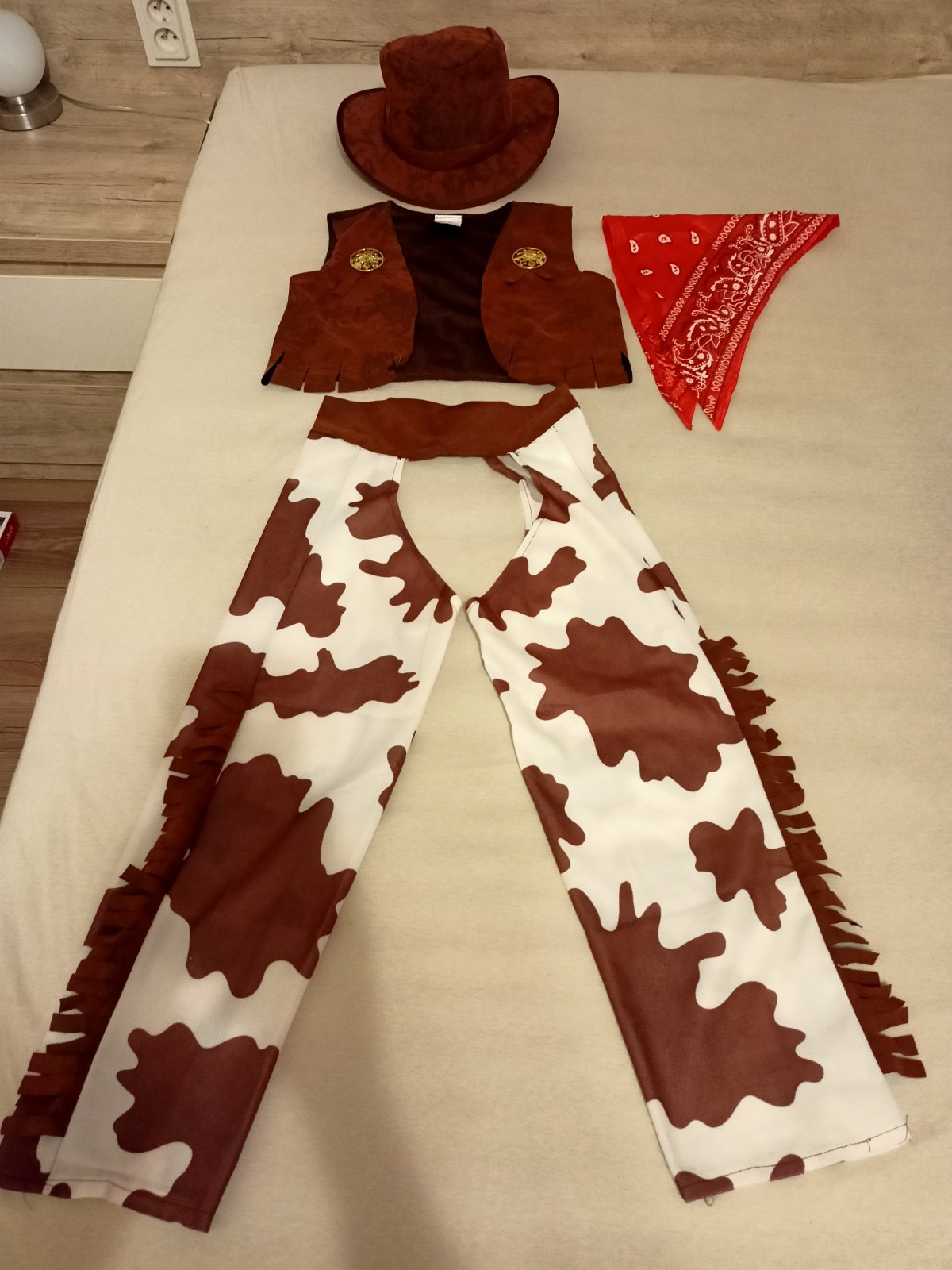 Predám krásny, originálny kostým Kovboja, veľ. na vek chlapčeka od 6 do 8 rokov. Synček ho mal oblečený na karnevale, maximálne zachovalý. Na foto sú aj rozmery kostýmu.