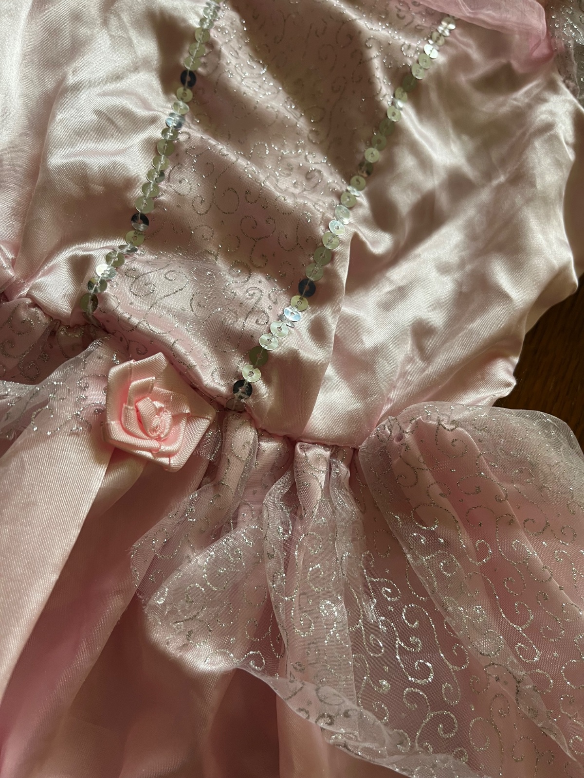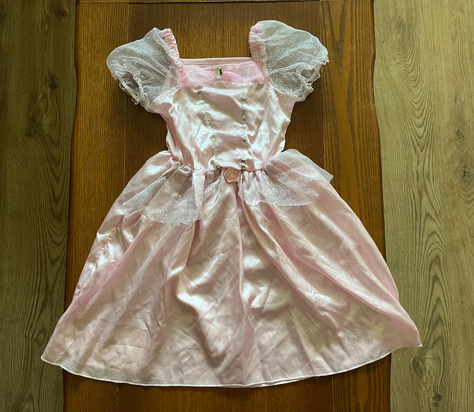 Množstvo krásnych detailov - saténová suknička, rukávy z organzy, flitre, príveskový kamienok, saténová ružička.