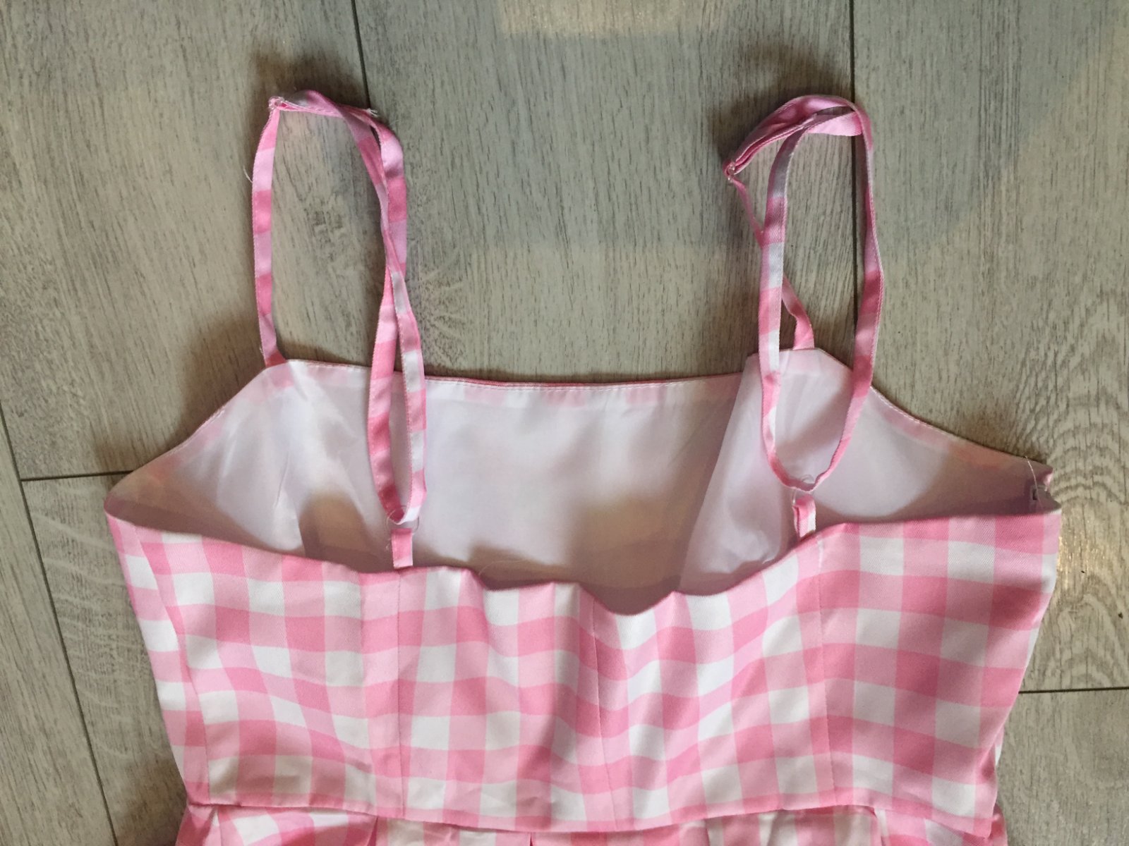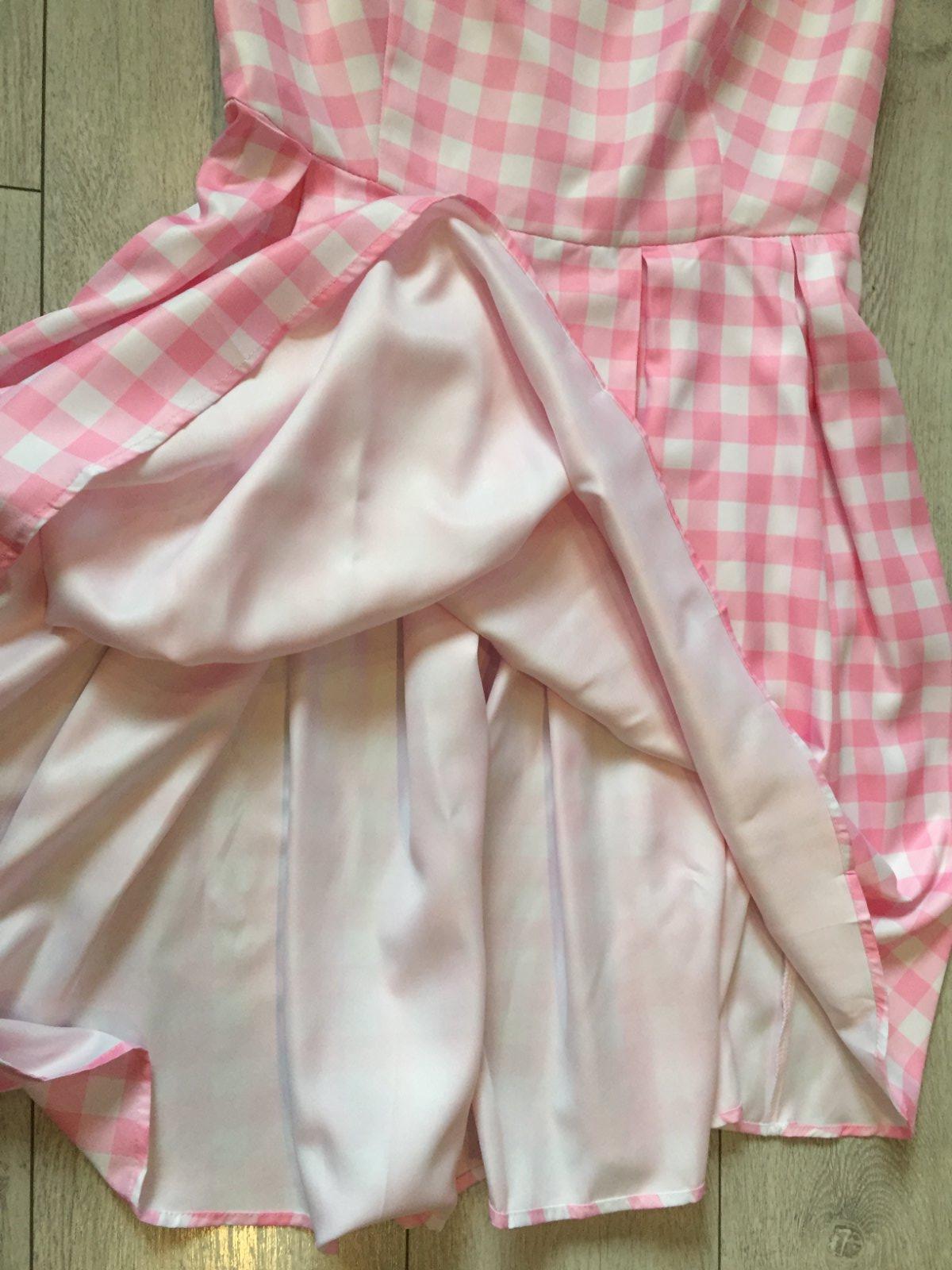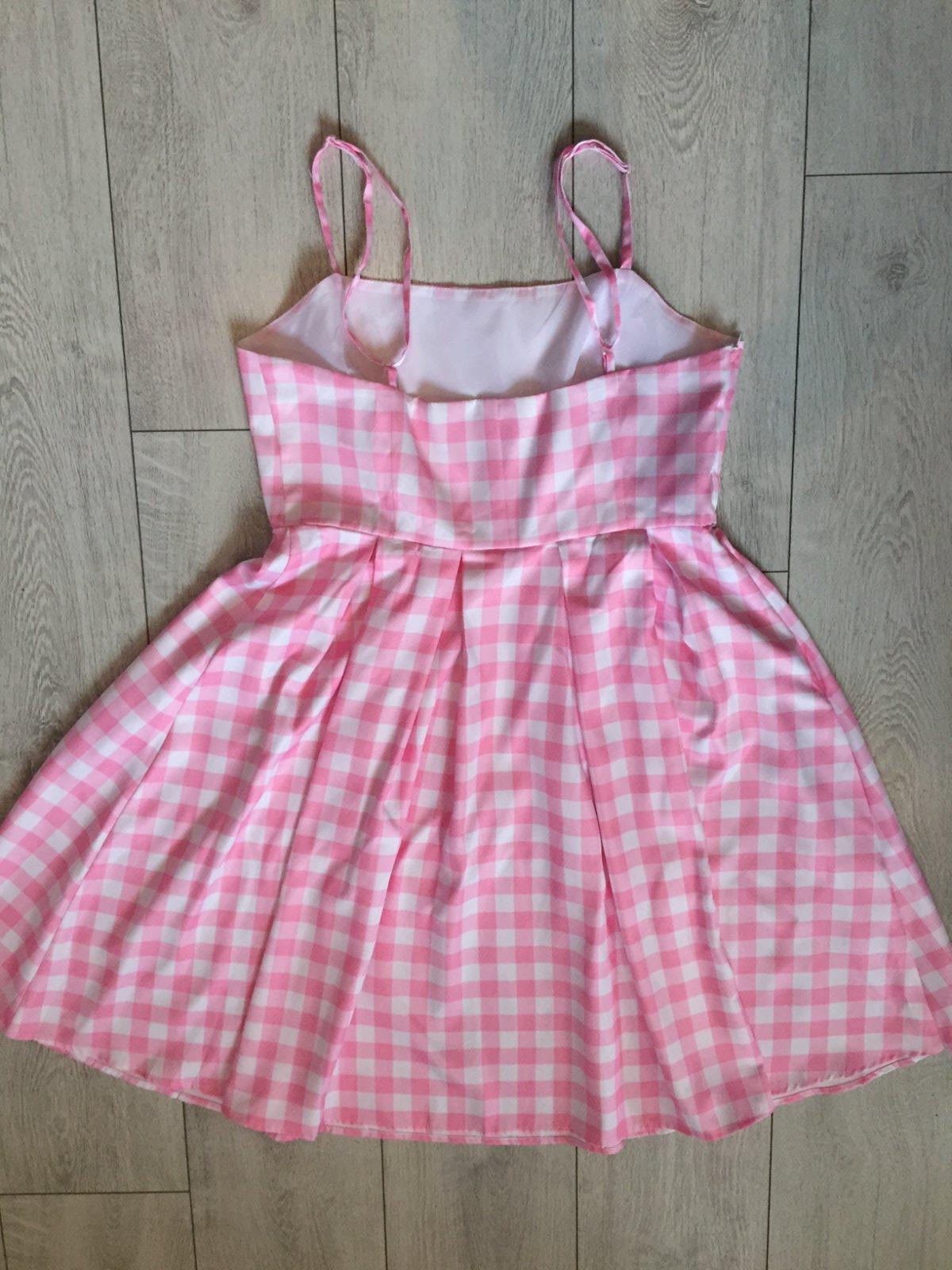 Kostym Barbie z filmu v dobrom stave. Velkosť L. Ramienka sa daju regulovať. Dlžka 96cm, širka cez pazuchy 48cm, širka v pase 41cm. Opasok dlžka 170cm. Plus mašla, naramok, naušnice a nahrdelnik.