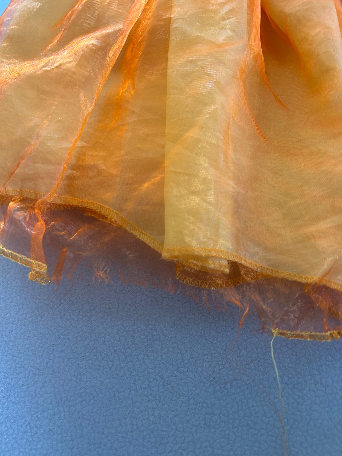 Pozostava z klobúčika, šiat a krídel. Krídla sú volne spustené a nedržia úplne tvar lebo chýba drôtik v pravom krídelku. Na suknicke je cca 10 cm co potrebuje oendlovat, sikovna mama opravi, zohladnene v cene. Klobúčik je s motívom pavučiniek. Šaty v páse majú ozdobnú organzu s motívom tekvičiek.