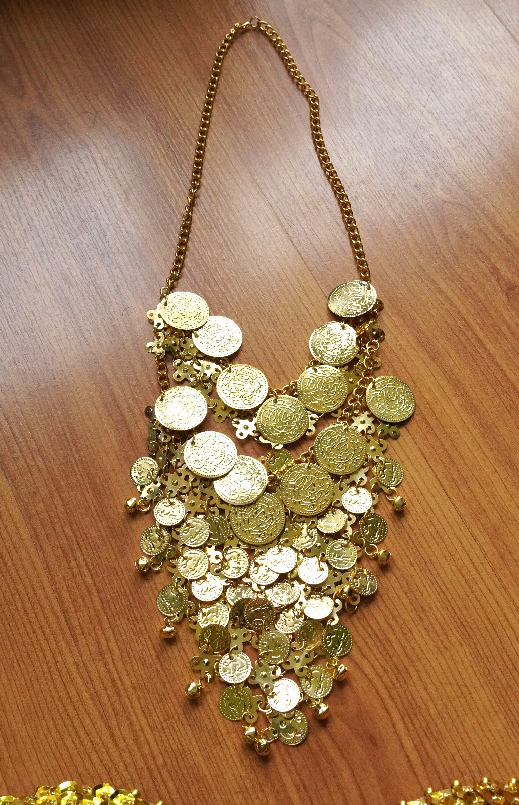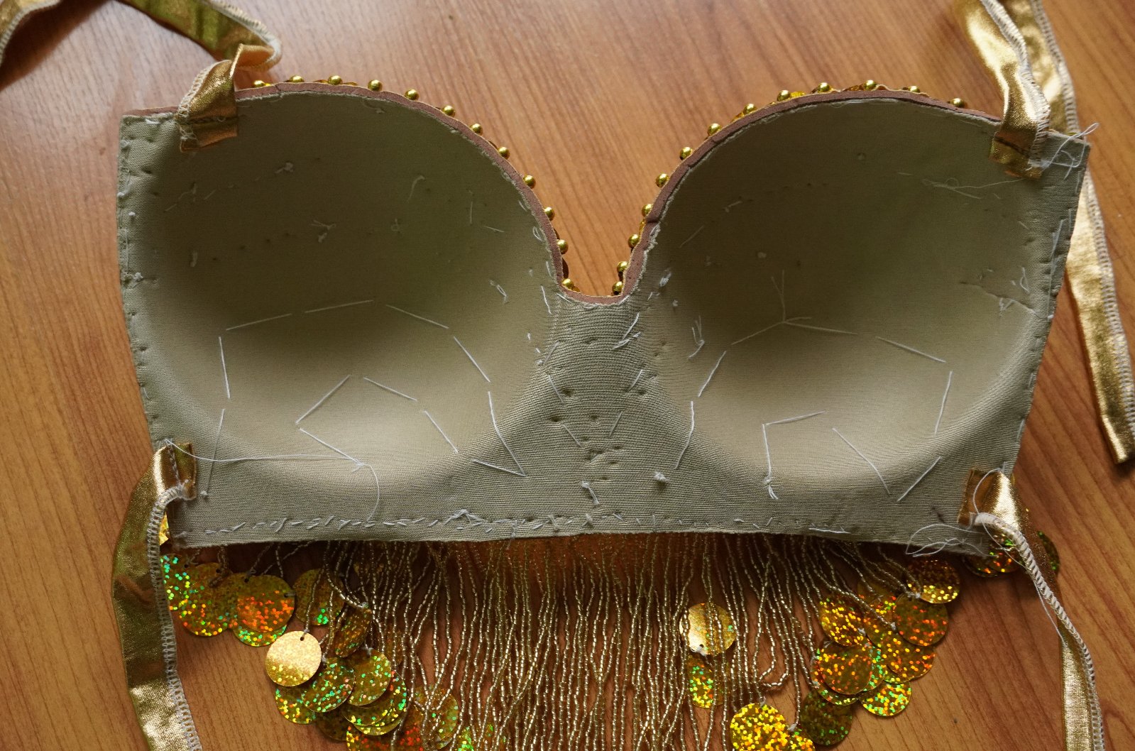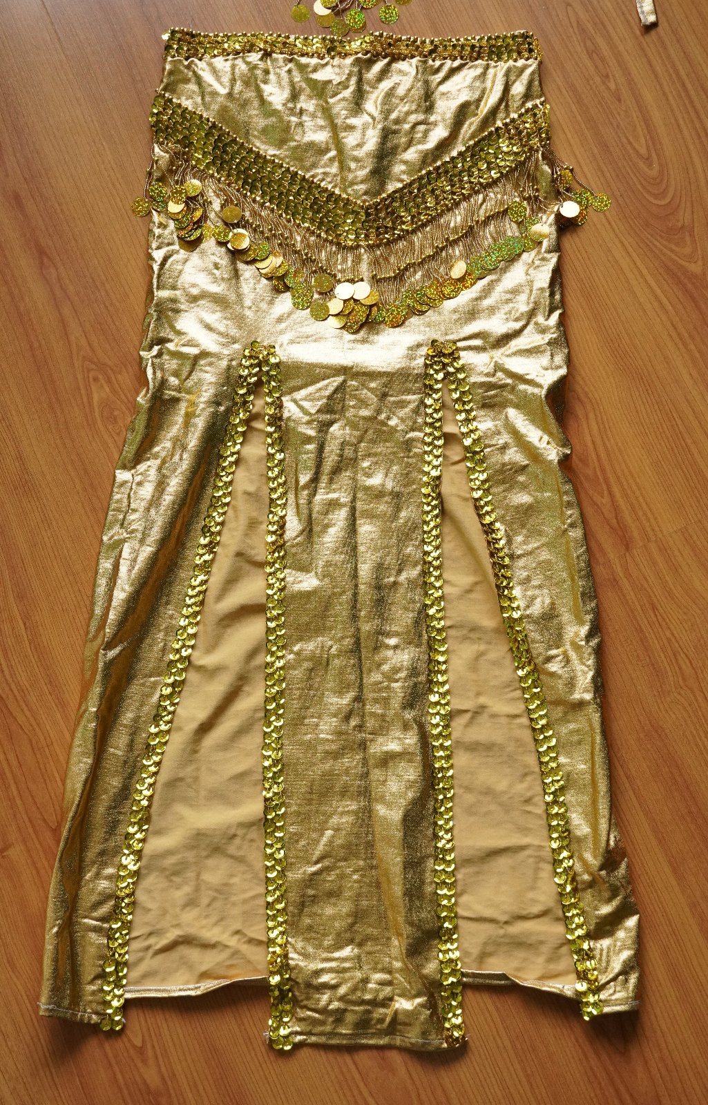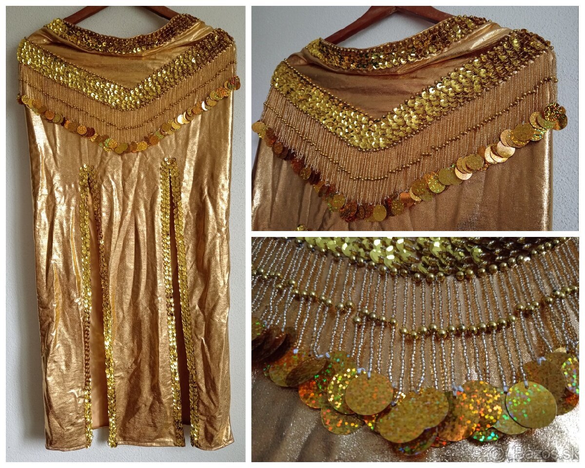 Nový, nenosený, na brušný tanec. Skladá sa z horného dielu, dolného dielu a náhrdelníka. Niektoré časti sa trblietajú. Sukňa má vredu dva rozparky.