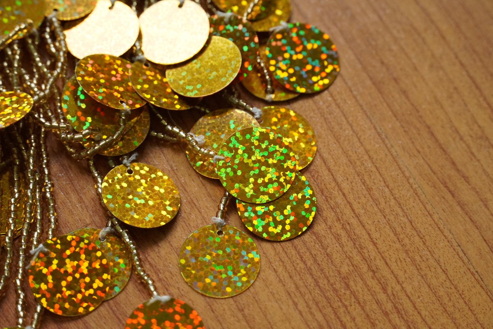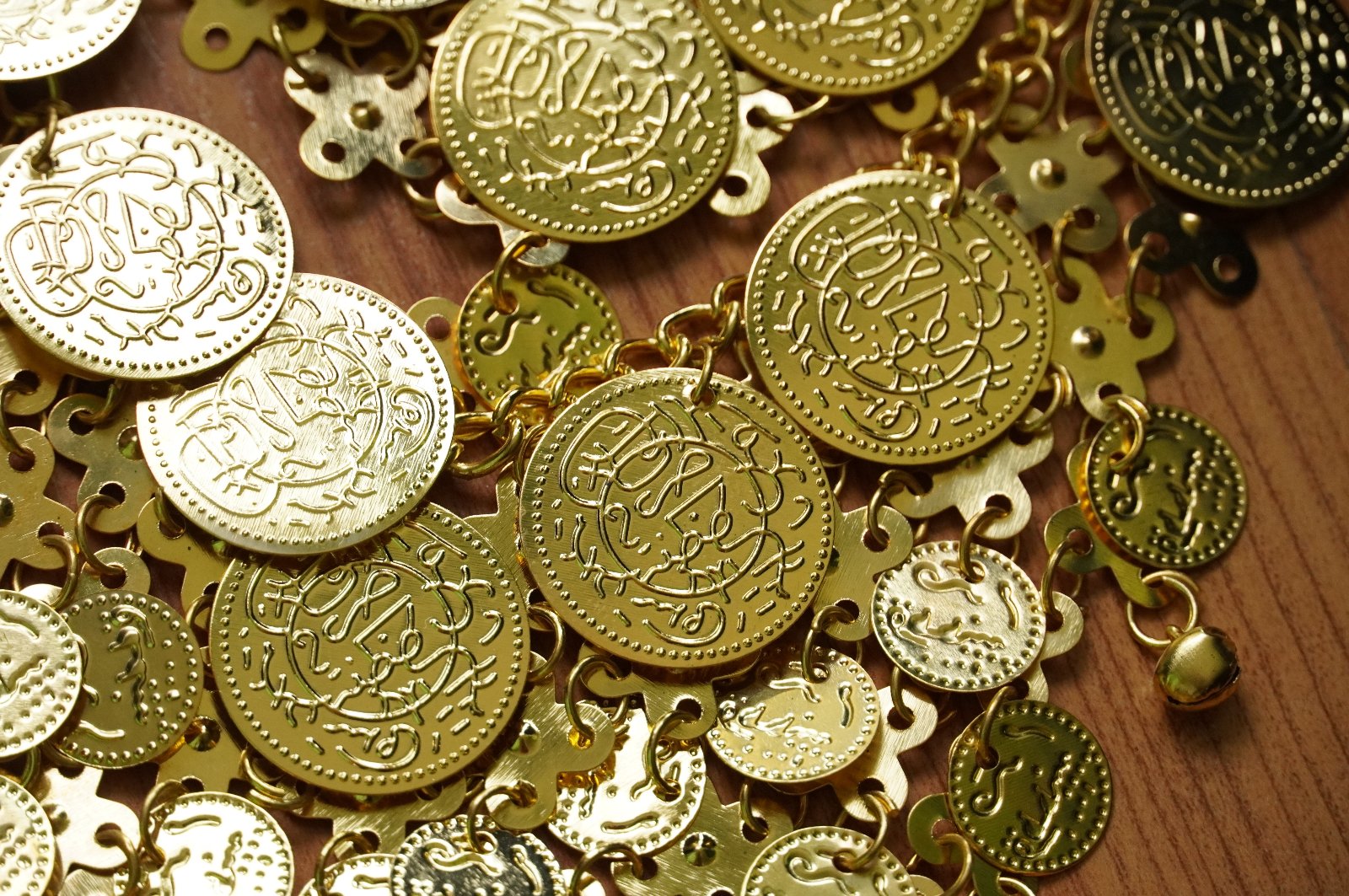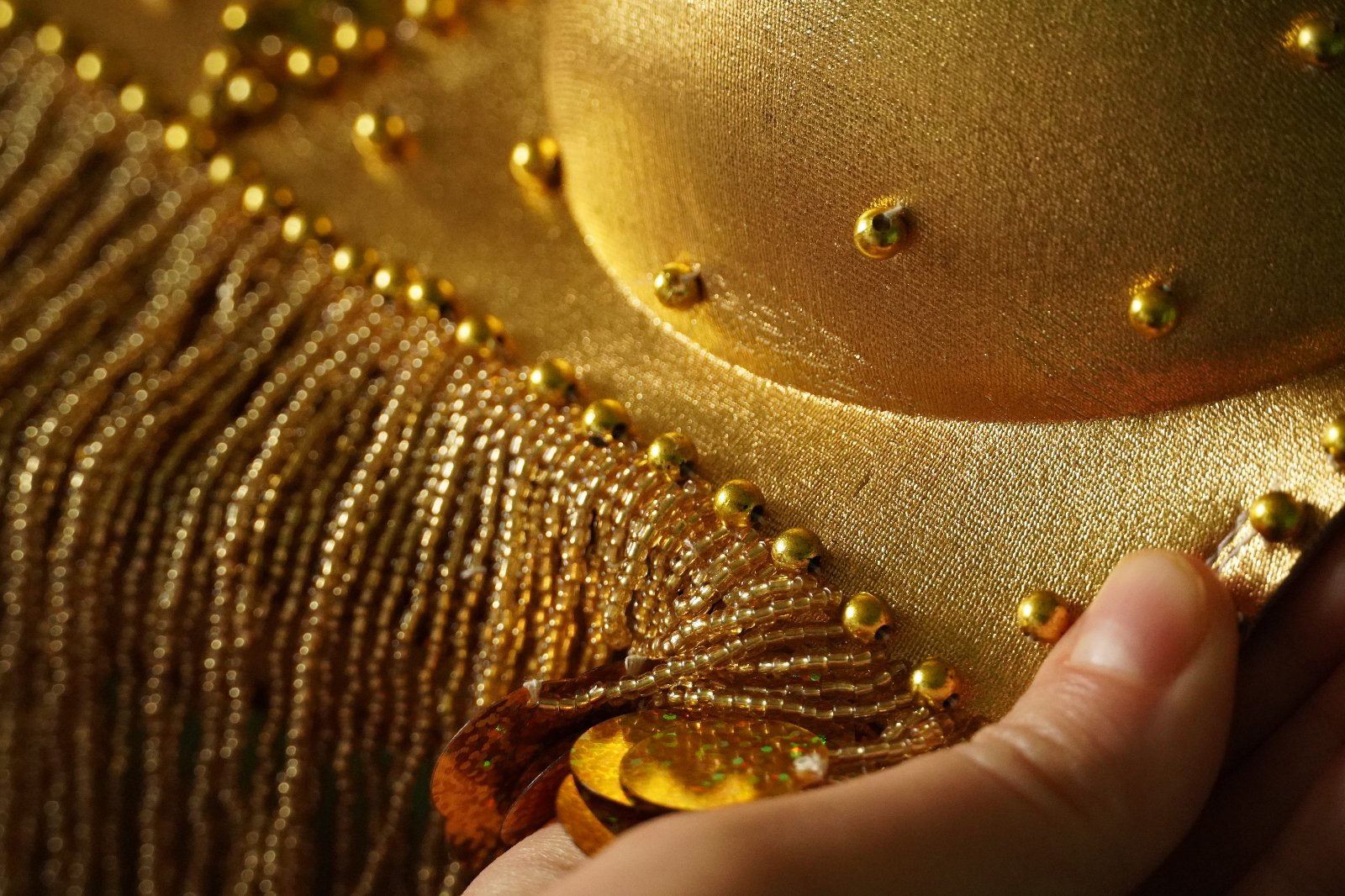 Nový, nenosený, na brušný tanec. Skladá sa z horného dielu, dolného dielu a náhrdelníka. Niektoré časti sa trblietajú. Sukňa má vredu dva rozparky.
