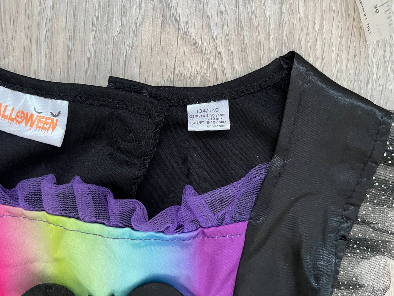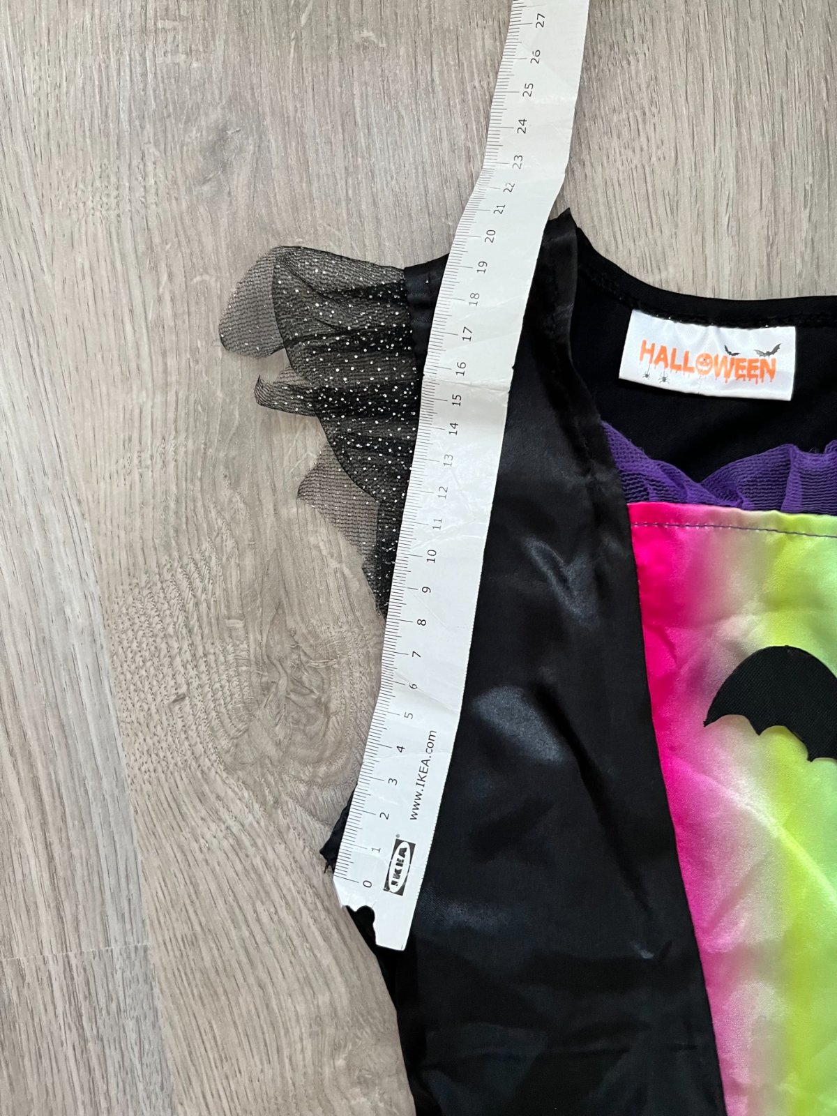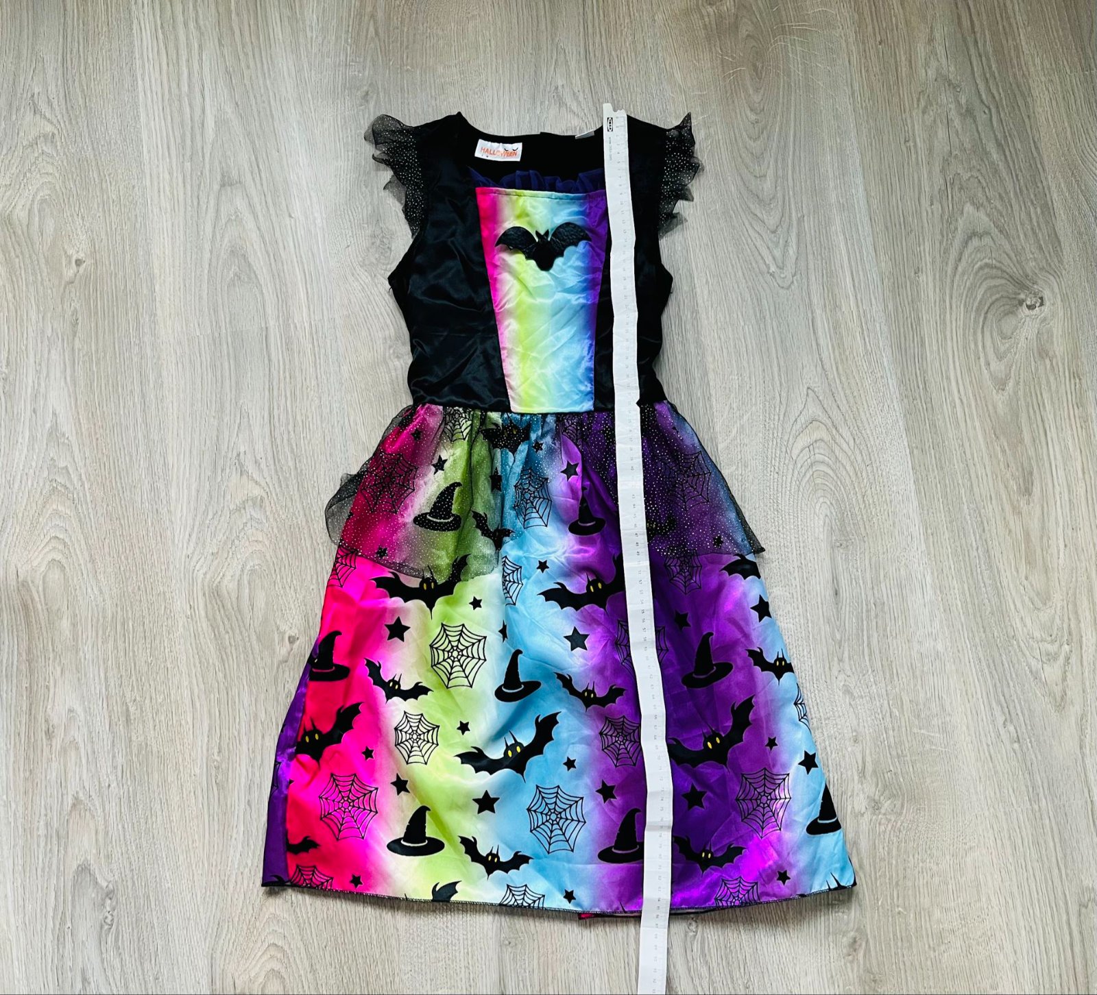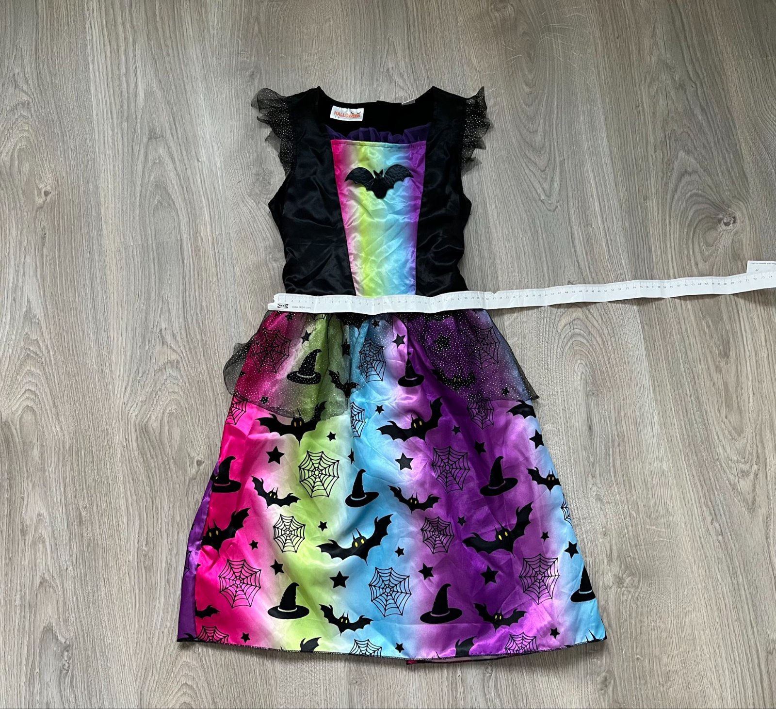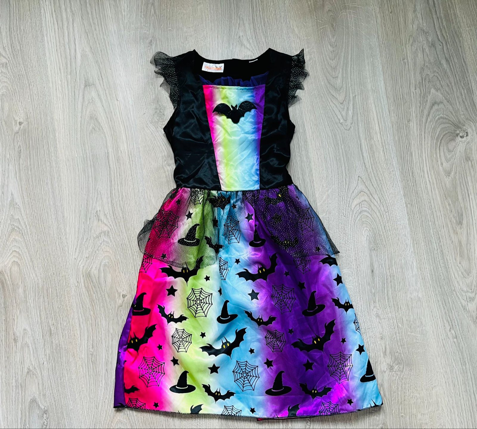 Krásne šaty s dúhovým vzorom a motívmi netopierov, čarodejníckych klobúkov a pavučín.