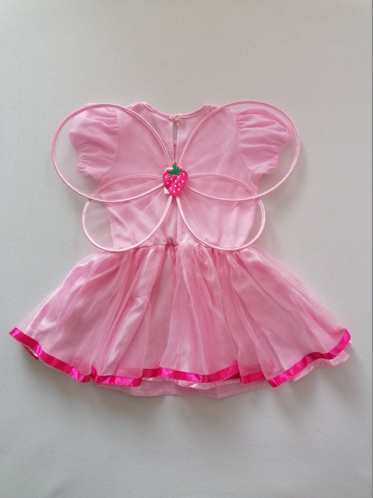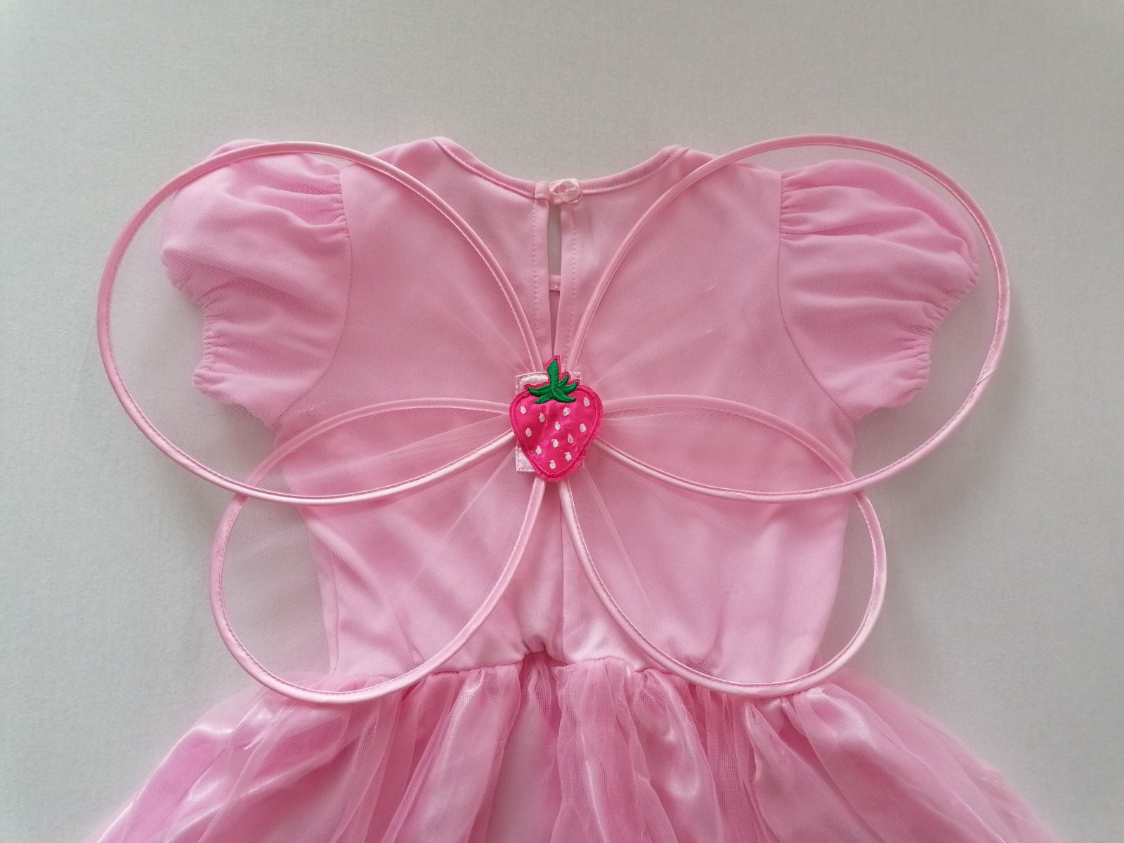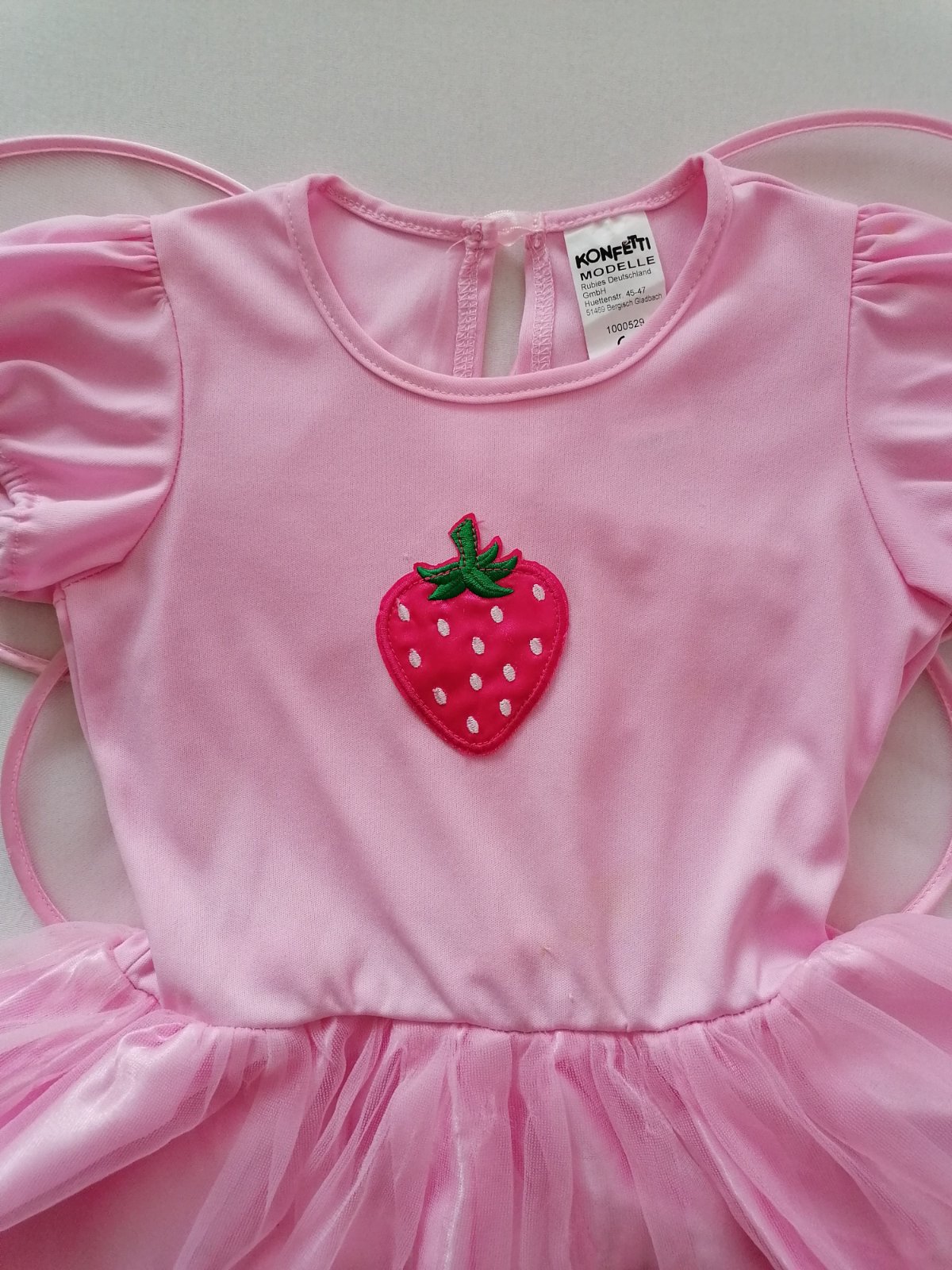 Roztomily kostym Víla Jahôdka :) Su k nemu aj krídla, ktore sa upevnuju na chrbatiku malým suchym zipsom. Spodna sukňova časť kostymu sa krasne točí. Velkost na stitku 104 - sedi v pohode na 98-104-110.