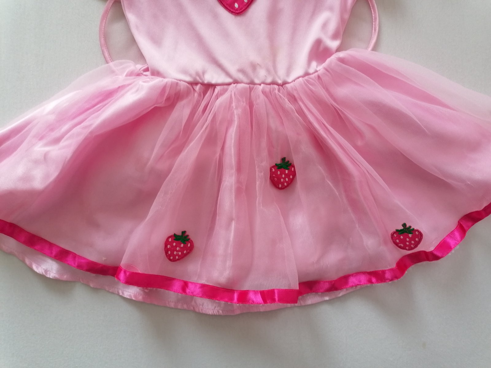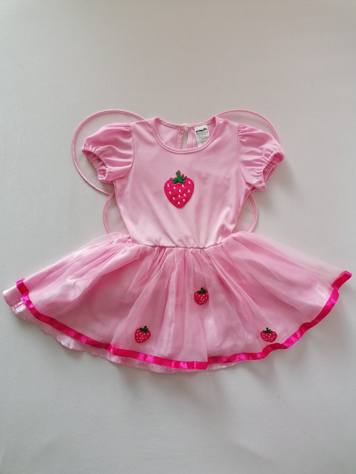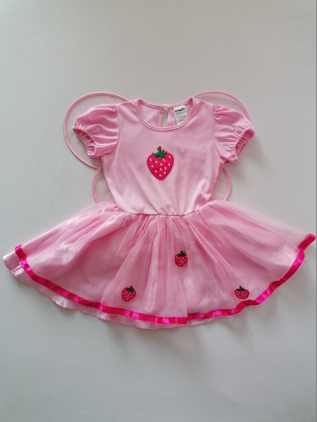Roztomily kostym Víla Jahôdka :) Su k nemu aj krídla, ktore sa upevnuju na chrbatiku malým suchym zipsom. Spodna sukňova časť kostymu sa krasne točí. Velkost na stitku 104 - sedi v pohode na 98-104-110.