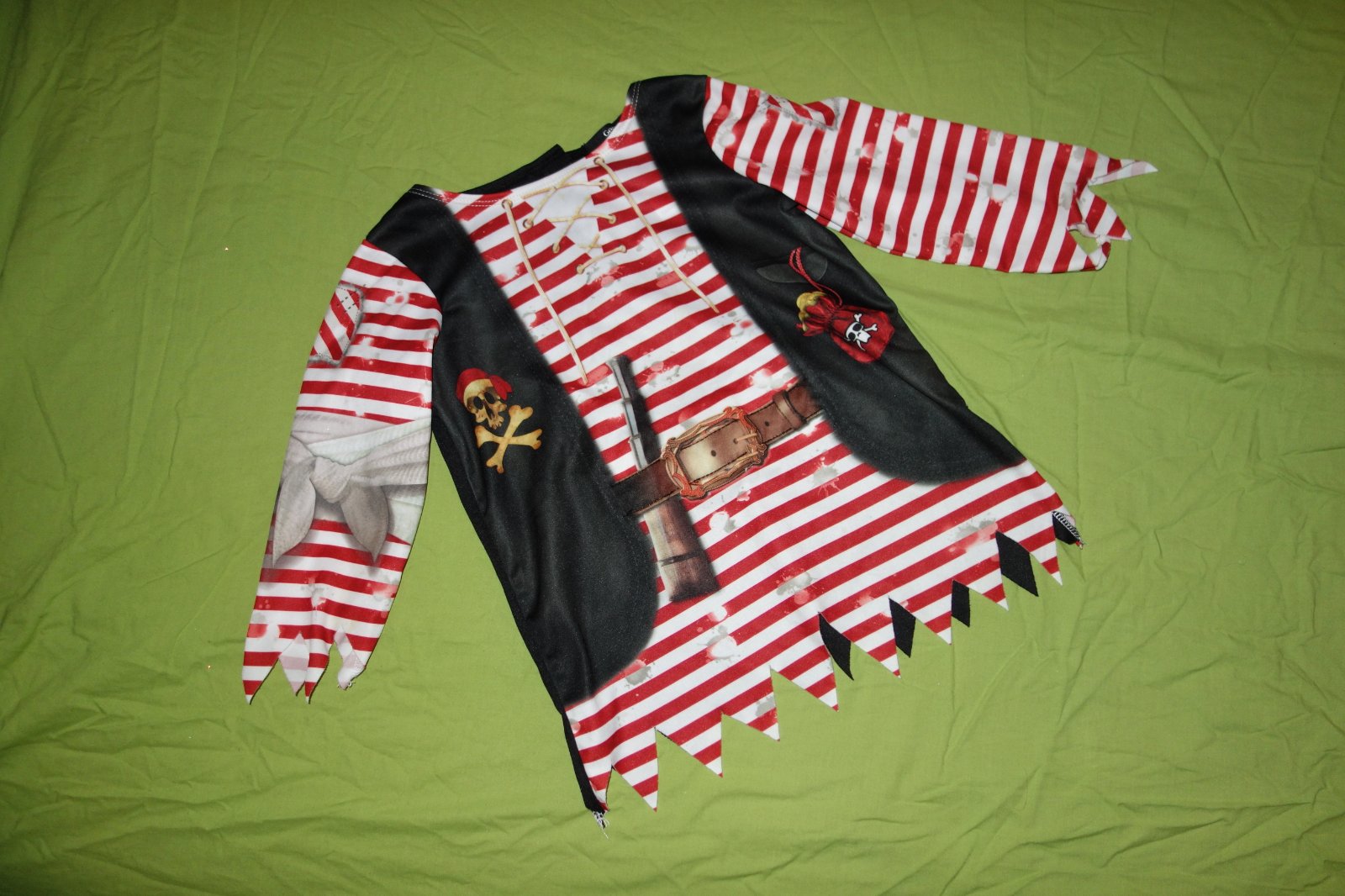 Pekny kostymcek pre pirata vo velmi dobrom stave- chybaju nohavice. Je urceny na vek 3-4roky.
