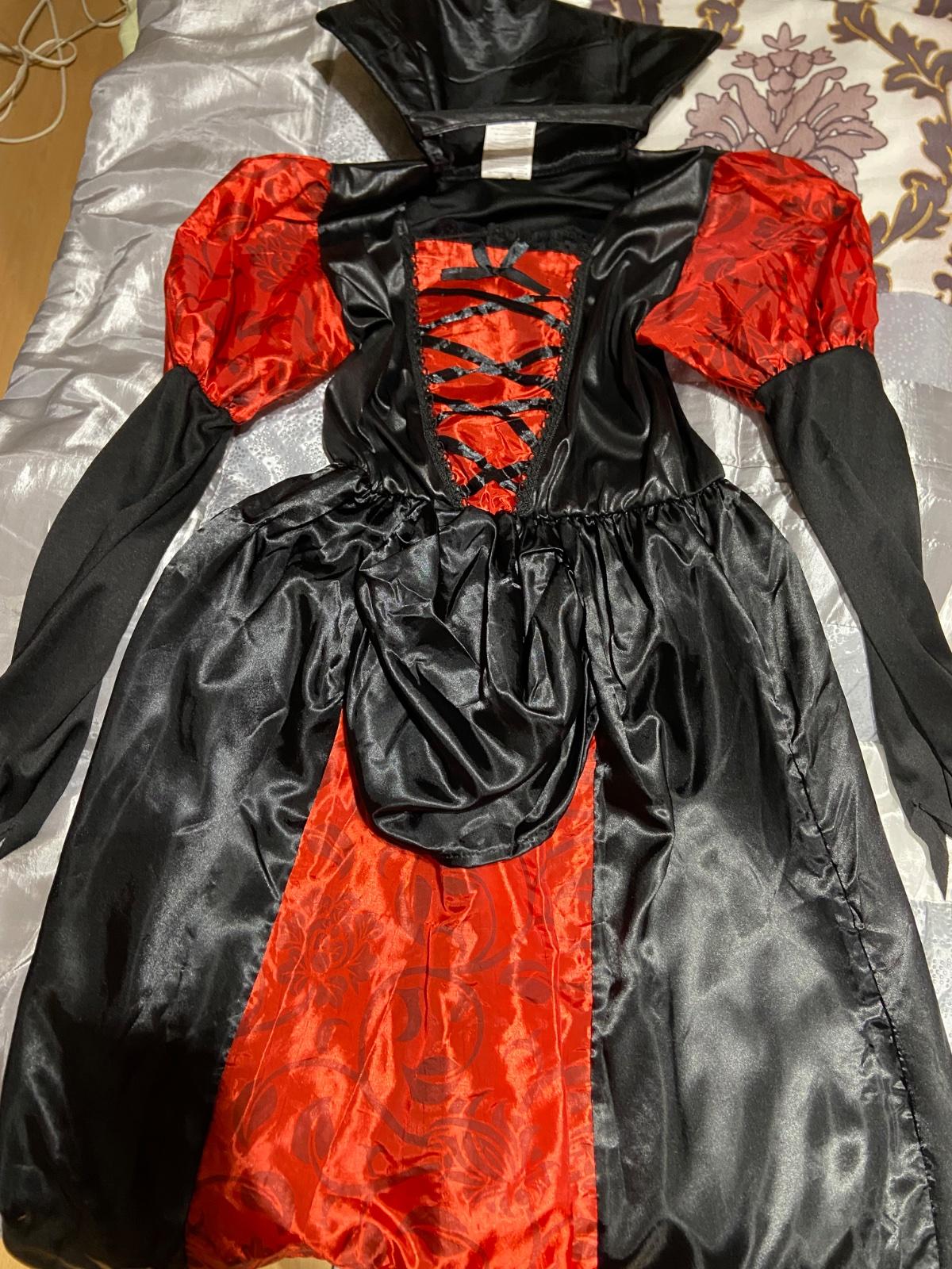 Šaty na karneval / halloween. Sedia na veľkosť 116/122 (5 - 7 rokov). Boli pár krát oblečené, ale na spodnom leme majú poškodenie (viď. posledná foto). Inak sú v dobrom stave.