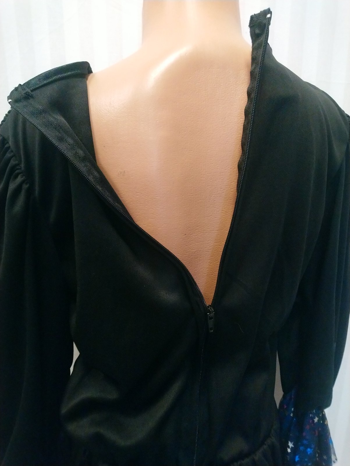 1. čierno modré šaty, modrá ozdobená farebnými hviezdičkami, vrchná časť riasená, v páse na gumičku, vzadu zapínanie na zips, šaty sú oveľa krajšie ako na fotkách lebo bábka je veľkostne o niečo menšia ako šaty,