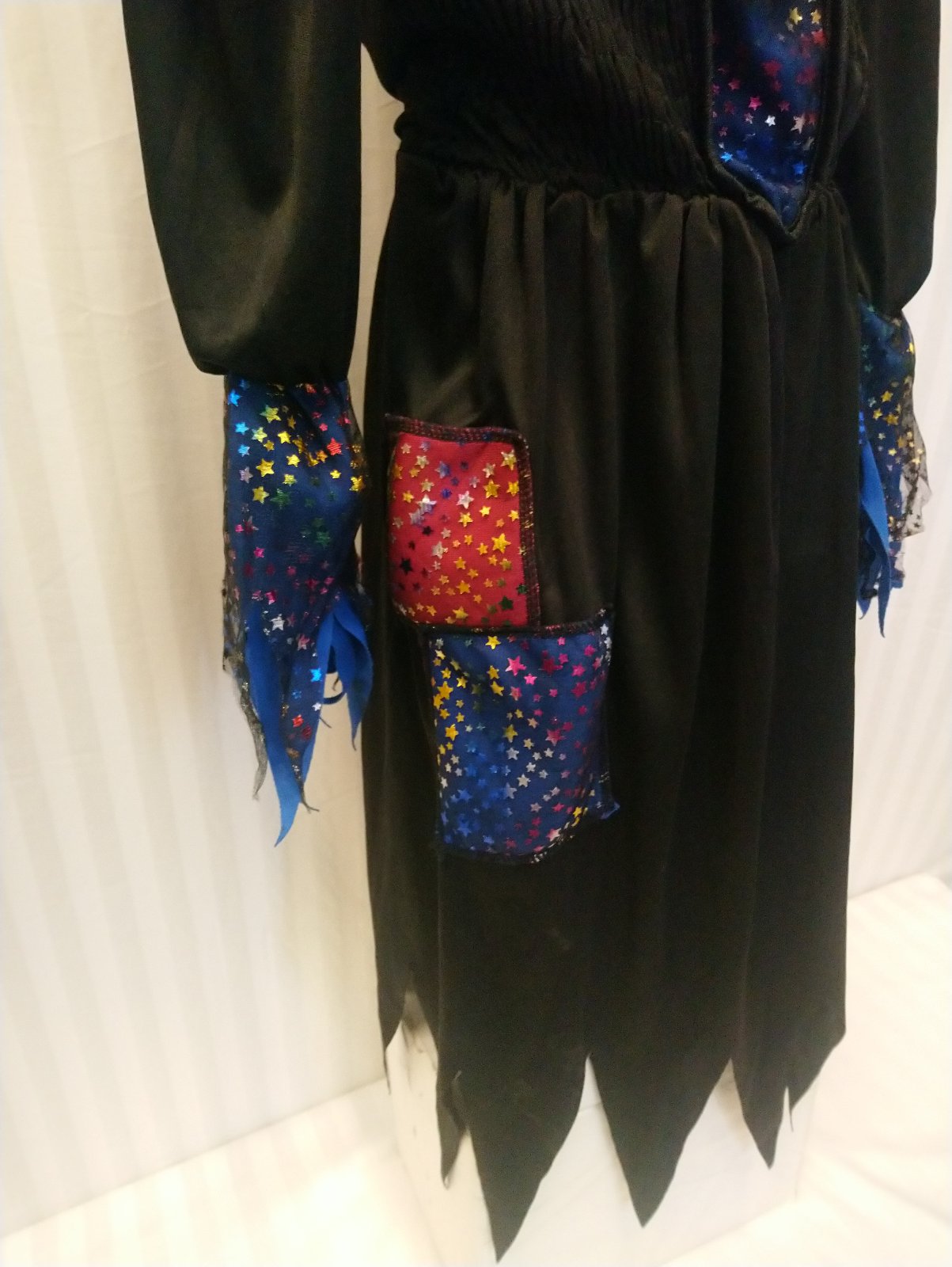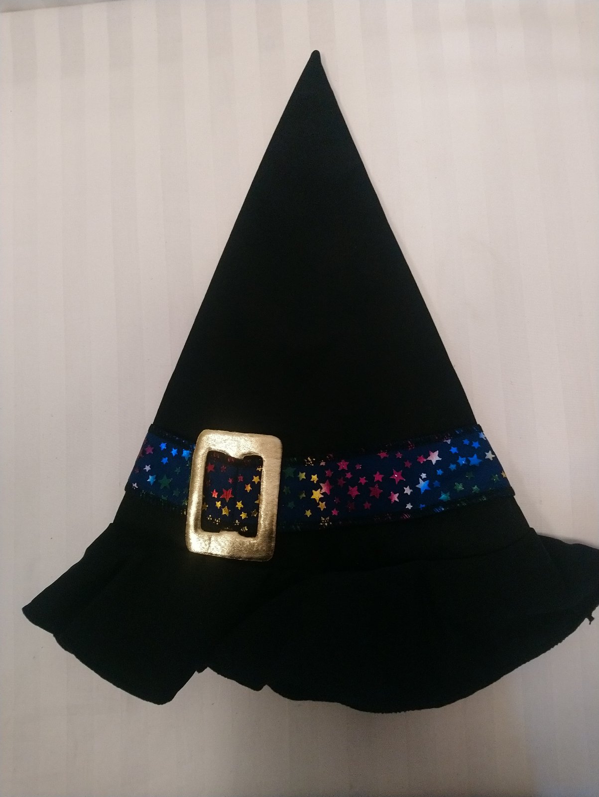 2. čierny čarodejnícky klobúk s modrou stuhou s farebnými hviezdičkami,