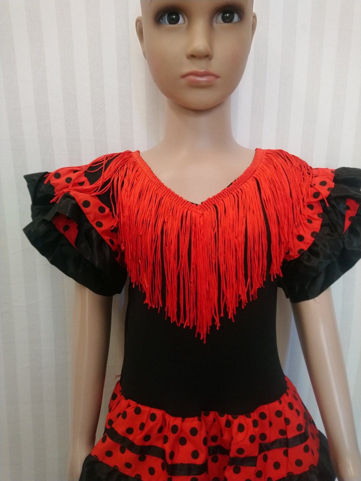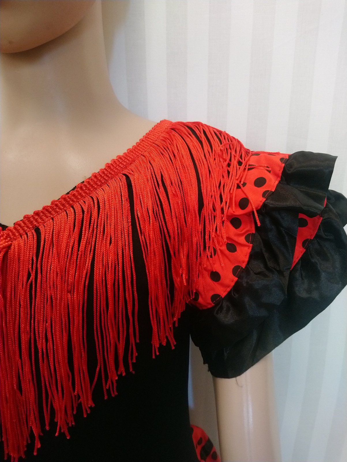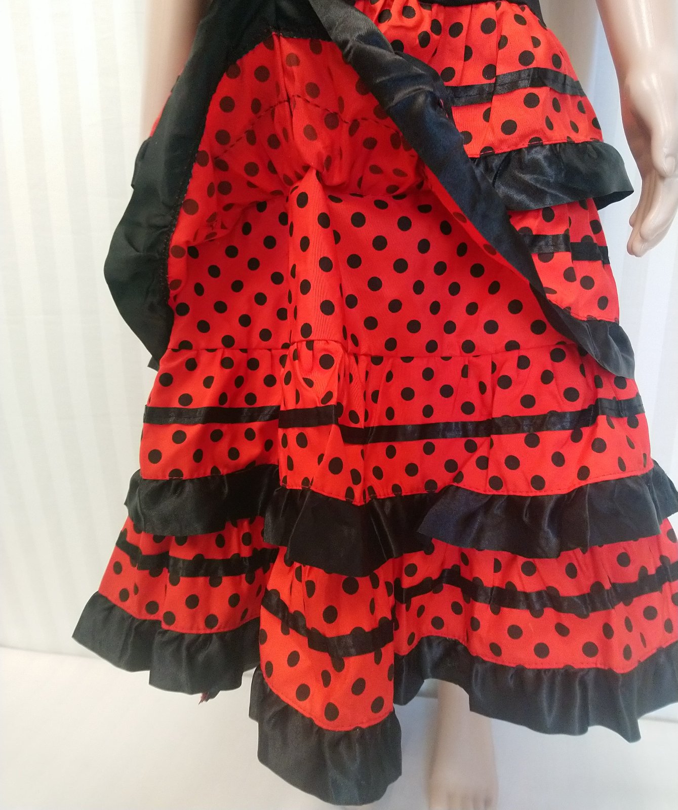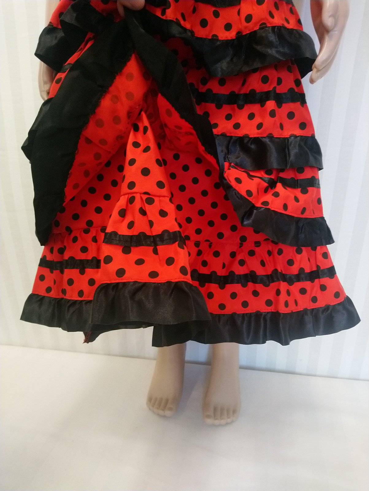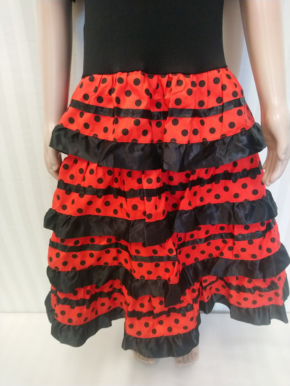 Nový kostým Flamenco tanečnica Apríl Sevilla, krásne tradičné červeno čierne flamenco šaty s pružným živôtikom (vrchná časť je elastická), s vrstvami saténových lemovaných ozdôb a výstrihom so strapcami, volánovou sukňou,