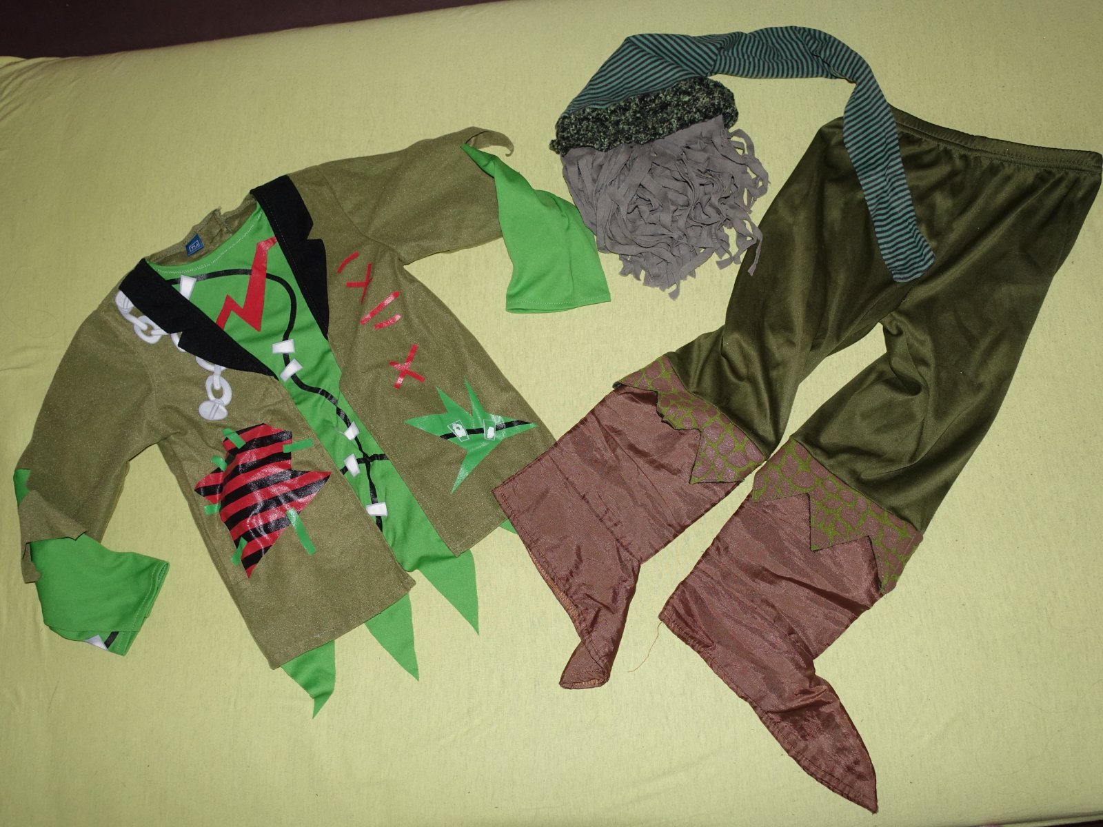 Pekny kostymcek vo velmi dobrom stave (nohavice su na spodku trocha zoslapane (vid foto). Veci nepatria k sebe, ale syn to mal na karnevale takto spolu. Je urceny na vek 5-7rokov.