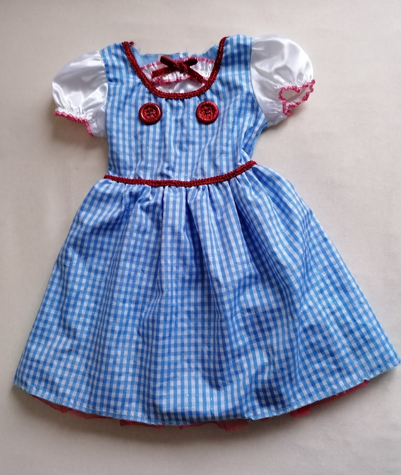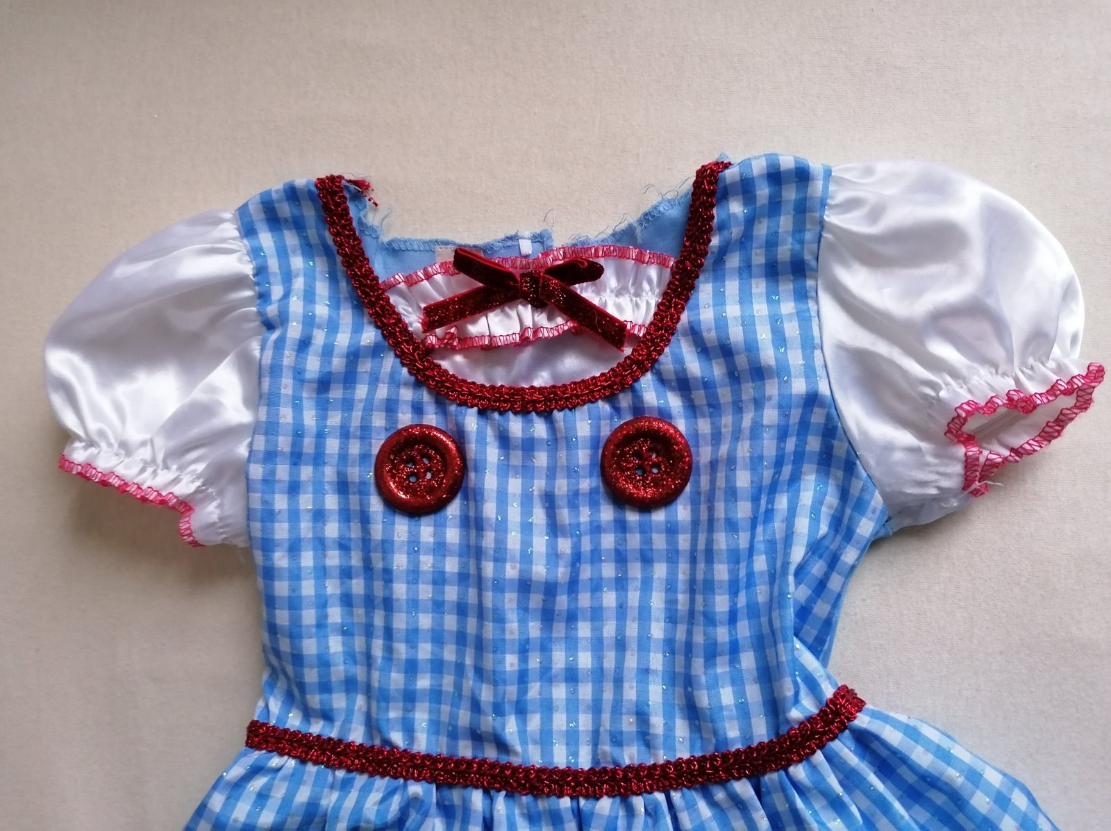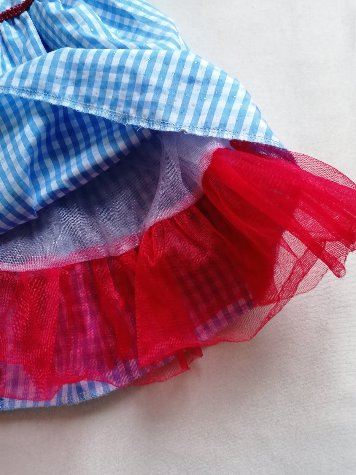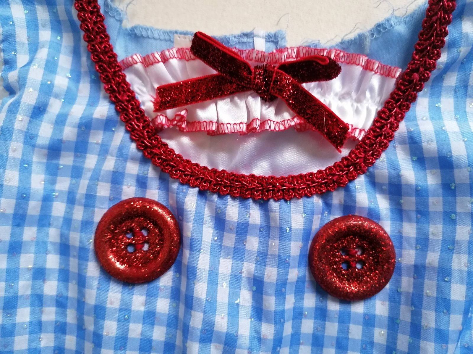 Krásne šatičky Dorothy sú celé posiaté trblietavymi kamienkami a zdobené výraznou lesklou stužkou a gombíkmi v karmínovo-červenej farbe. Šaty sú nekrčivé. Živôtik vzadu je elastický- zapína sa na 2 suché zipsy. Sukňa má nazberkanú spodničku- aby držala objem.