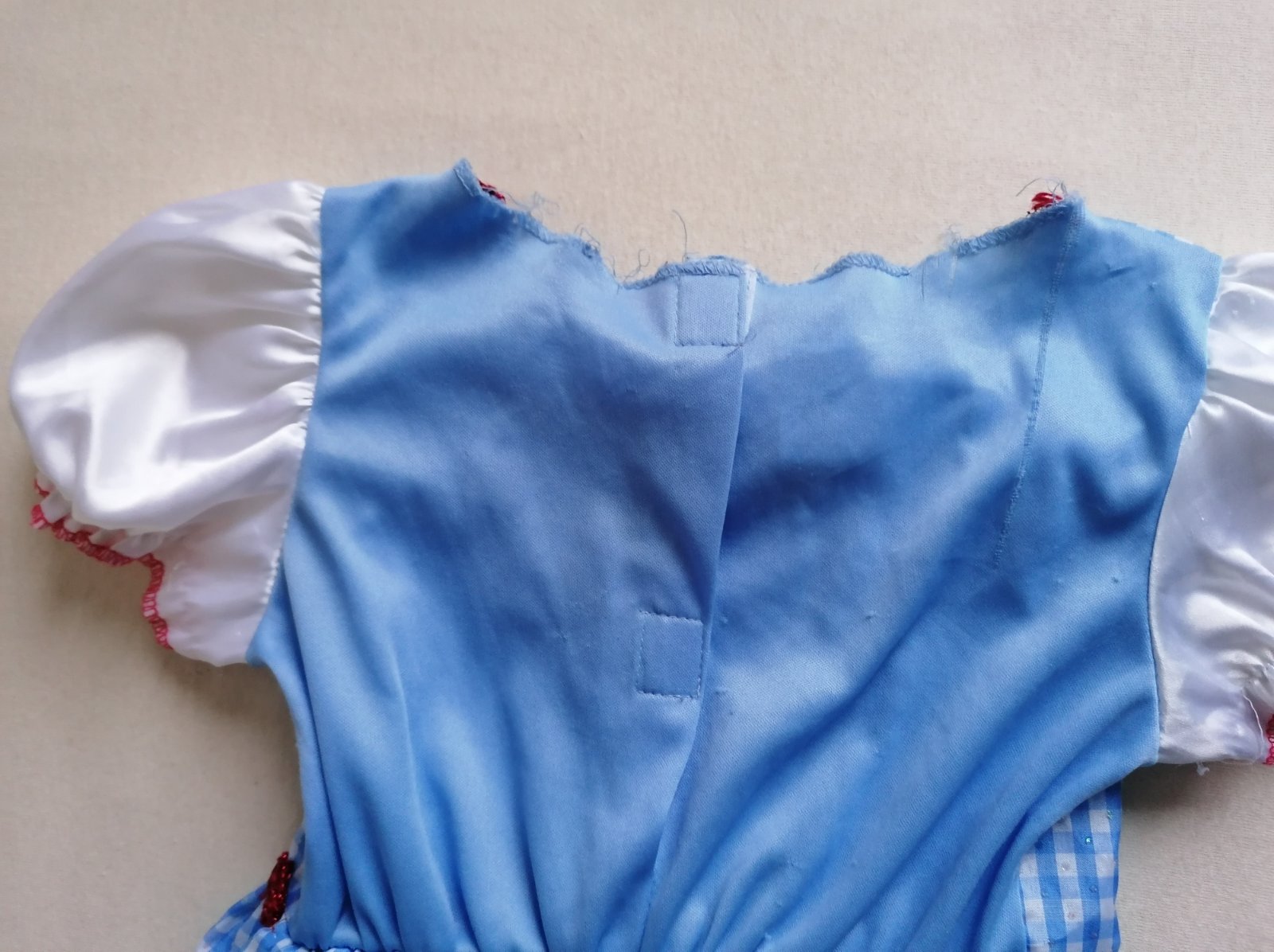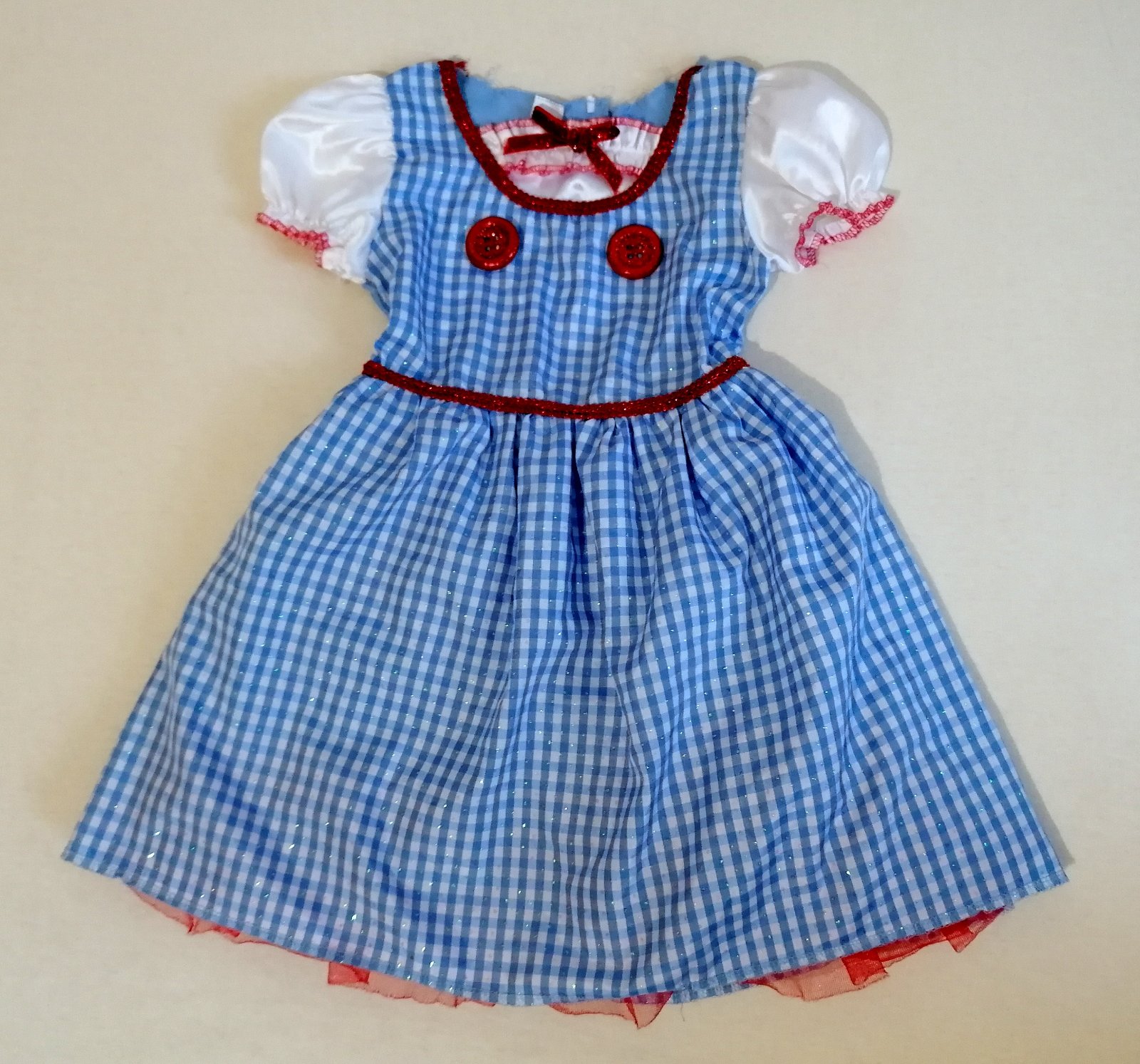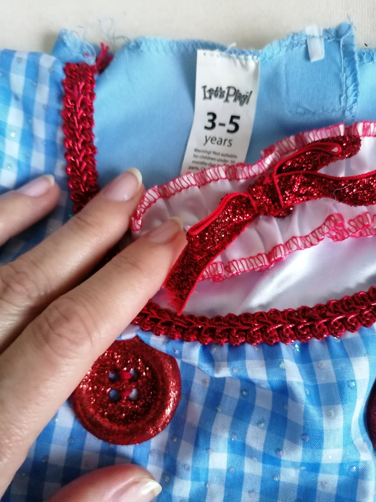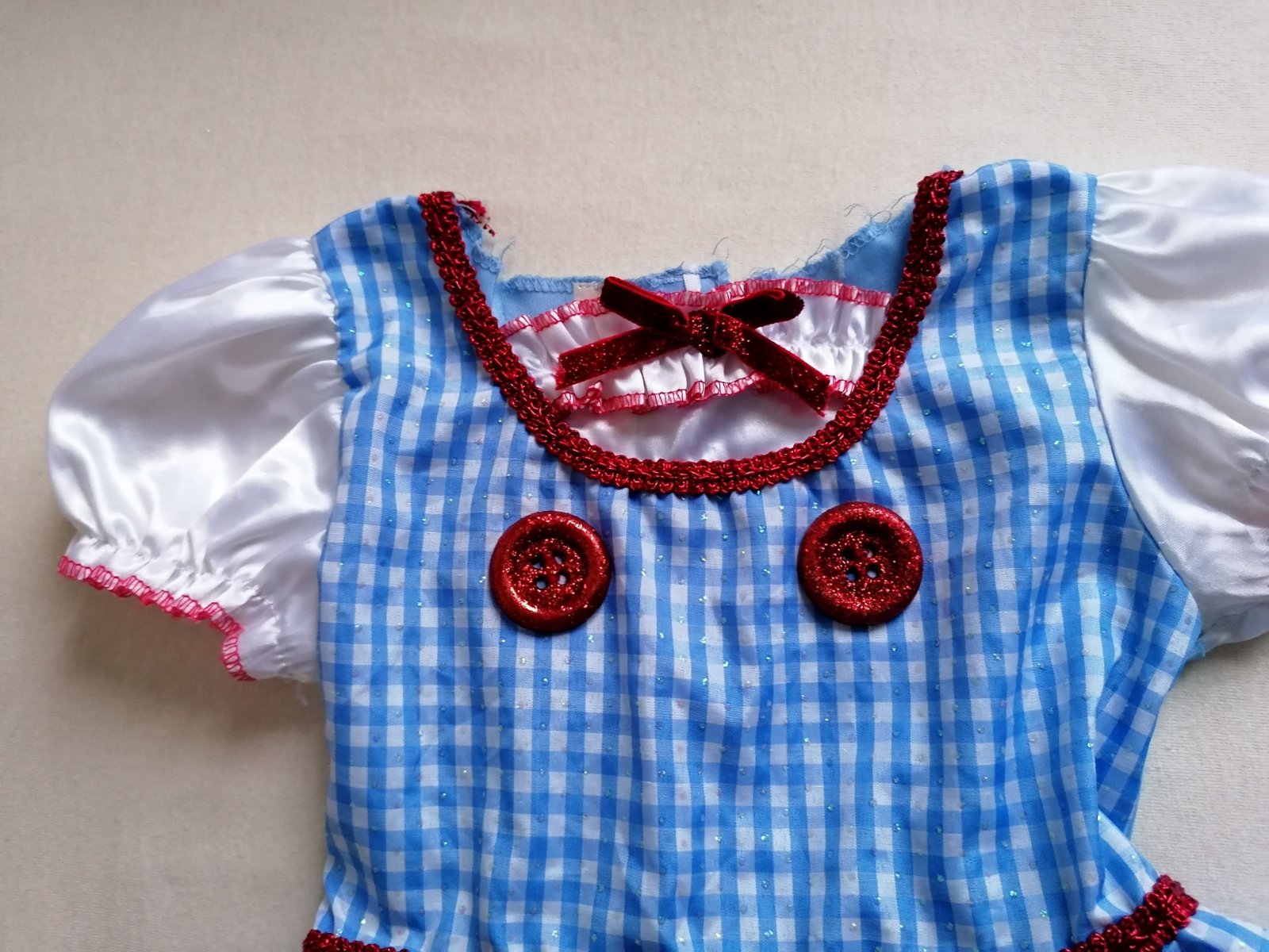 Krásne šatičky Dorothy sú celé posiaté trblietavymi kamienkami a zdobené výraznou lesklou stužkou a gombíkmi v karmínovo-červenej farbe. Šaty sú nekrčivé. Živôtik vzadu je elastický- zapína sa na 2 suché zipsy. Sukňa má nazberkanú spodničku- aby držala objem.