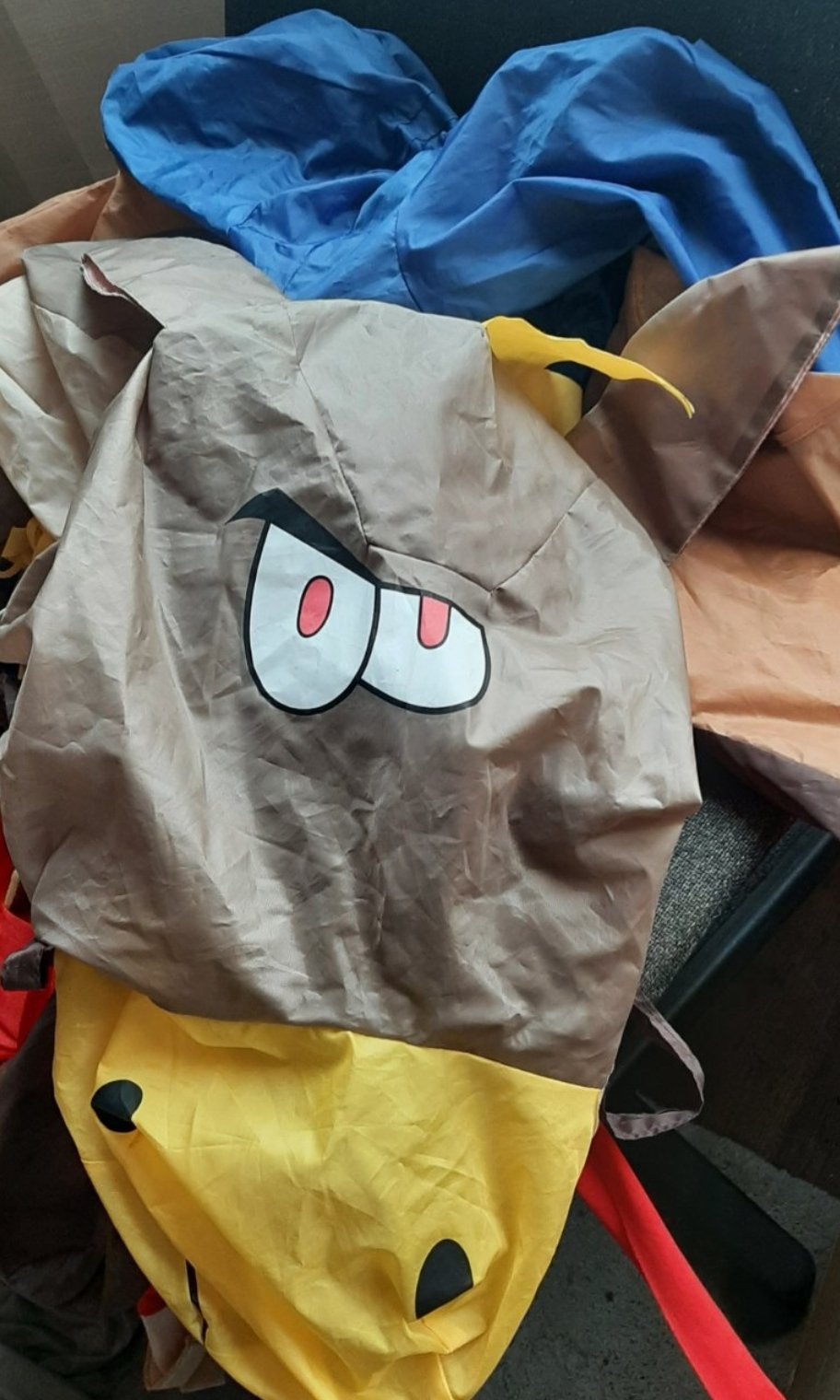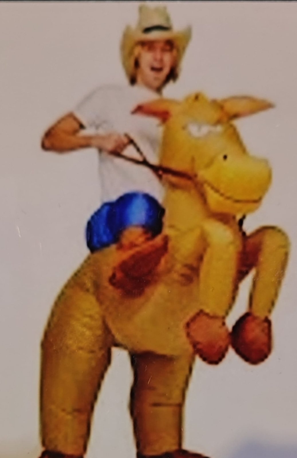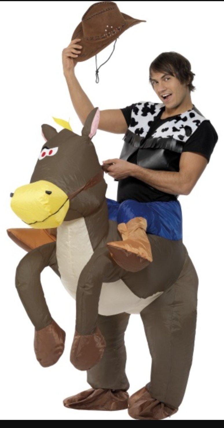 Nafukovací srandovný kostým pre pána alebo väčšieho chlapca. Raz použitý, v perfektnom stave. V páse sa stiahne, aby neunikal vzduch a počas používania je celý čas nafukovaný pomocou strojčeka. Chlap má svoje nohy akoby v zadných nohách zvieraťa, ostatné je nafuknuté. Je to parádny kostým, úspech zaručený. Klobúk je ako na tretej fotke. Do strojceka je potrebne dat tuskove baterky.