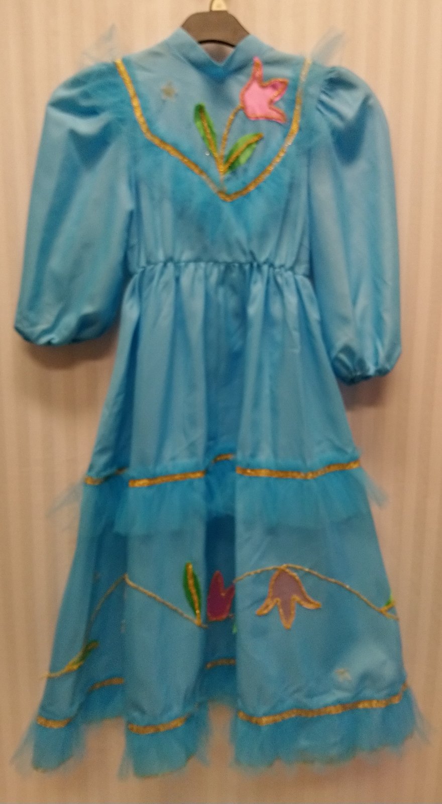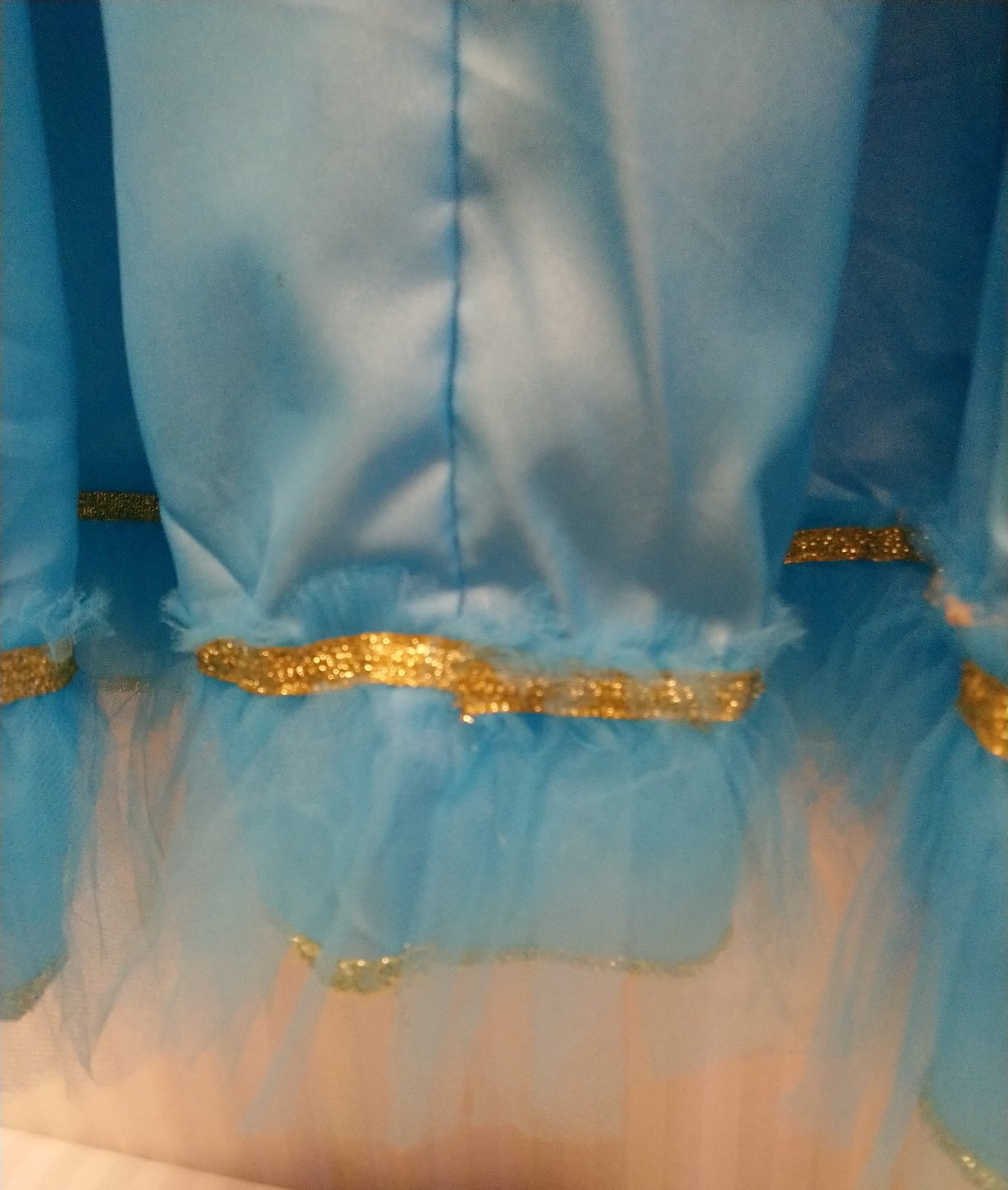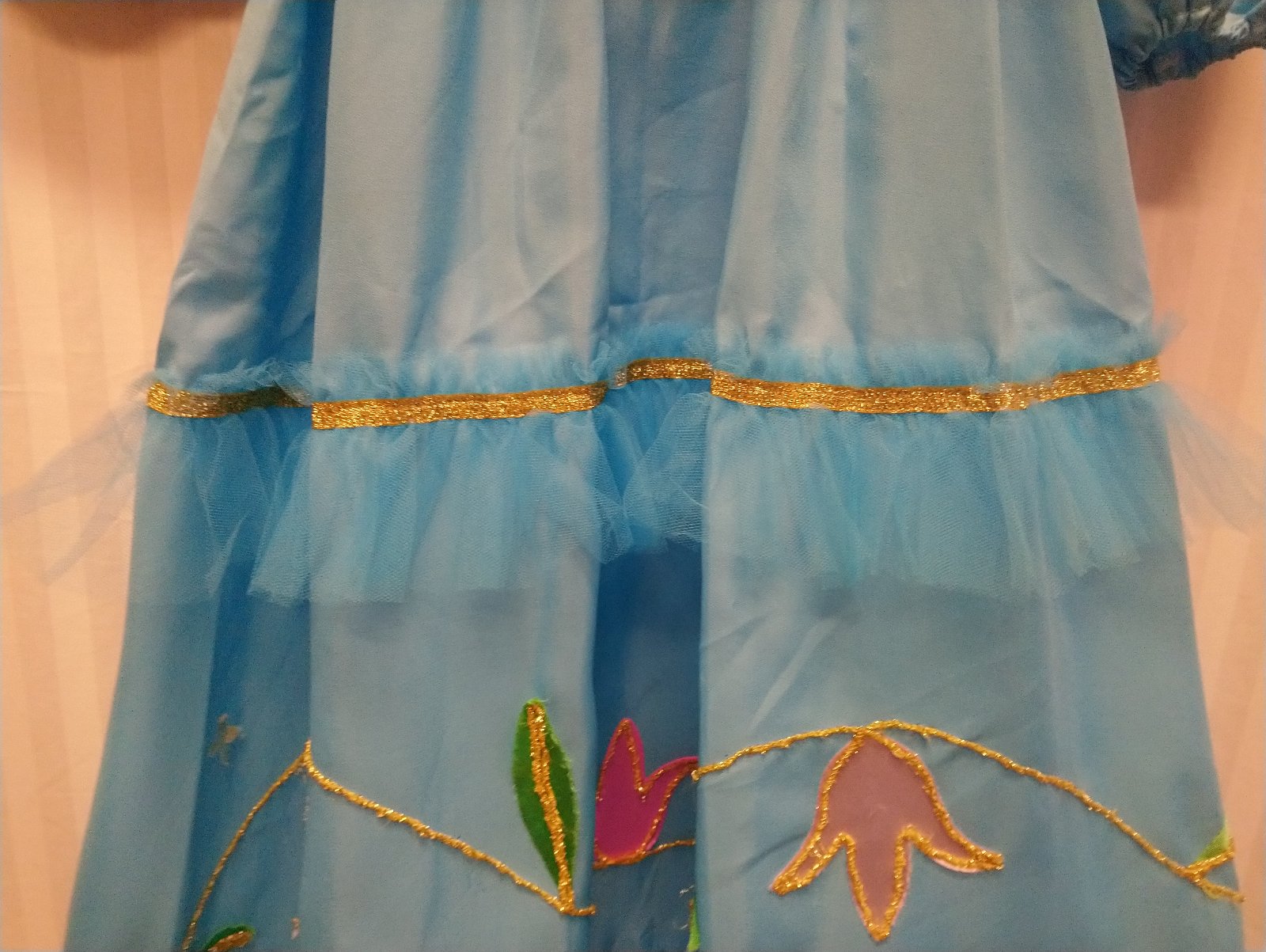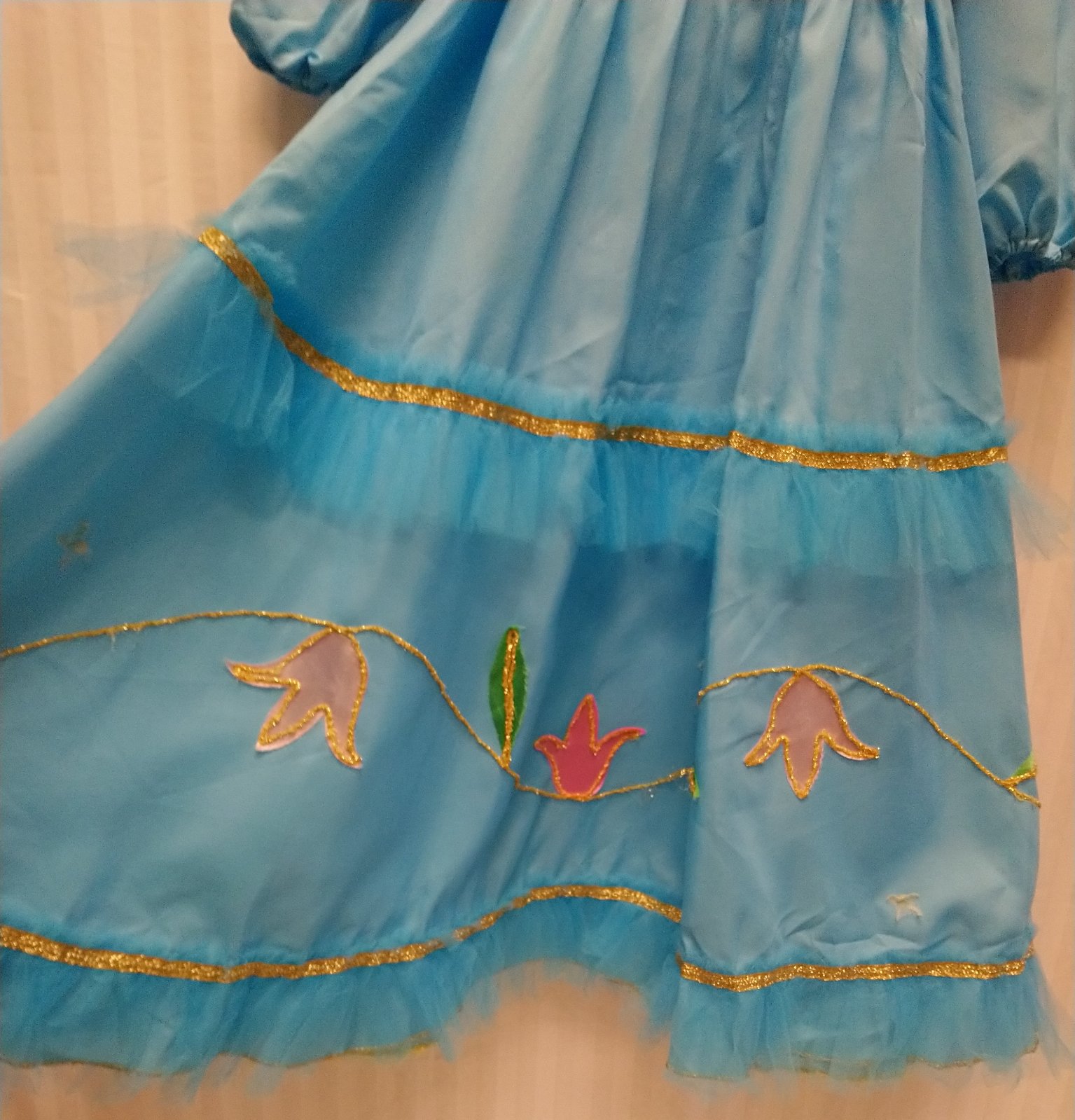 kostým Princezná, modro zlaté šaty, obsahuje krásne modré dlhé šaty, v páse na gumu, vzadu zapínanie na gombíky, ozdobené kvetinami, zlatým lemovaním,