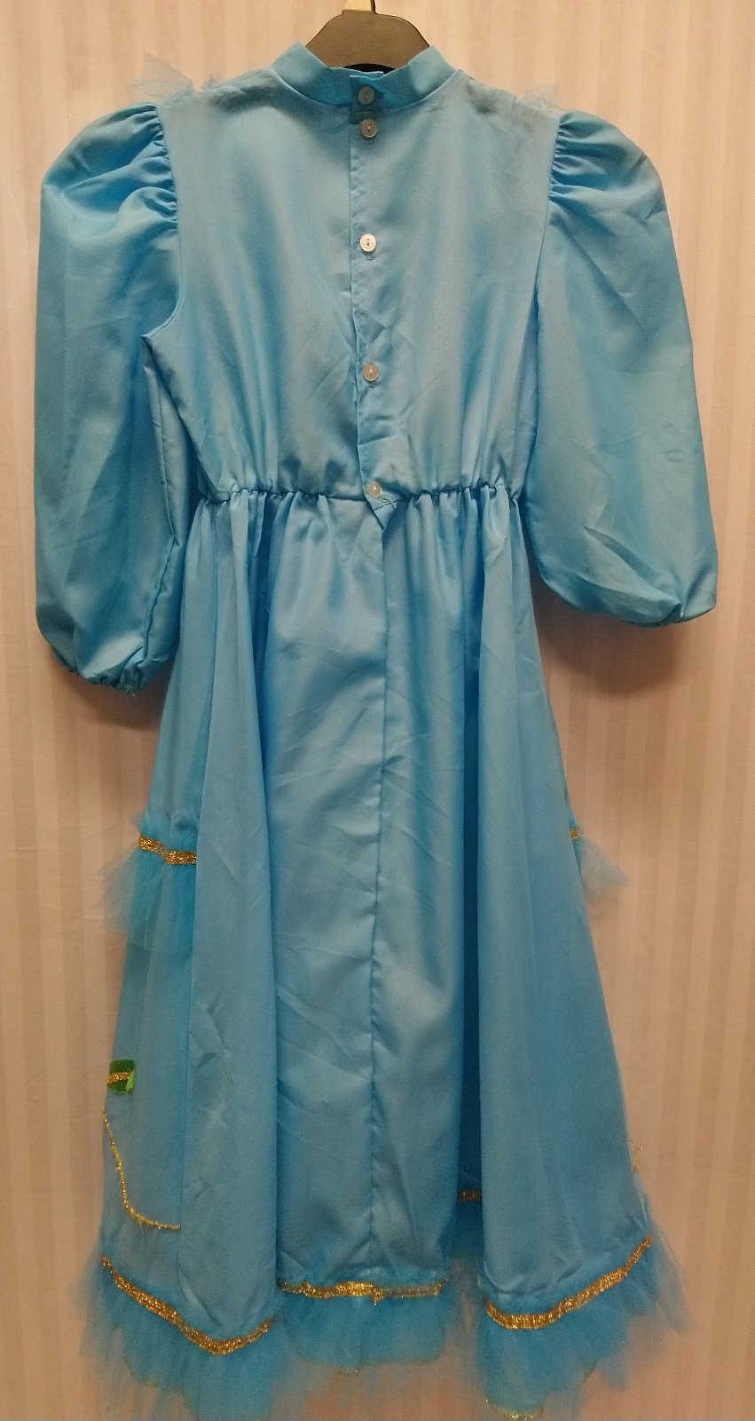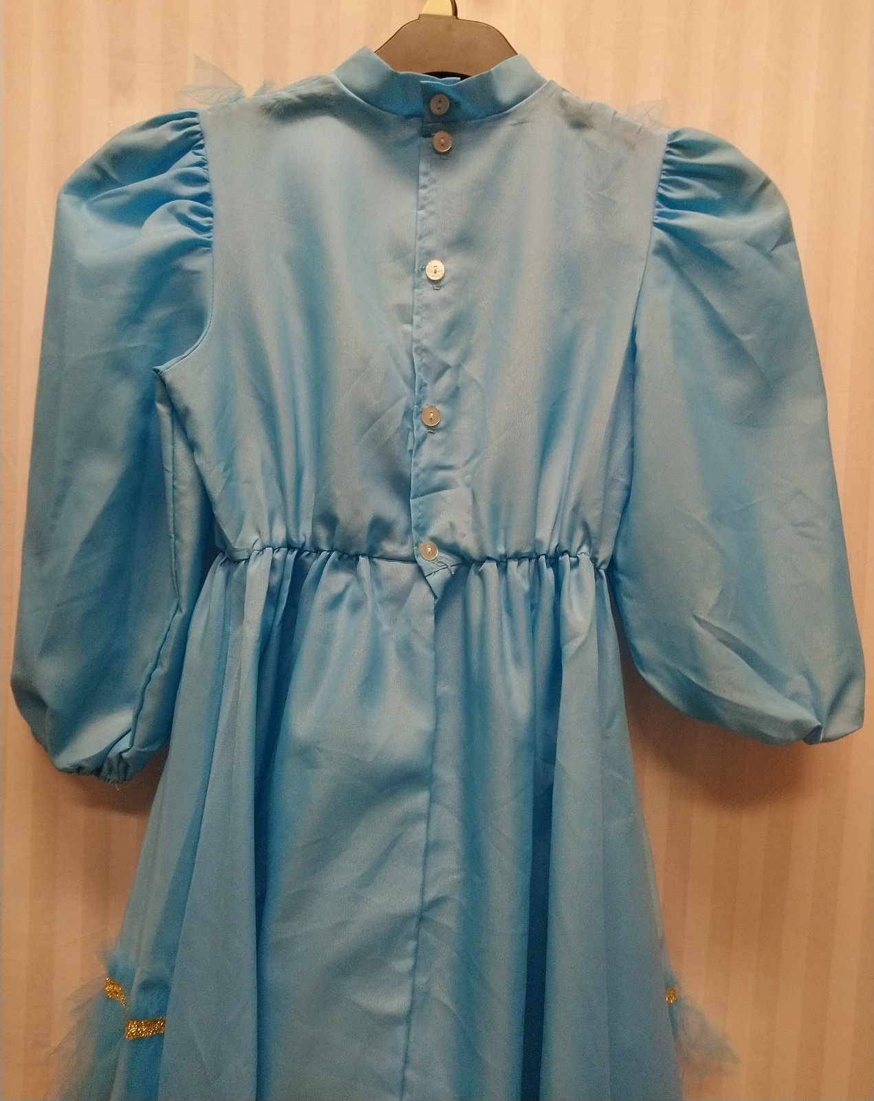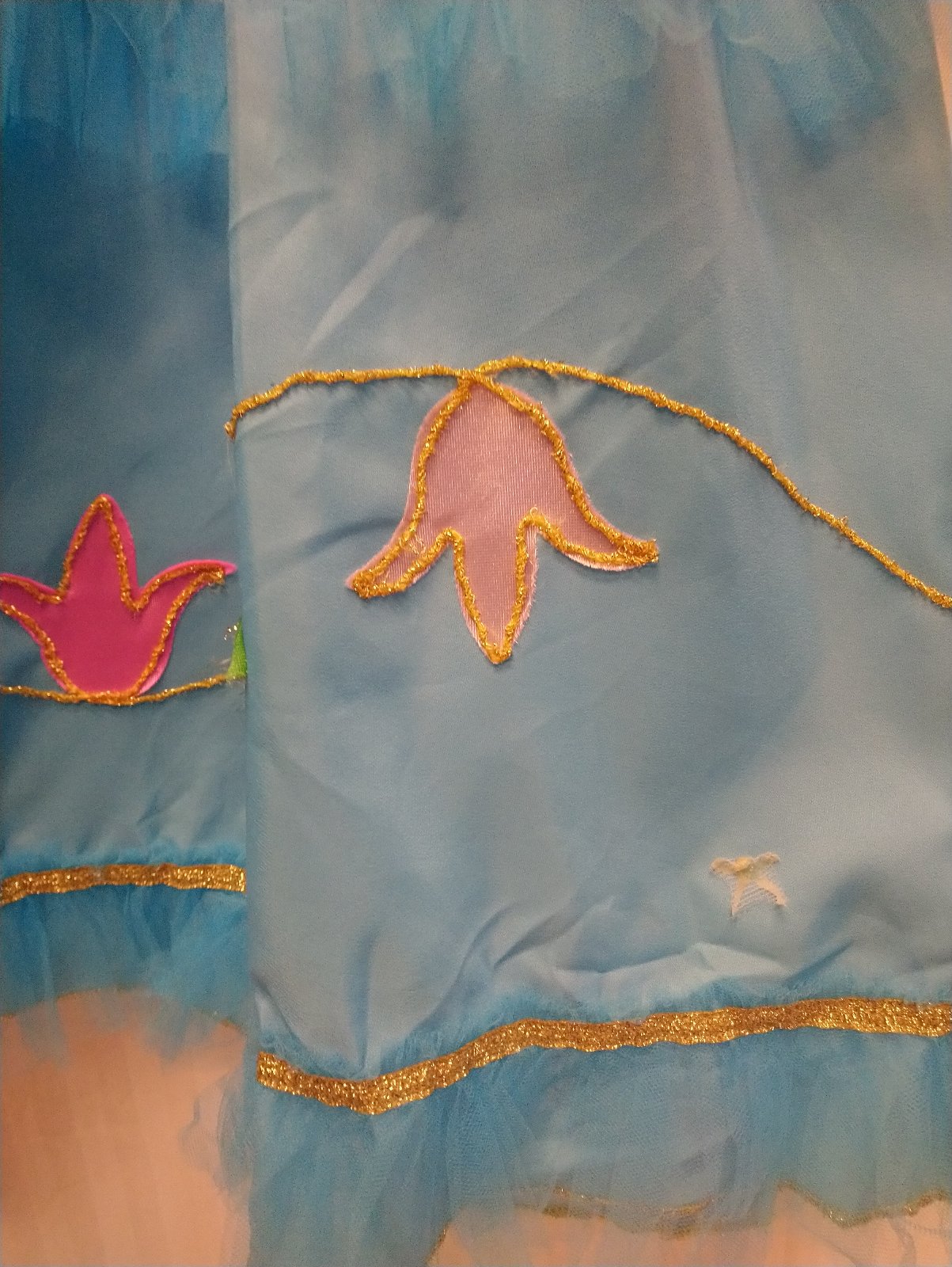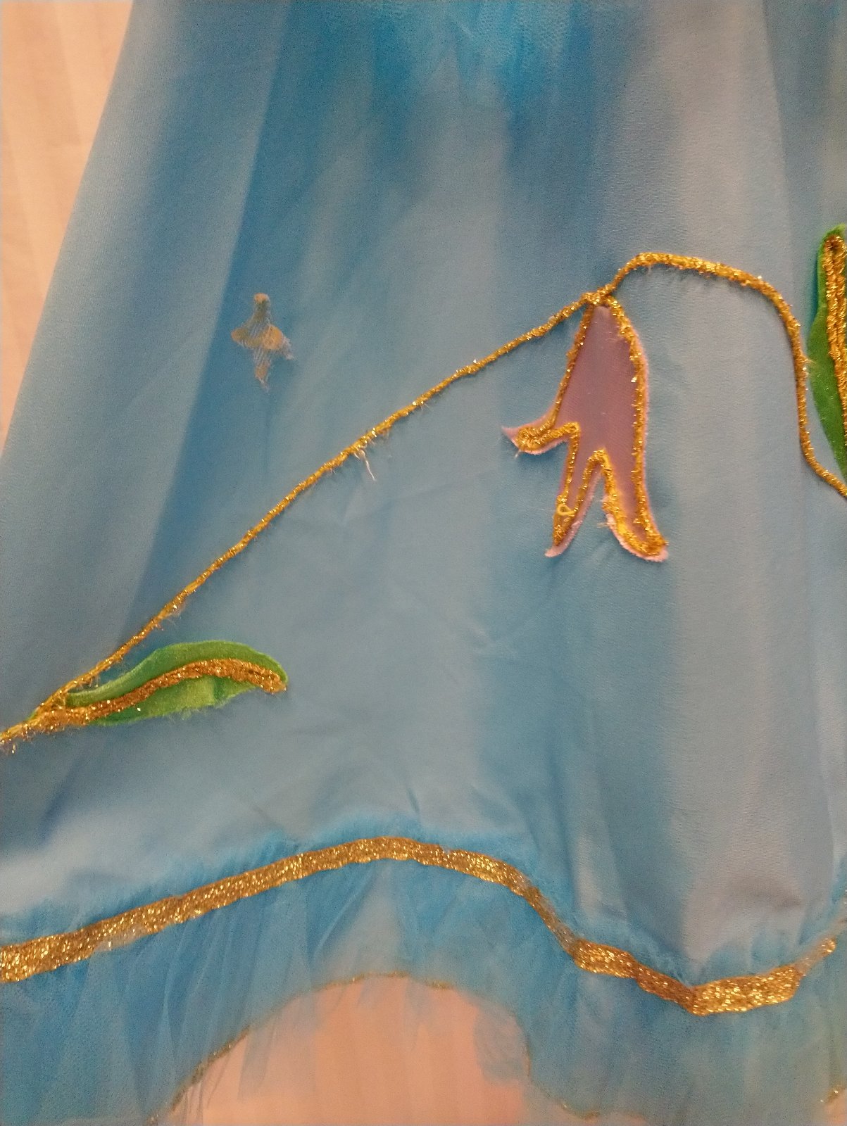 kostým Princezná, modro zlaté šaty, obsahuje krásne modré dlhé šaty, v páse na gumu, vzadu zapínanie na gombíky, ozdobené kvetinami, zlatým lemovaním,