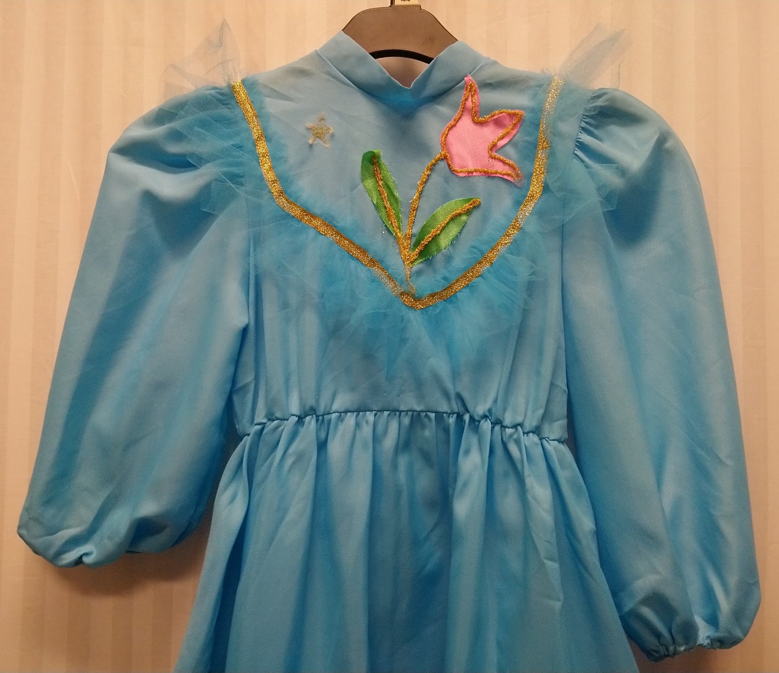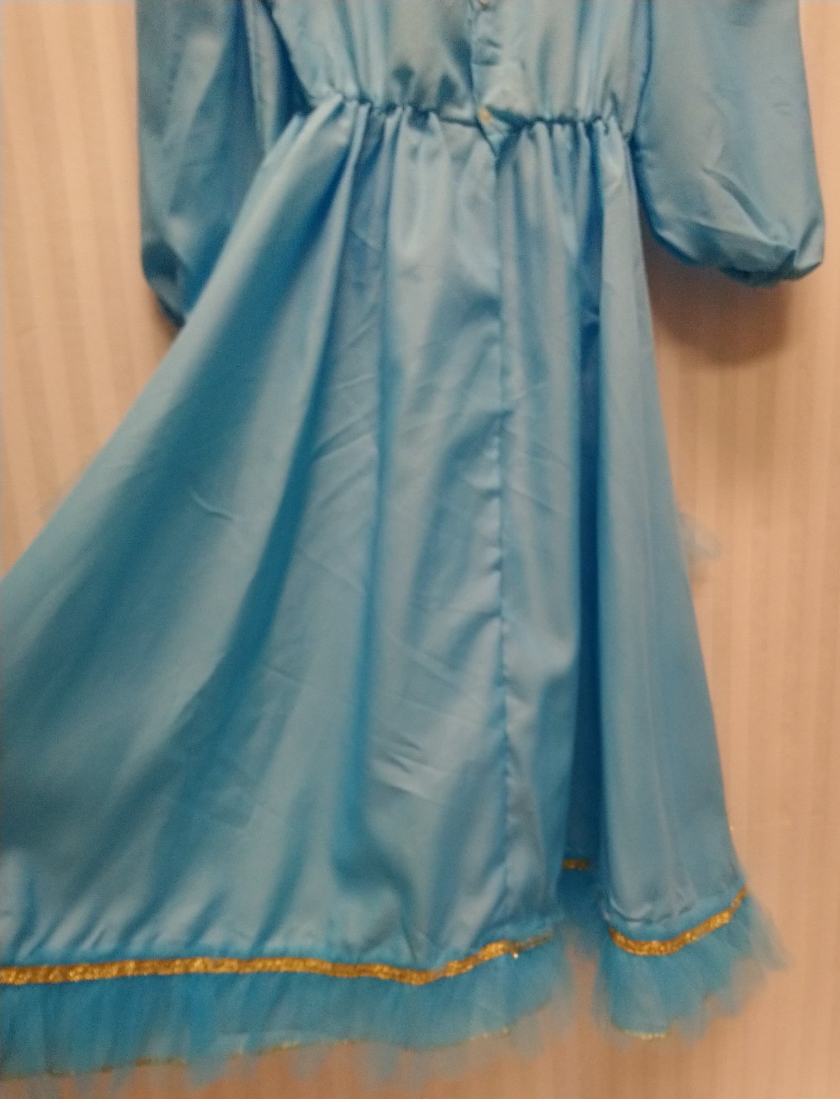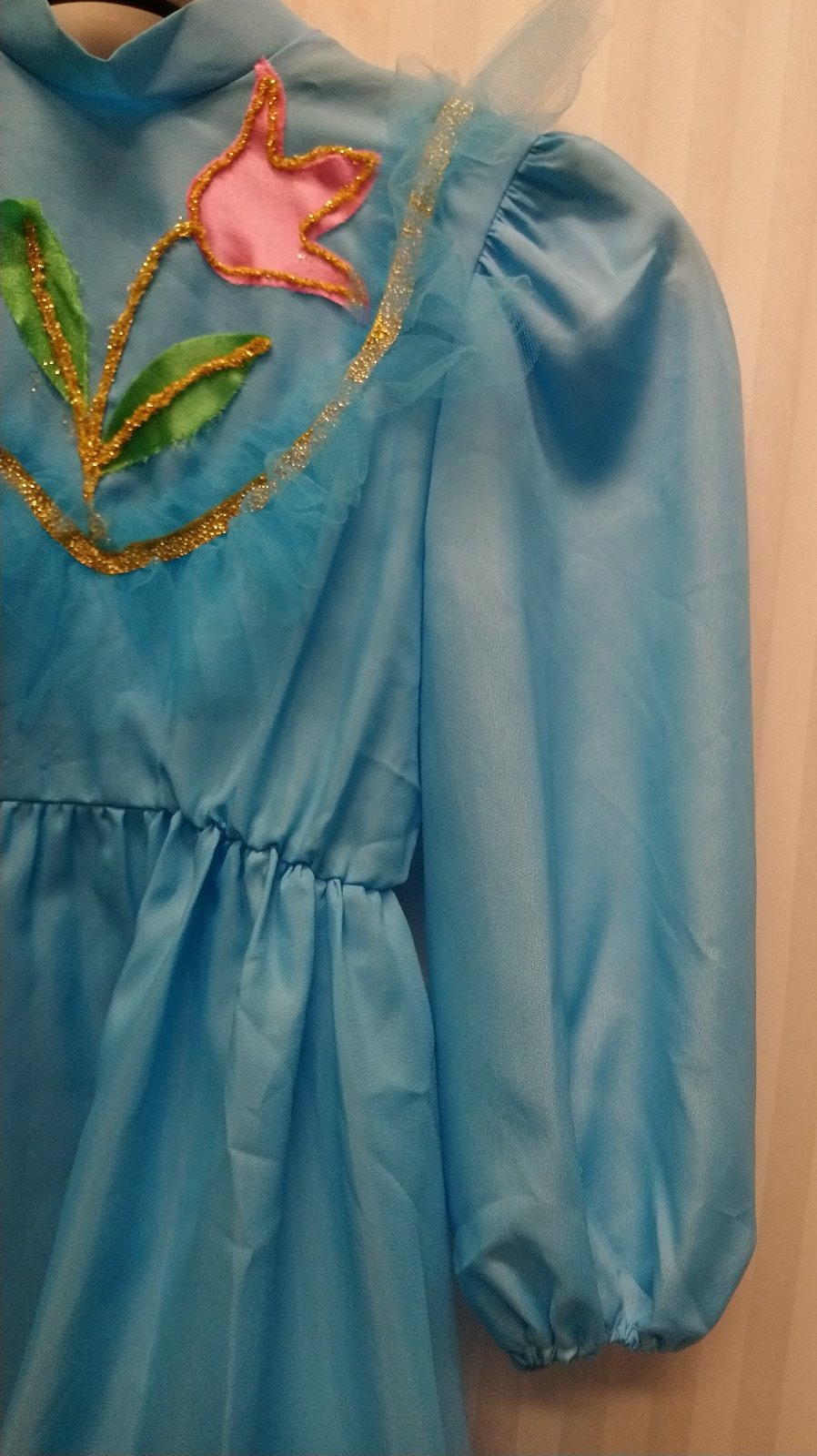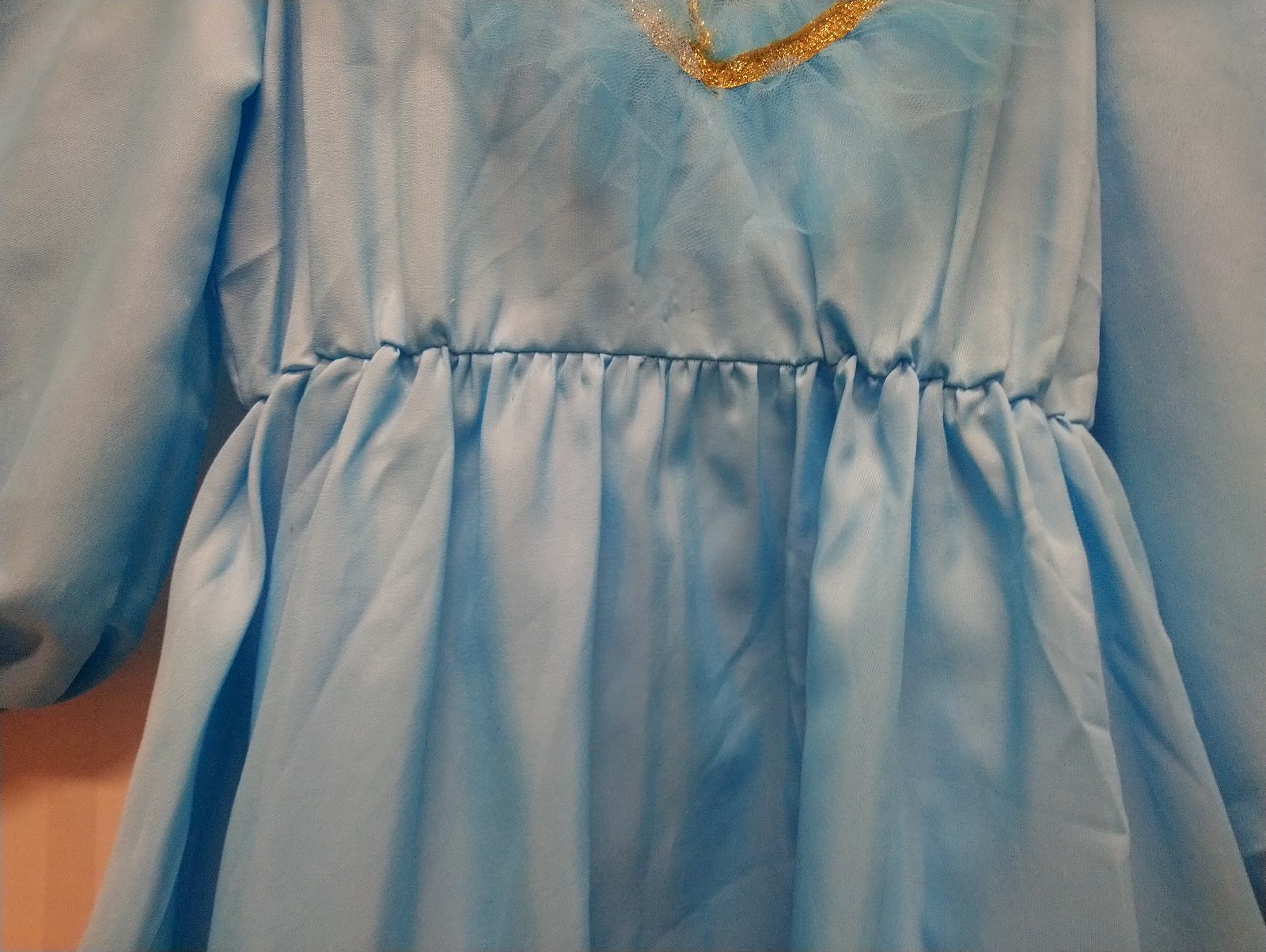 kostým Princezná, modro zlaté šaty, obsahuje krásne modré dlhé šaty, v páse na gumu, vzadu zapínanie na gombíky, ozdobené kvetinami, zlatým lemovaním,