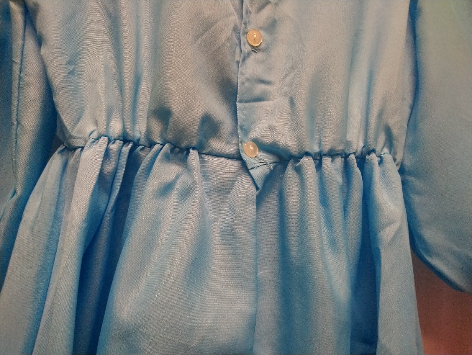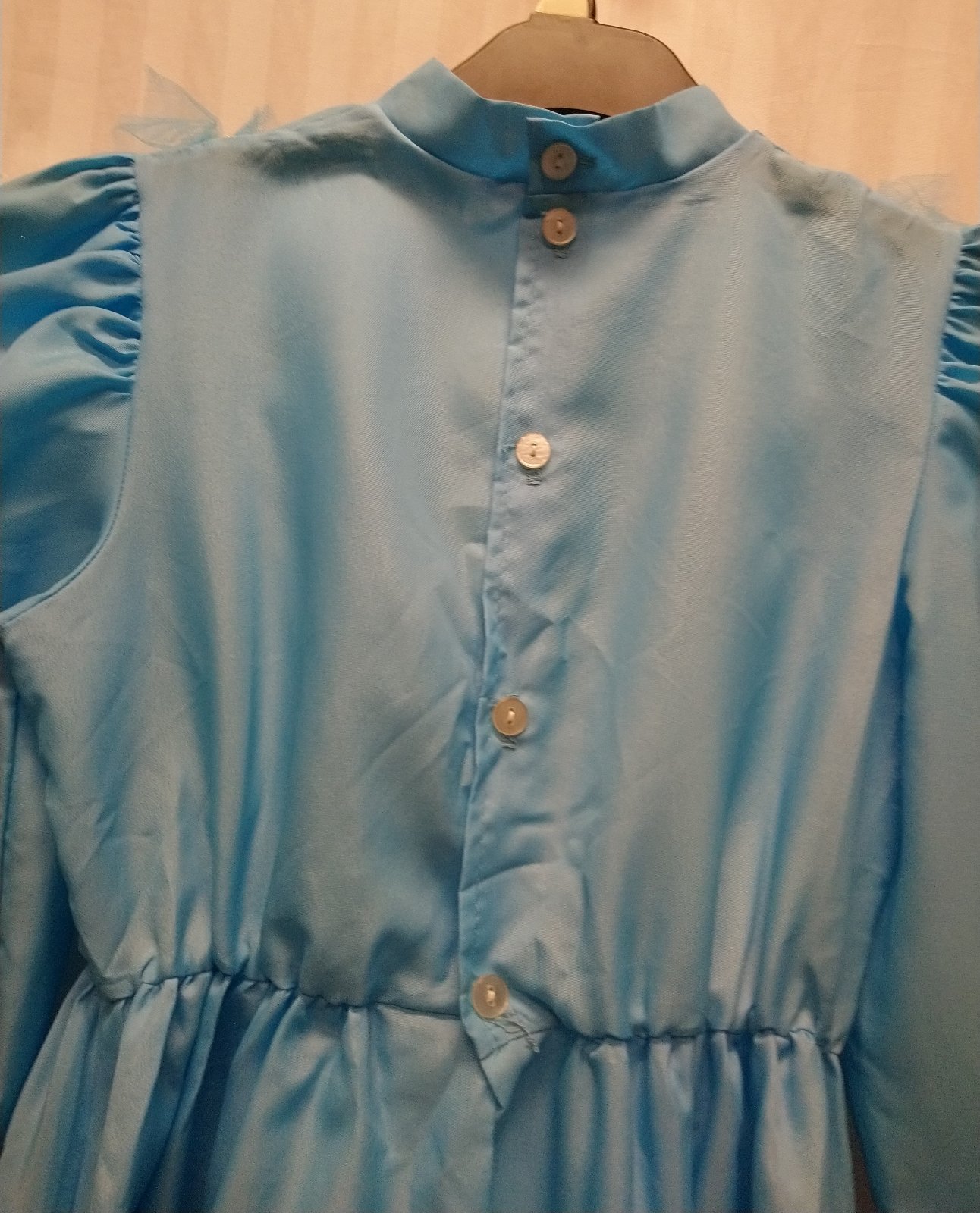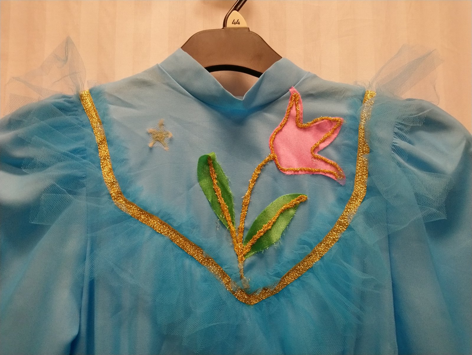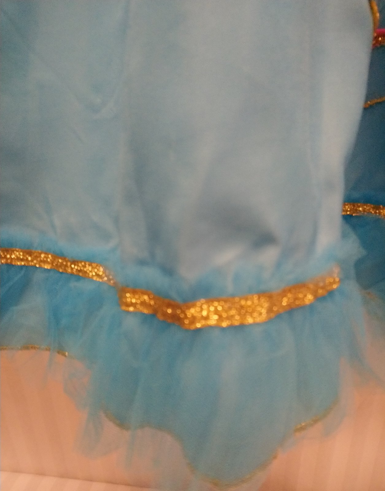 kostým Princezná, modro zlaté šaty, obsahuje krásne modré dlhé šaty, v páse na gumu, vzadu zapínanie na gombíky, ozdobené kvetinami, zlatým lemovaním,