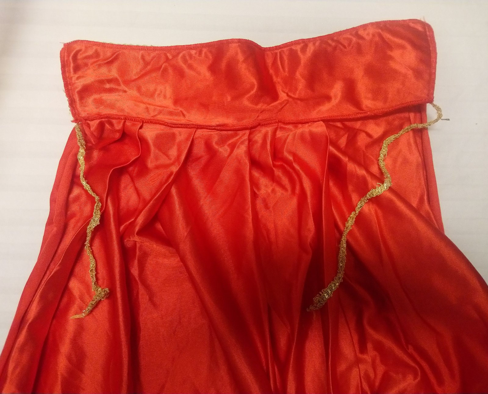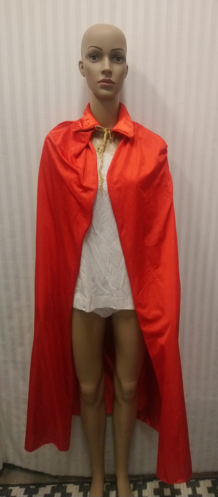 Kostým Červený plášť s golierom, uni obsahuje žiarivo červený plášť s golierom, ktorý má zlaté stužkové lemovanie, ktoré prechádza do zaväzovania pri krku,