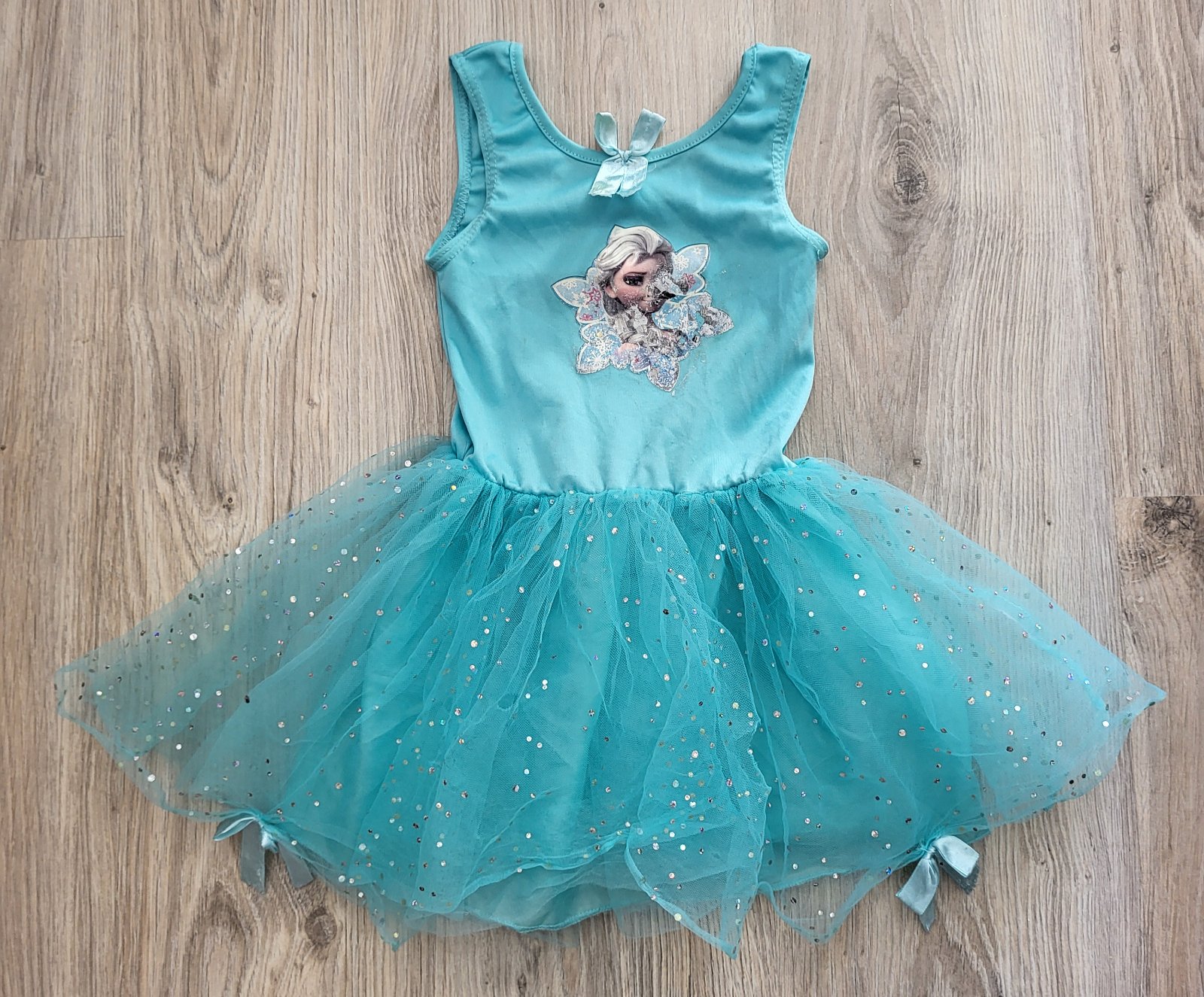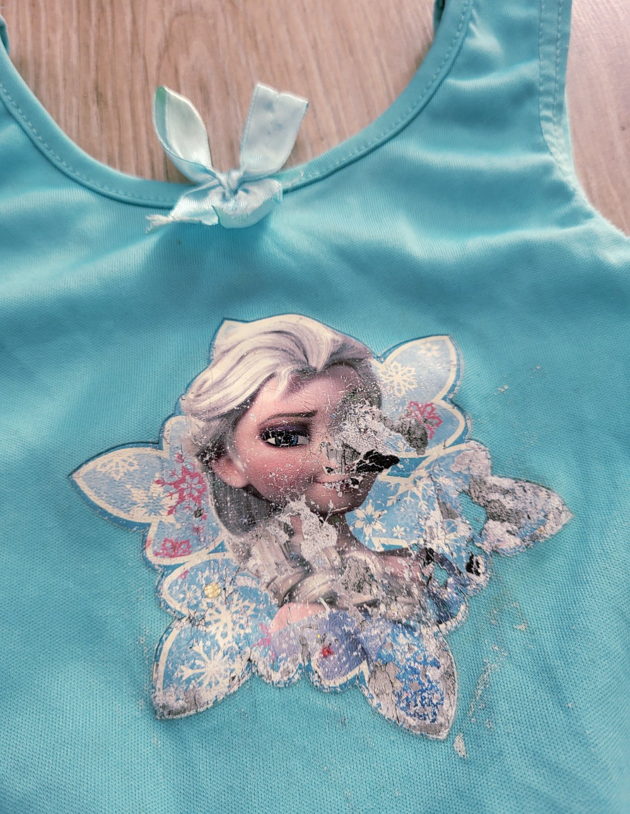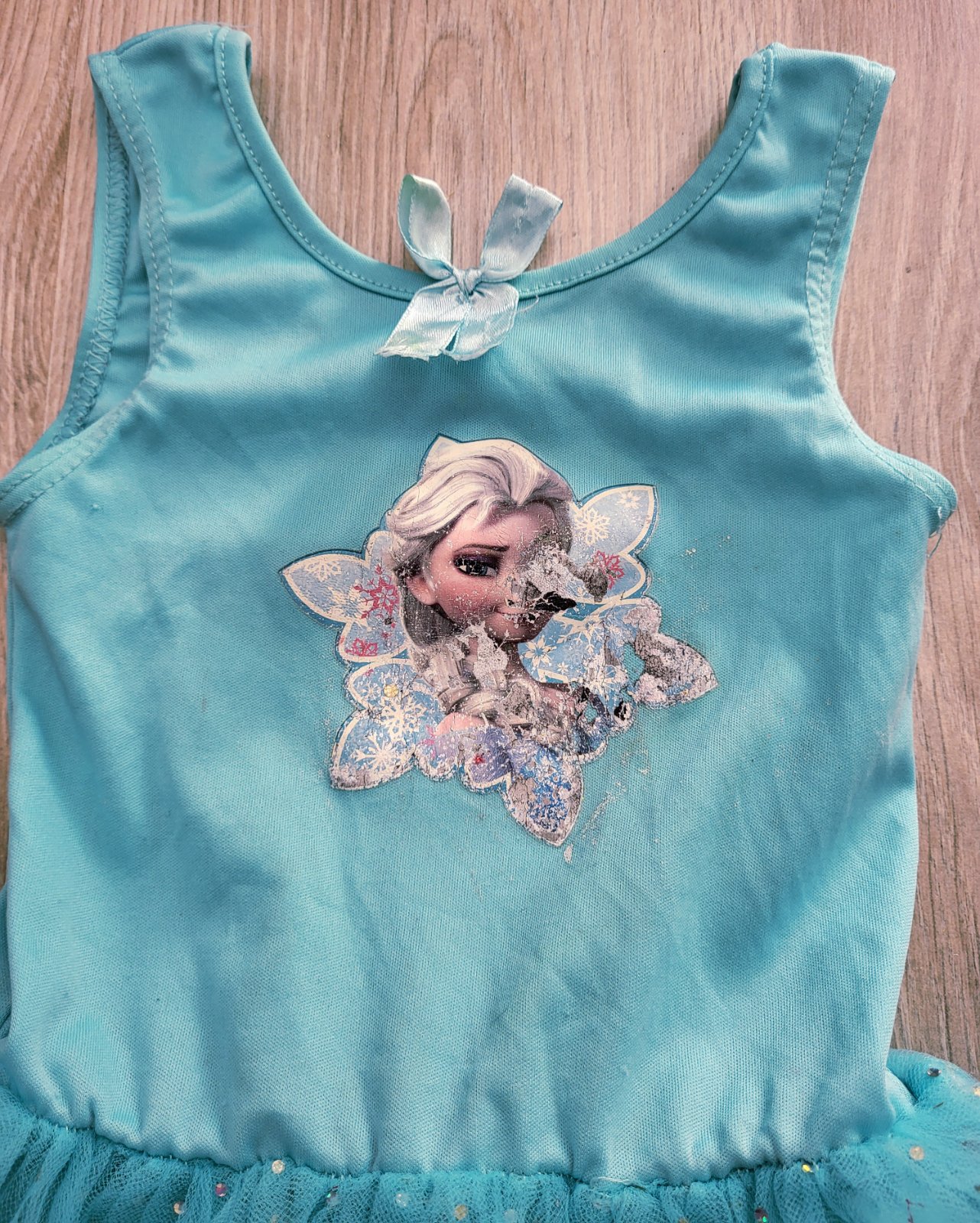dobrý stav, poškodená potlač Elzy na hrudi, potlač je prenesená na chrbát, miestami roztrhaný tyl na sukňovej časti-viď detail, miestami zatiahnutia v látke, pošlem buď poštou alebo packetou