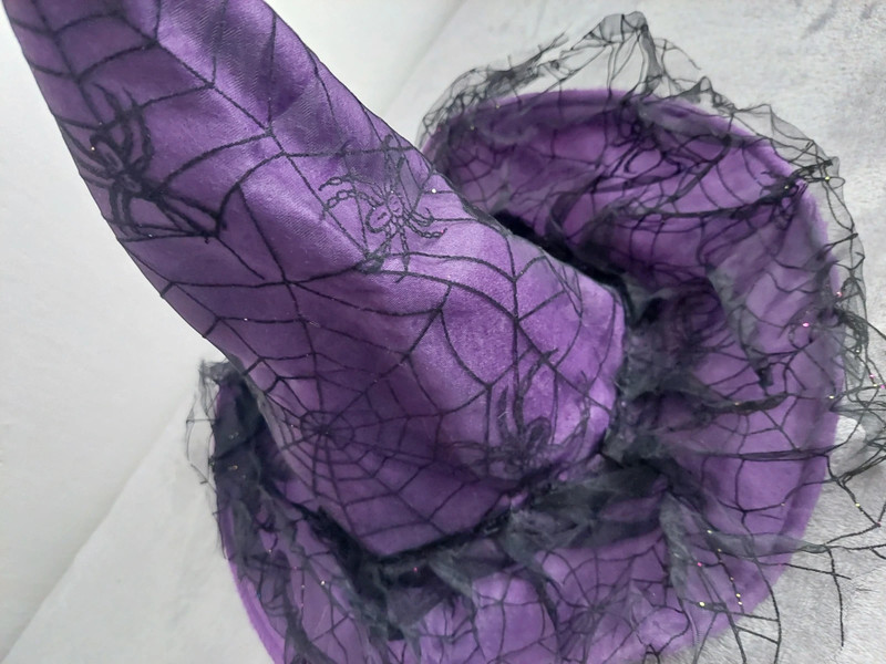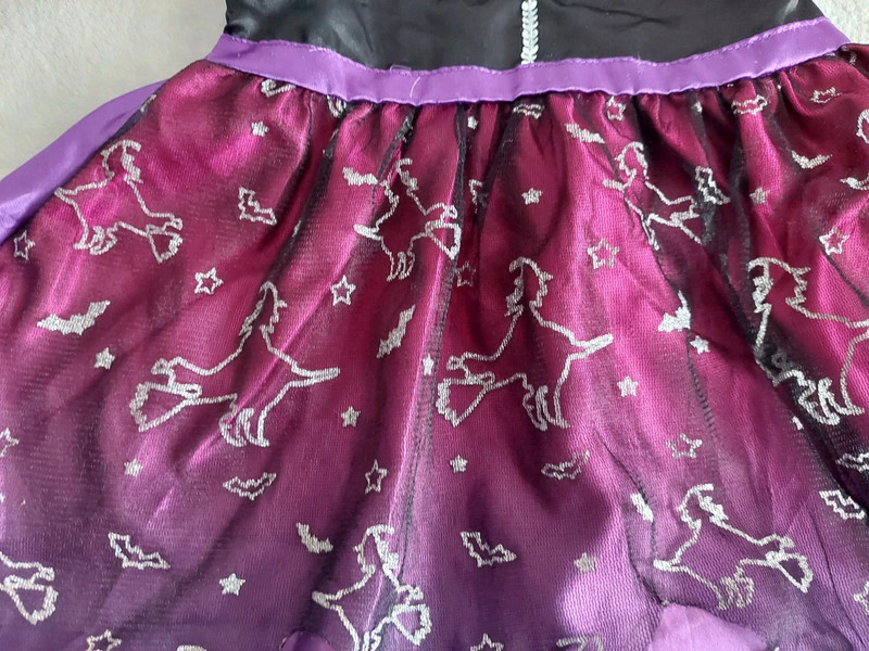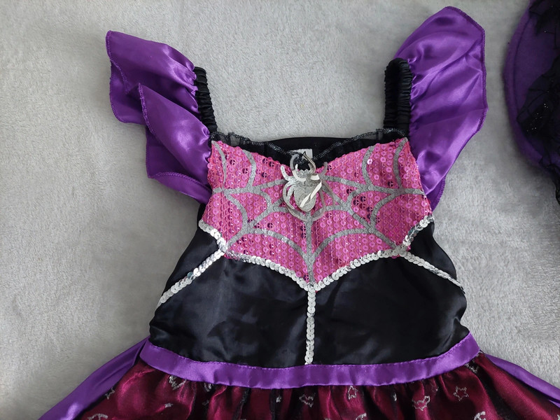 Stav: top stav, bez poškodení. Šaty + klobúčik. Mierne elastické, v páse guma. Deluxe klobúk z pevnejšieho fleesu zdobený organzou s motívom pavúčikov a pavučín.