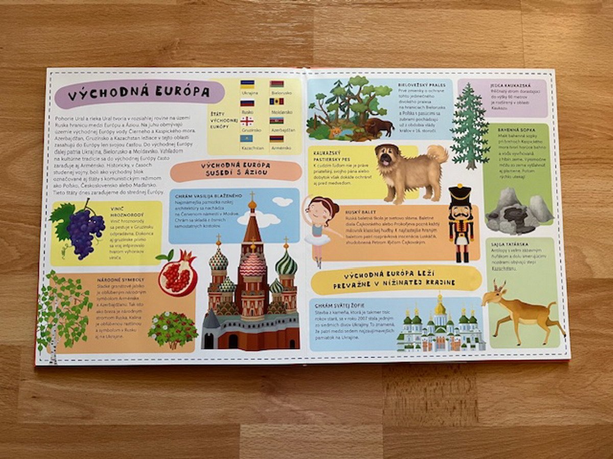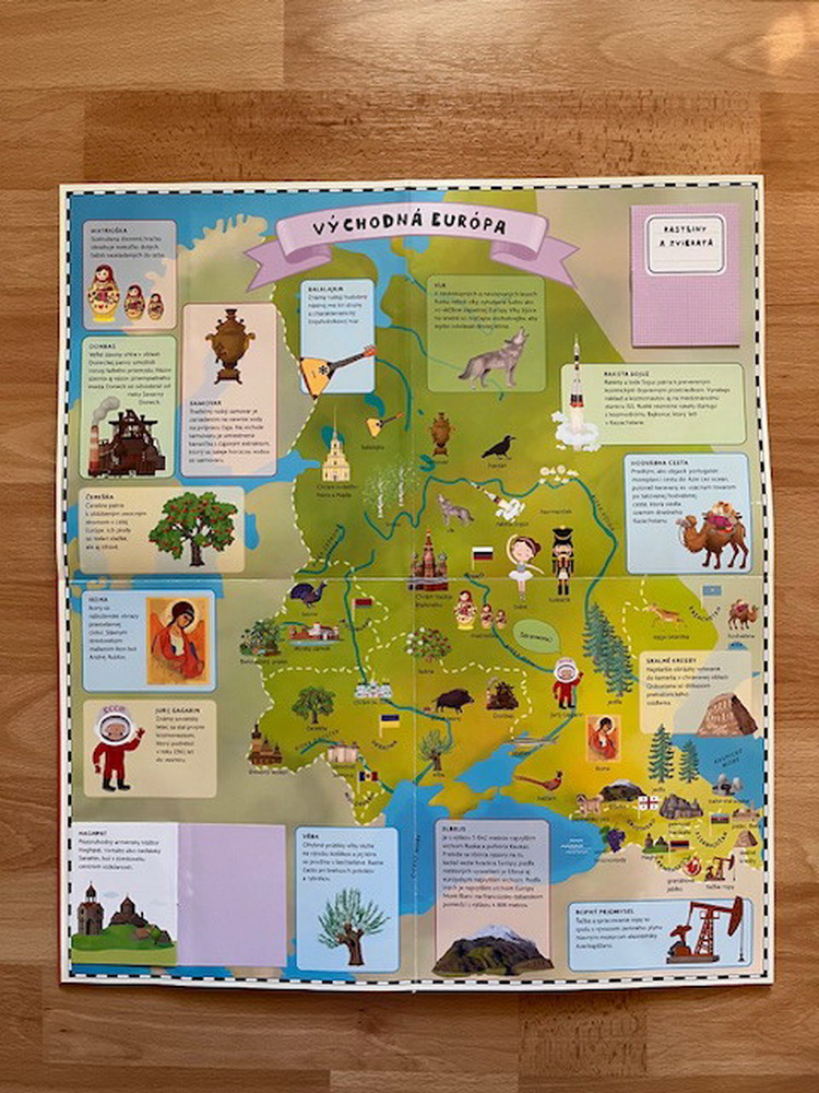 Atlas Európy pre deti v slovenskom jazyku - obsahuje 6 rozkladacích máp, európske stavby, zaujímavé osobnosti, rastliny a živočíchy