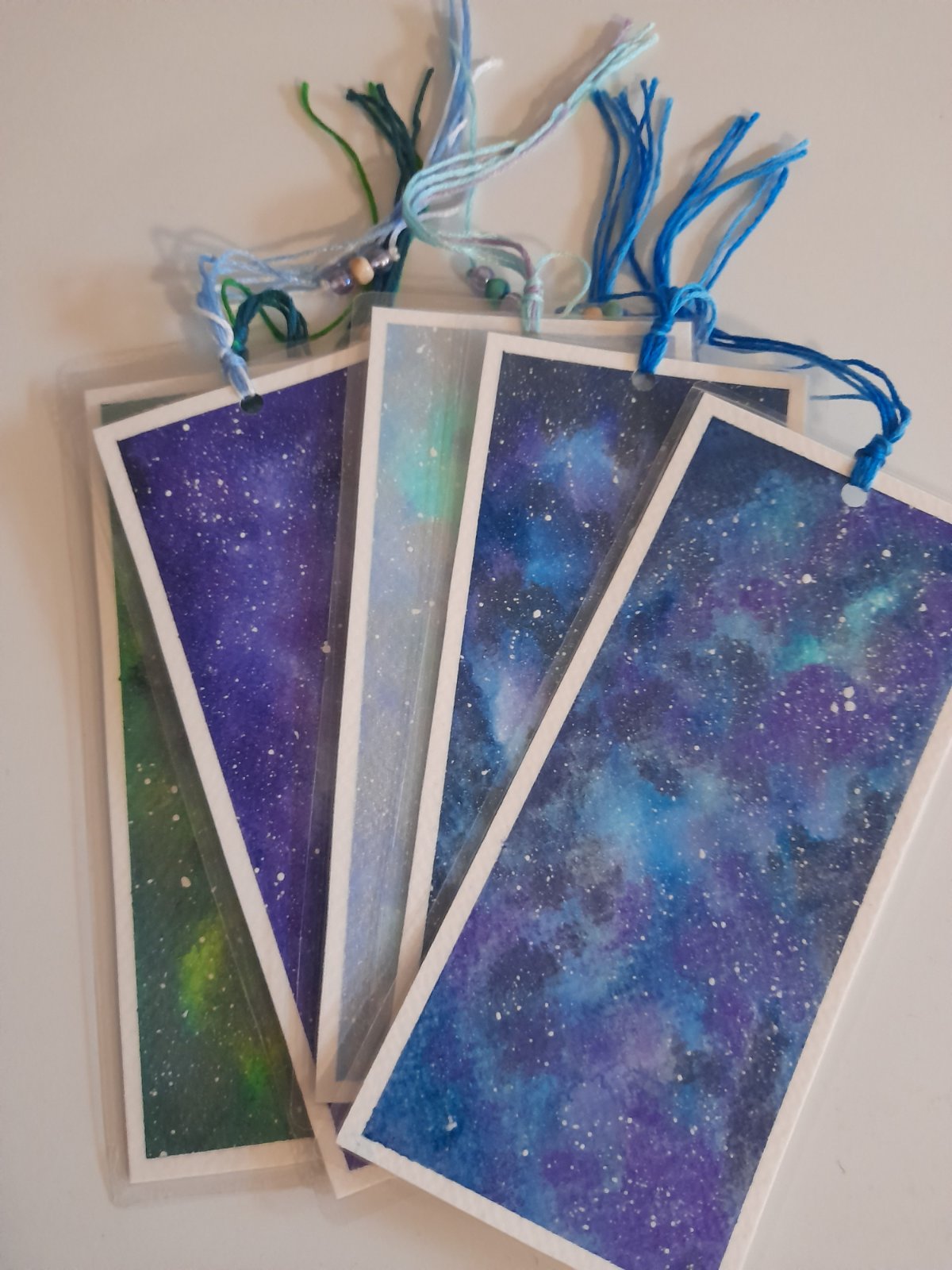 Handmade záložky do kníh. Každý kus originálna maľba akvarelom. Zalaminátované. Téma vesmír