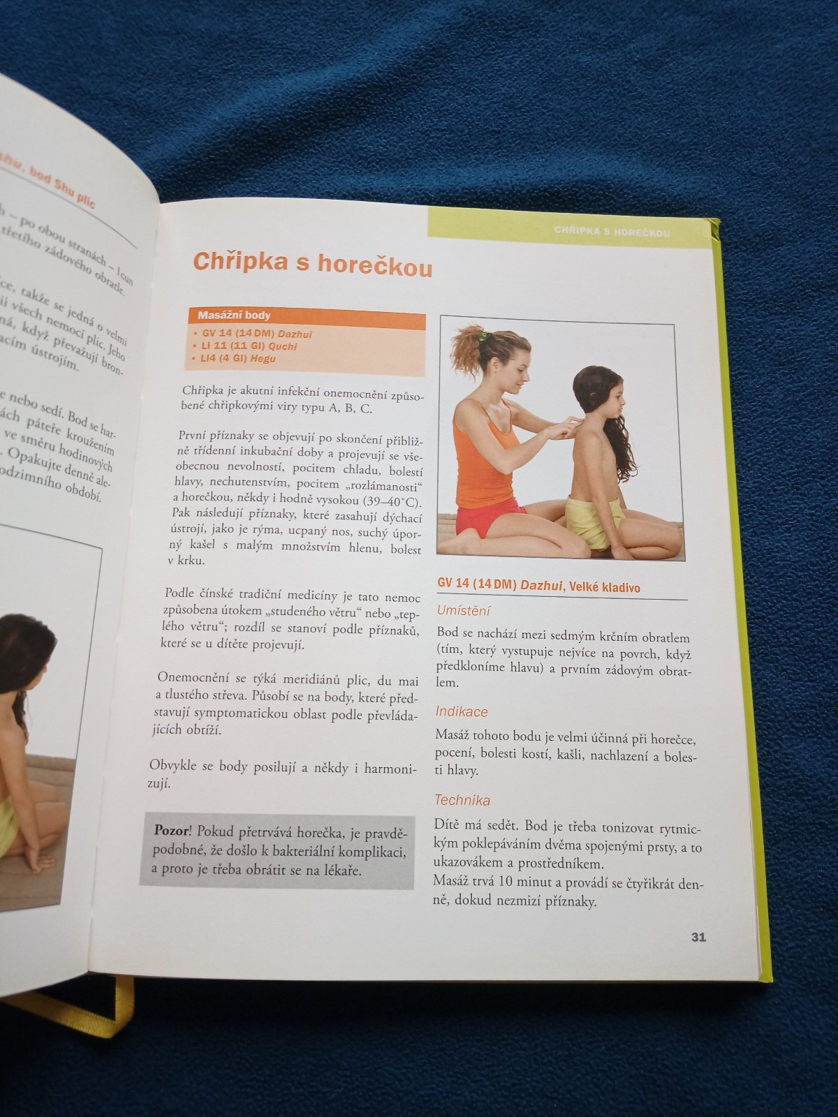 Praktický průvodce pro rodiče seznamuje s technikami léčení tlakem, pocházejícími z tradiční čínské medicíny. Techniky jsou účinné při zažívacích potížích, nechutenství, únavě, teplotách, inkontinenci, problémech se spánkem, při bolestech zubů, břicha a při kolikách, nevolnosti z jízdy, dýchacích potížích a mnoha dalších. Příručka má pomoci při některých potížích místo užívání léků. Po obecném seznámení s technikami jsou uváděny jednotlivé obtíže, jejich popis podle západní i tradiční medicíny, umístění bodů, upřesnění (kdy, jak, kde, jak dlouho, jak často). Výklad je ilustrován barevnými fotografiemi. Autoři působí jako pediatři a odborníci na západní i východní techniky léčení, jsou konzultanty Světové zdravotnické organizace.Preklad: Veronika Matiášková
